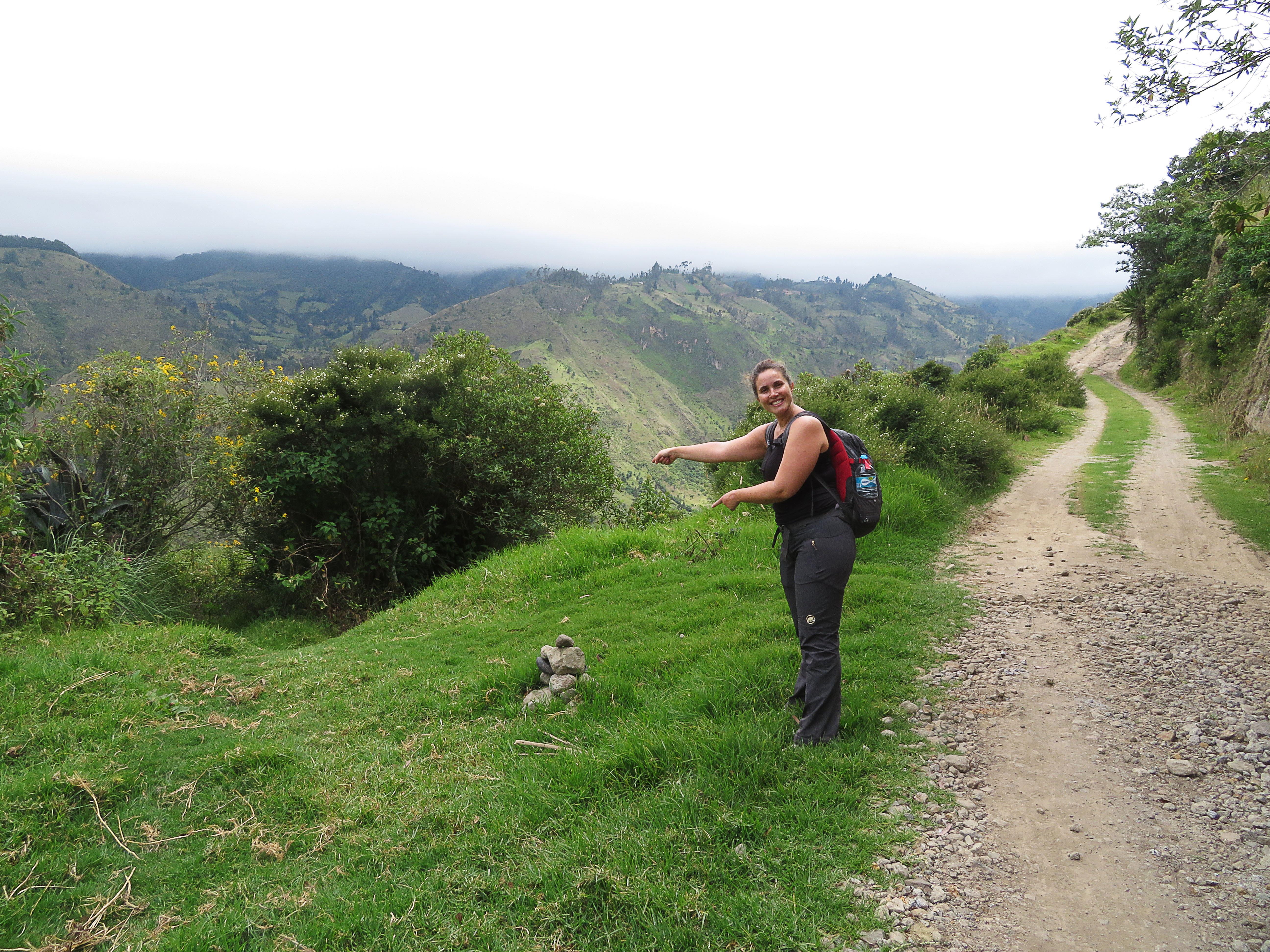 La première journée de marche étant légère, on ne quitte Latacunga en direction de Sigchos que vers 9h30. La route est vallonnée et le bus s’arrête tout le temps, faisant même ramassage scolaire sur la fin, de sorte que c’est vers midi qu’on atteint notre destination. Un petit almuerzo au village pour prendre des forces, et en route, sous un ciel assez couvert. Le début de la rando est tranquille, sur une piste qui descends doucement, rien de bien compliqué. Tellement pas compliqué qu’au bout d’une heure on se trouve au bout d’une impasse, la piste s’achève sur l’entrée d’une ferme, et rien d’autre. Personne aux alentours et maps.me est dans les choux, on n’a plus qu’à rebrousser chemin (juste après la première côte de la marche !).On finit par se retrouver : en fait il y a un piège, à peu près 4 kilomètres après Sigchos il faut quitter la piste principale bien visible et prendre un tout petit chemin quasi invisible qui plonge à flanc de montagne dans la végétation (il y a quand même un petit tas de pierre pour l’indiquer).