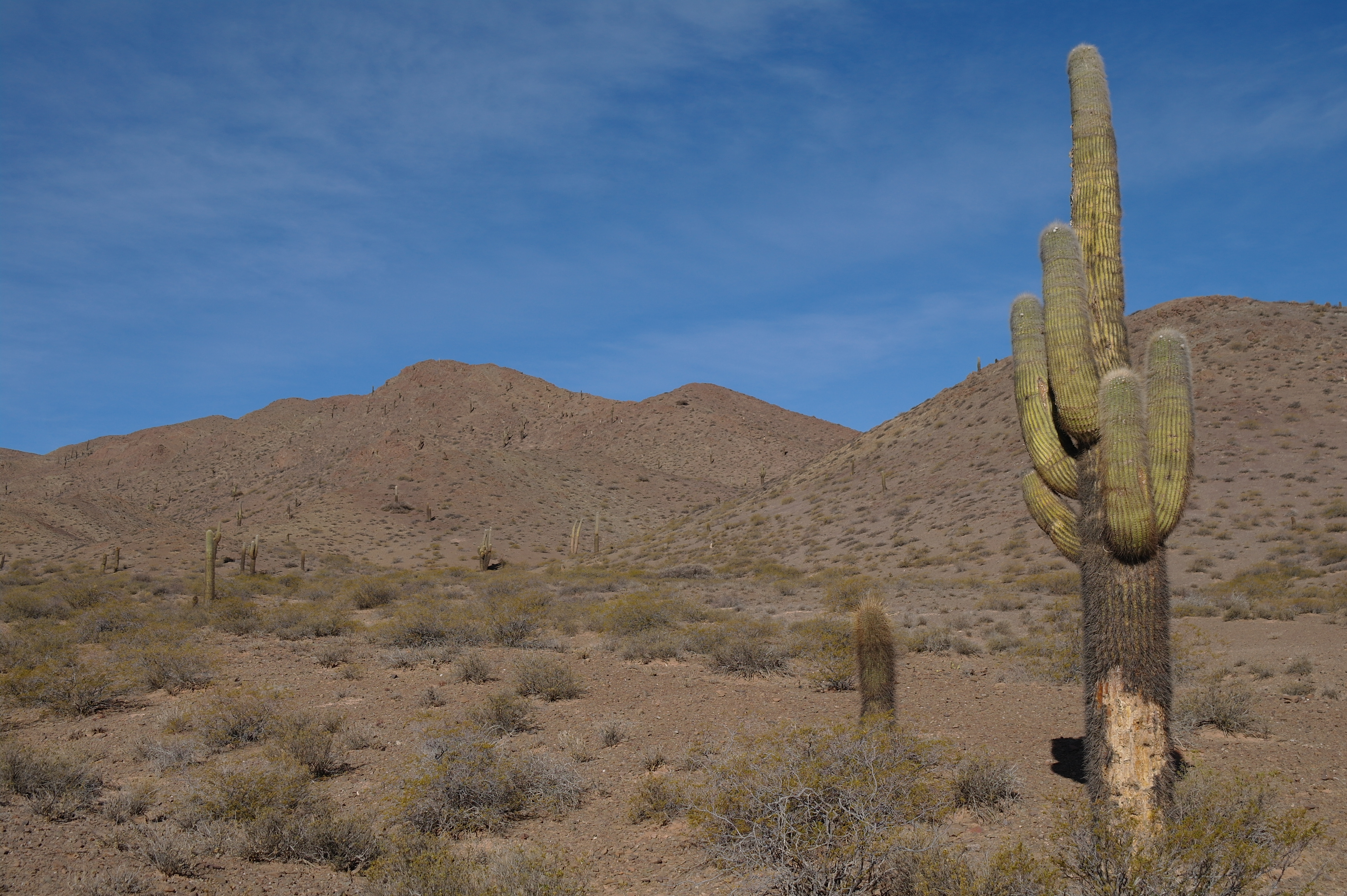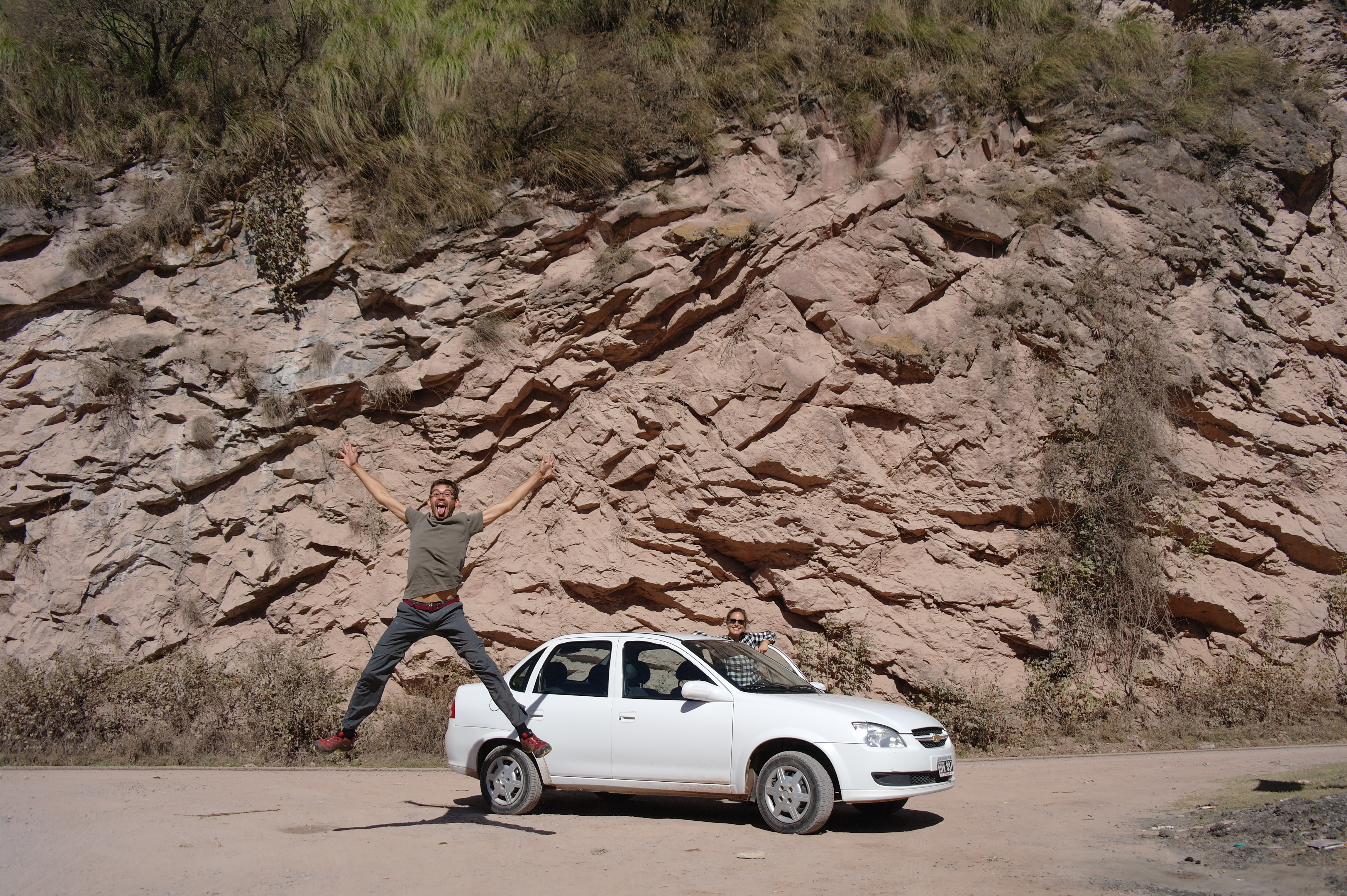 On part à l’assaut de la route 33 sous un temps magnifique et plein d’entrain. On est tout excités de se lancer à l’aventure dans notre petite chevrolet de location, à la découverte de cette région reculée. La route est sinueuse, en général non goudronnée (piste de cailloux), on découvre au fil des kilomètres quelques maisons isolées, mais sinon il n’y a personne ! La route traverse la forêt le long du rio Escoipe, puis on attaque l’ascension des montagnes. Au milieu des roches rouges et vertes, très belles, apparaissent bientôt, pour notre plus grand plaisir, les premiers cactus (les Cardones).