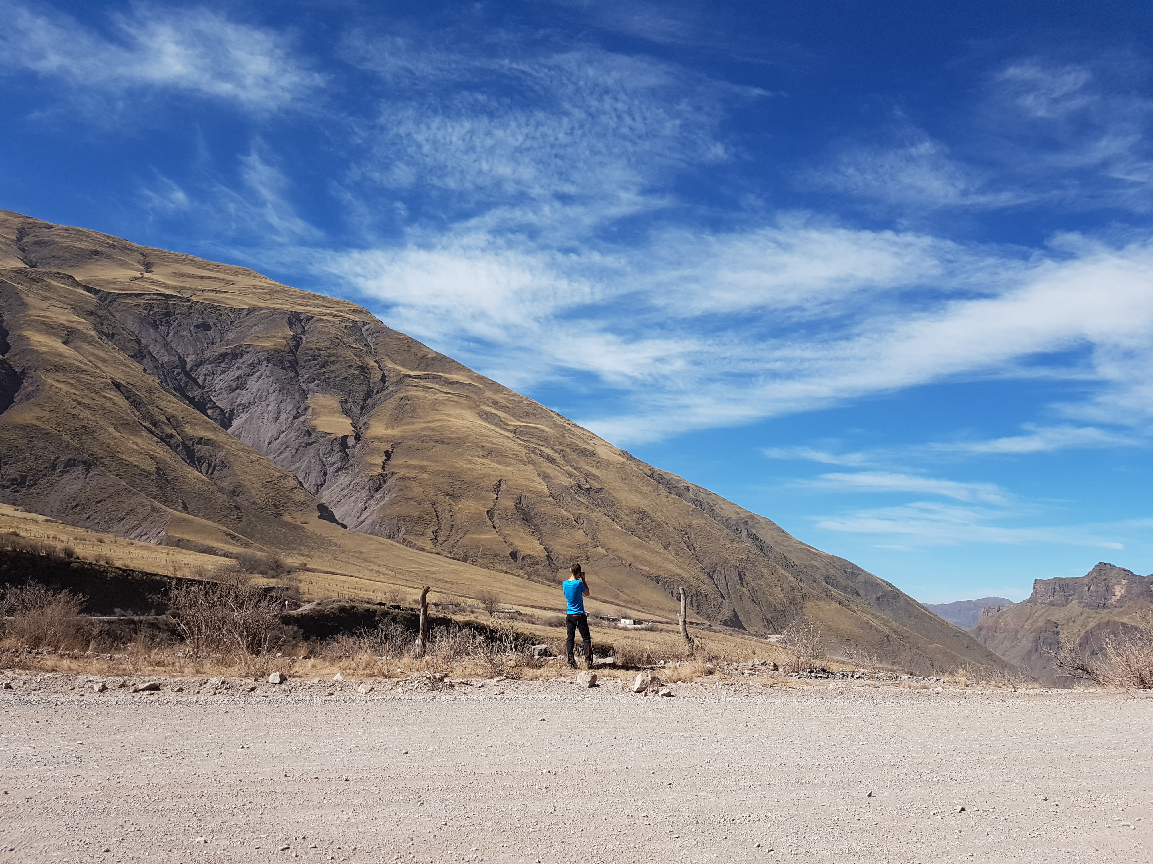 Après un petit tour de Cachi et un café en terrasse (Oui !!!! C’est un pays où on trouve des bons expresso !!), on reprend la route : direction le village de Molinos à 50 km plus au sud par la fameuse ruta 40. C’est une route nationale officiellement mais en fait c’est plutôt une piste de sable et cailloux défoncée sur laquelle on ne roule pas à plus de 40km/hr.