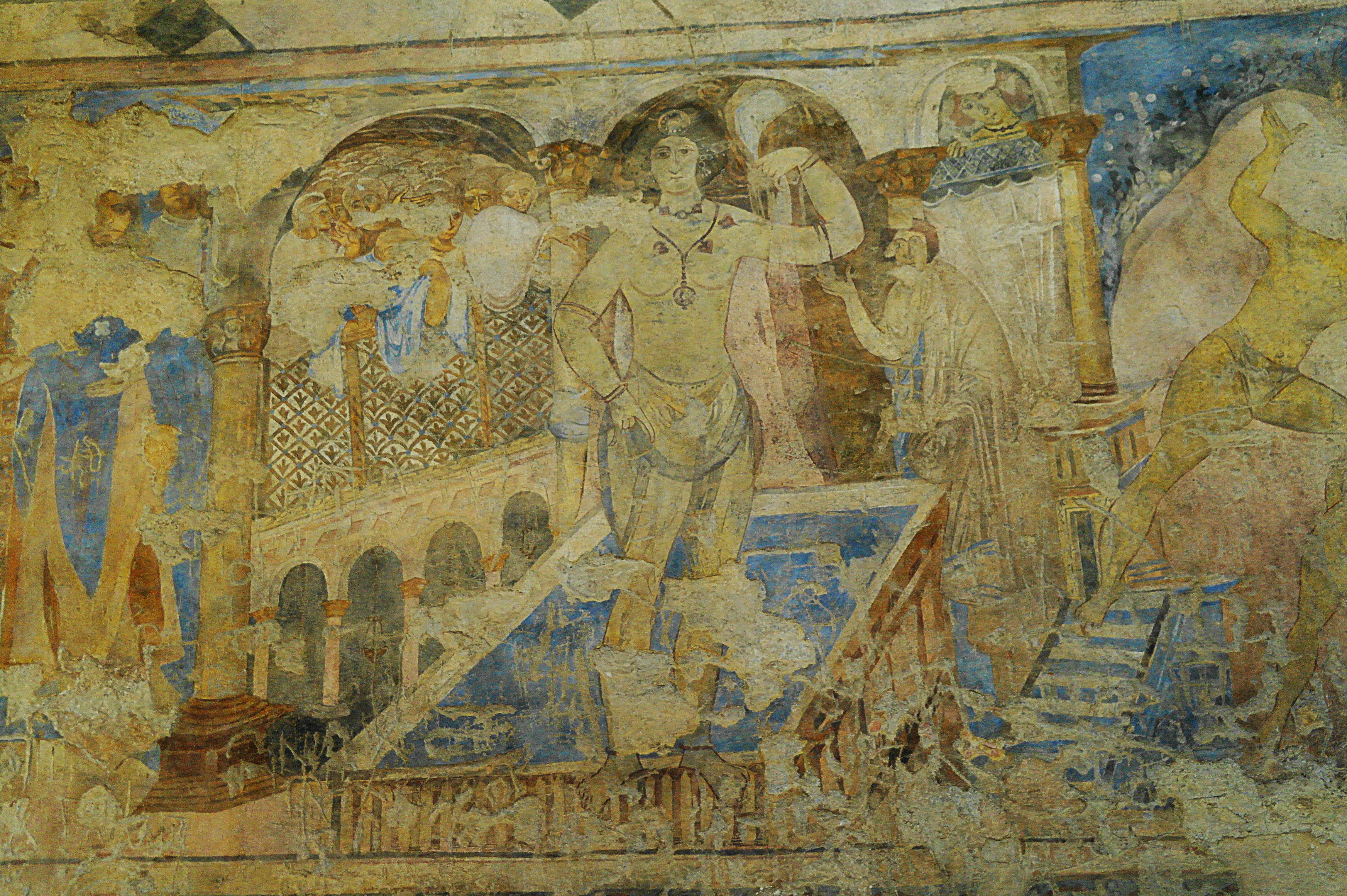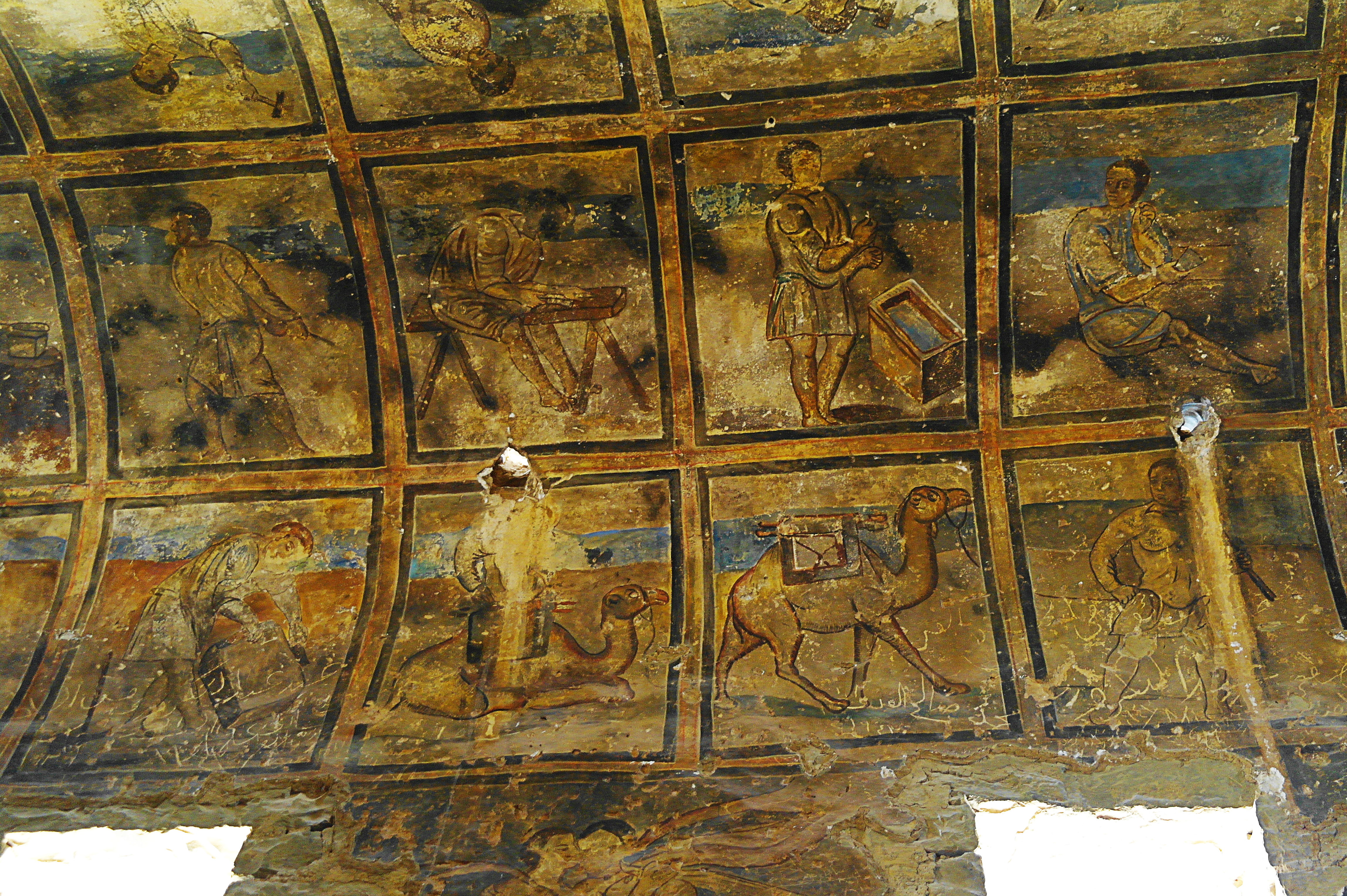 Le deuxième château, le Qusayr Amra, était une petite résidence « de vacances » pour les souverains Omeyyades qui venaient de Damas pour se ressourcer. L’intérêt principal de ce monument, ce sont ses fresques murales qui en décorent l’intérieur, et qui sont en cours de restauration. A en croire ces fresques, qui représentent ce qu’était la vie ici, quand il venait dans cette résidence le roi ne s’ennuyait pas : au milieu des scènes de chasse, de banquets et de baignade, on peut facilement repérer plusieurs scènes de « loisirs » classées X, sur lesquels le guide qui nous a accompagné pour la visite s’est fait un malin plaisir d’attirer notre attention ! Bref, c’était la débauche la plus complète !