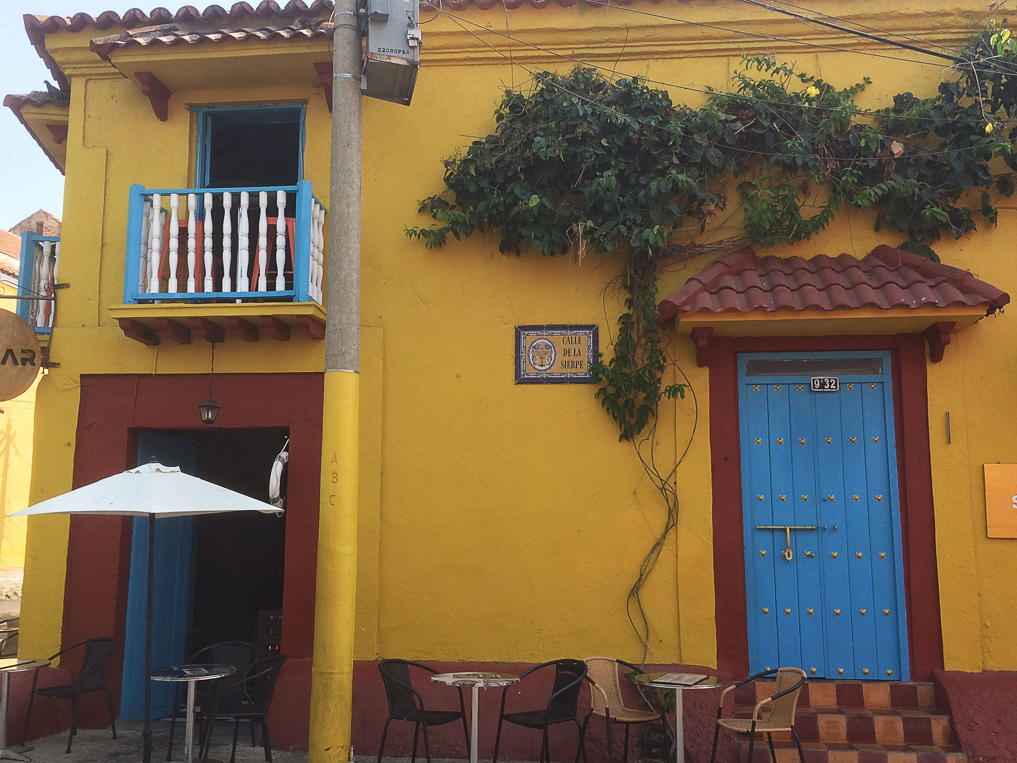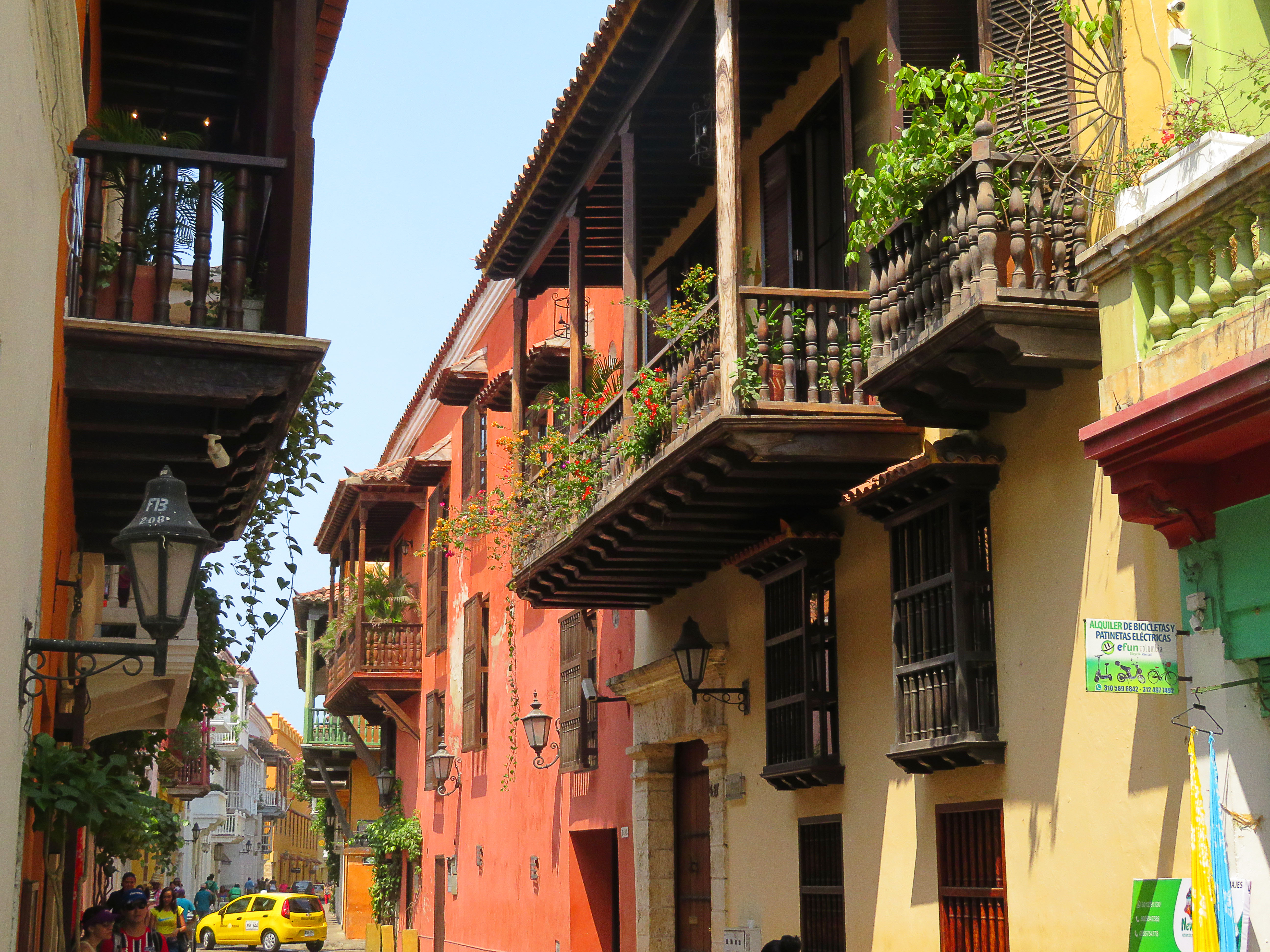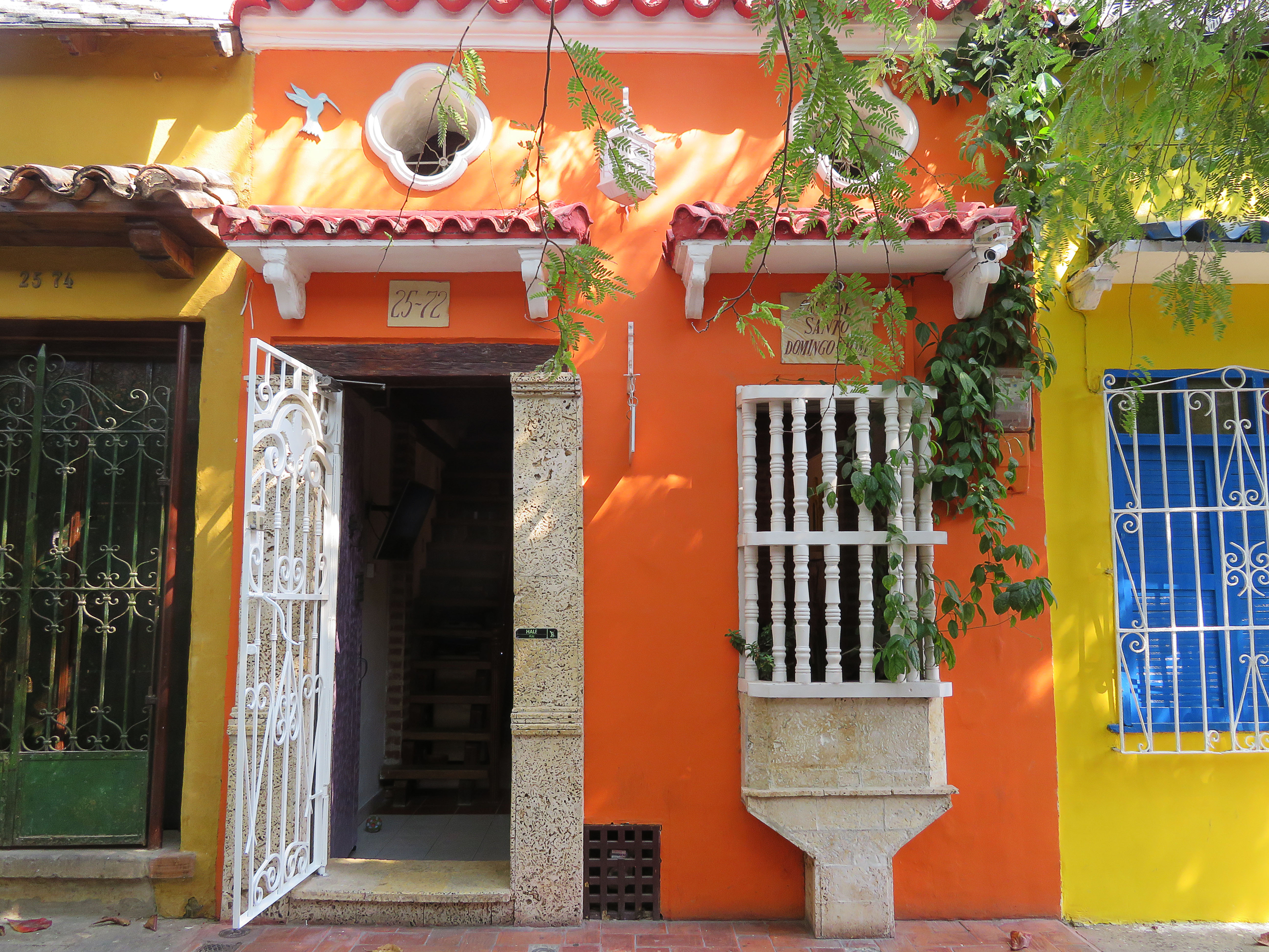 Le centre de Cartagena, c’est un ensemble de rues étroites aux façades colorées, dans toute une gamme de tons chauds, jaune, orange, ocre, que la lumière du soleil vient raviver. Et puis sur chaque maison ou presque, il y a des balcons en bois ouvragés, des portes massives avec un encadrement en pierre, et des fleurs, des plantes un peu partout…