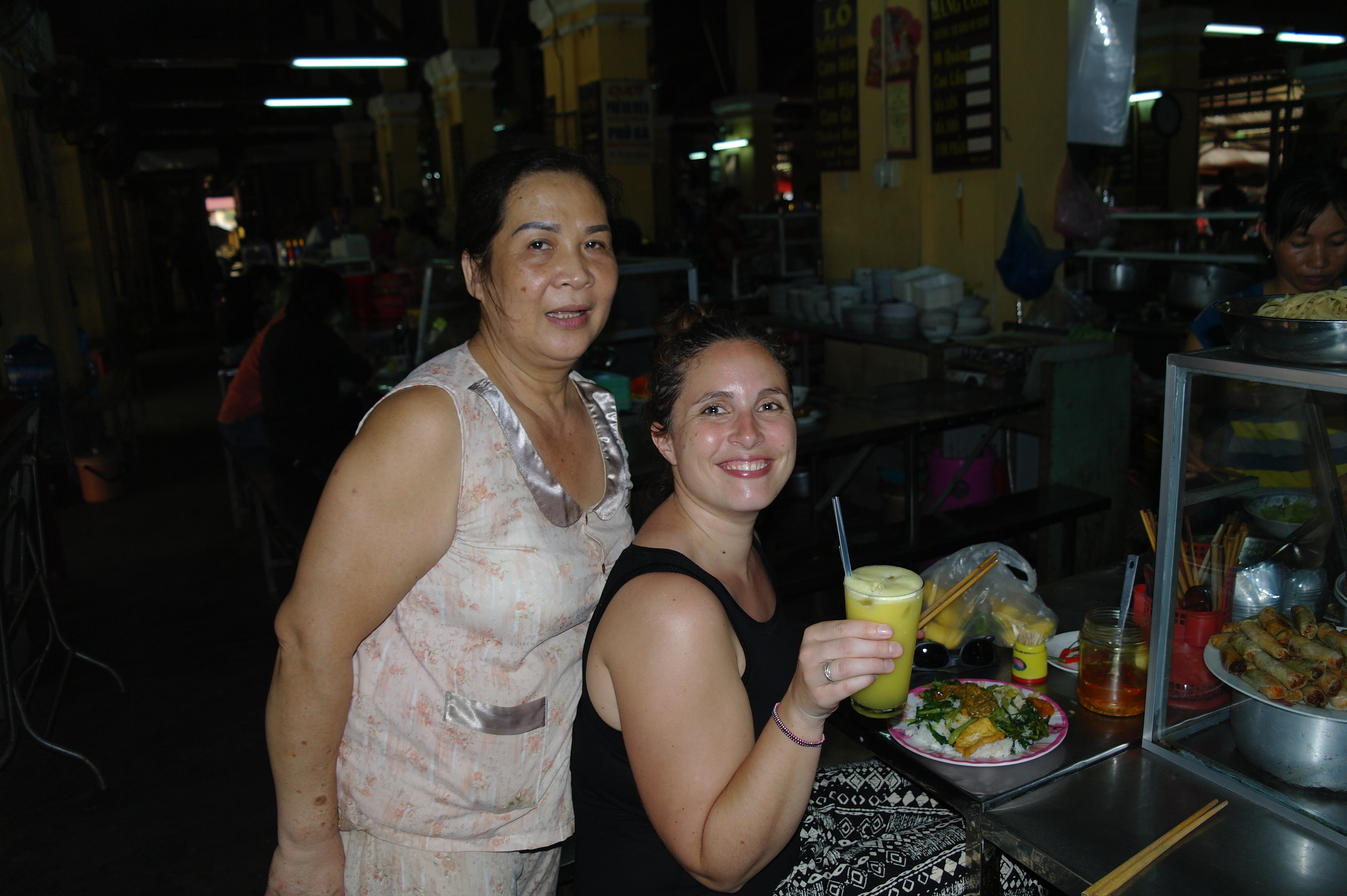 On prend notre temps pour déambuler dans la vieille ville pendant plusieurs jours pour mieux s’imprégner de son charme, et on prend vite nos habitudes. Le soir, on mange dans l’un ou l’autre des bouis-bouis qui bordent la rivière, et qui servent de délicieux Cao Lau et raviolis de crevettes, les spécialités locales. Le midi, on va au marché et on s’installe, au milieu des habitants, au comptoir de l’un des minuscules stands qui servent une cuisine rapide mais tout aussi délicieuse, qu’on accompagne d’un bon jus d’ananas pressé. Après trois midis à manger au même stand, l’accueil que nous réserve la patronne est triomphal (elle nous demande même de l’aider à attirer les clients) !