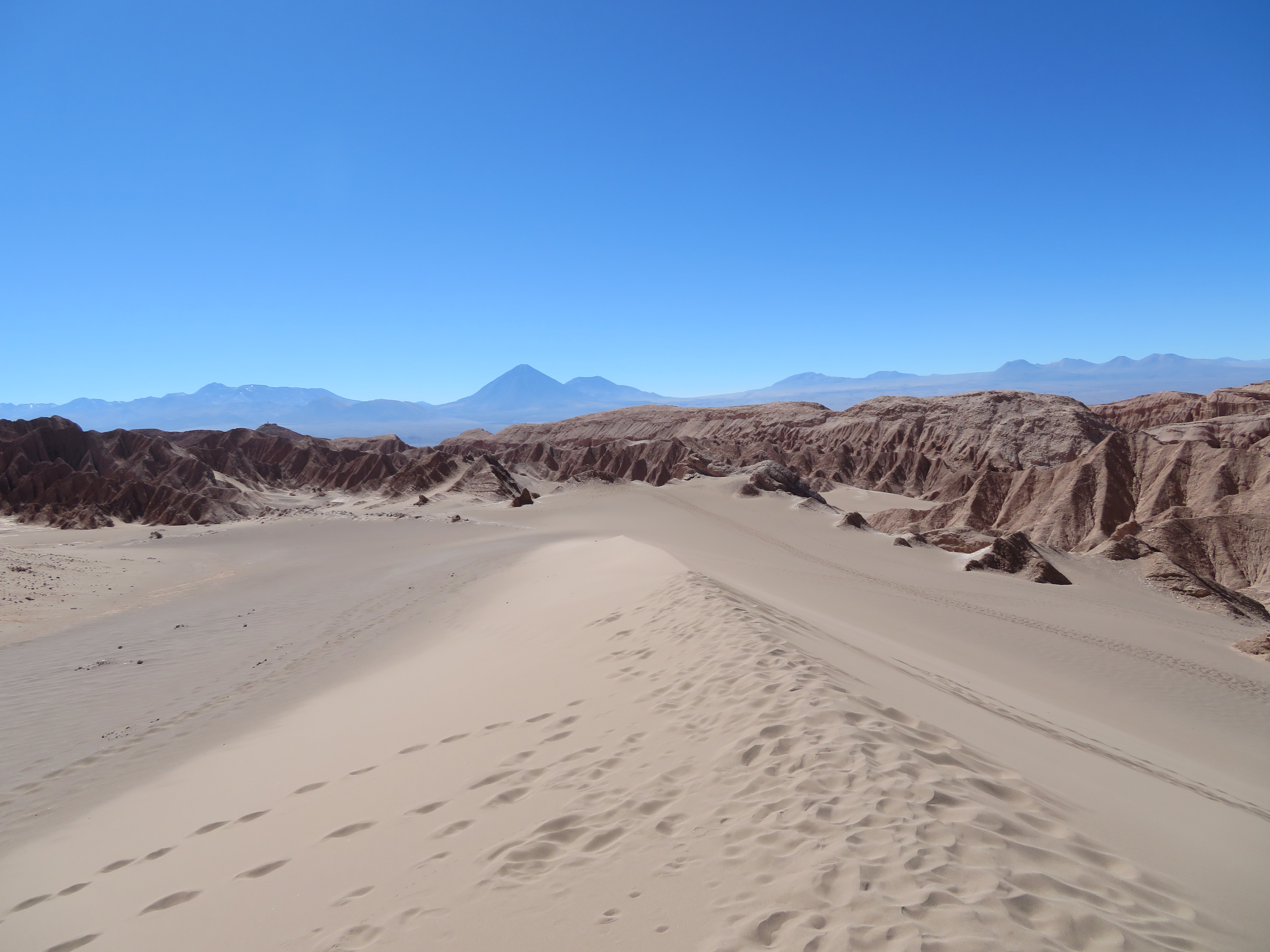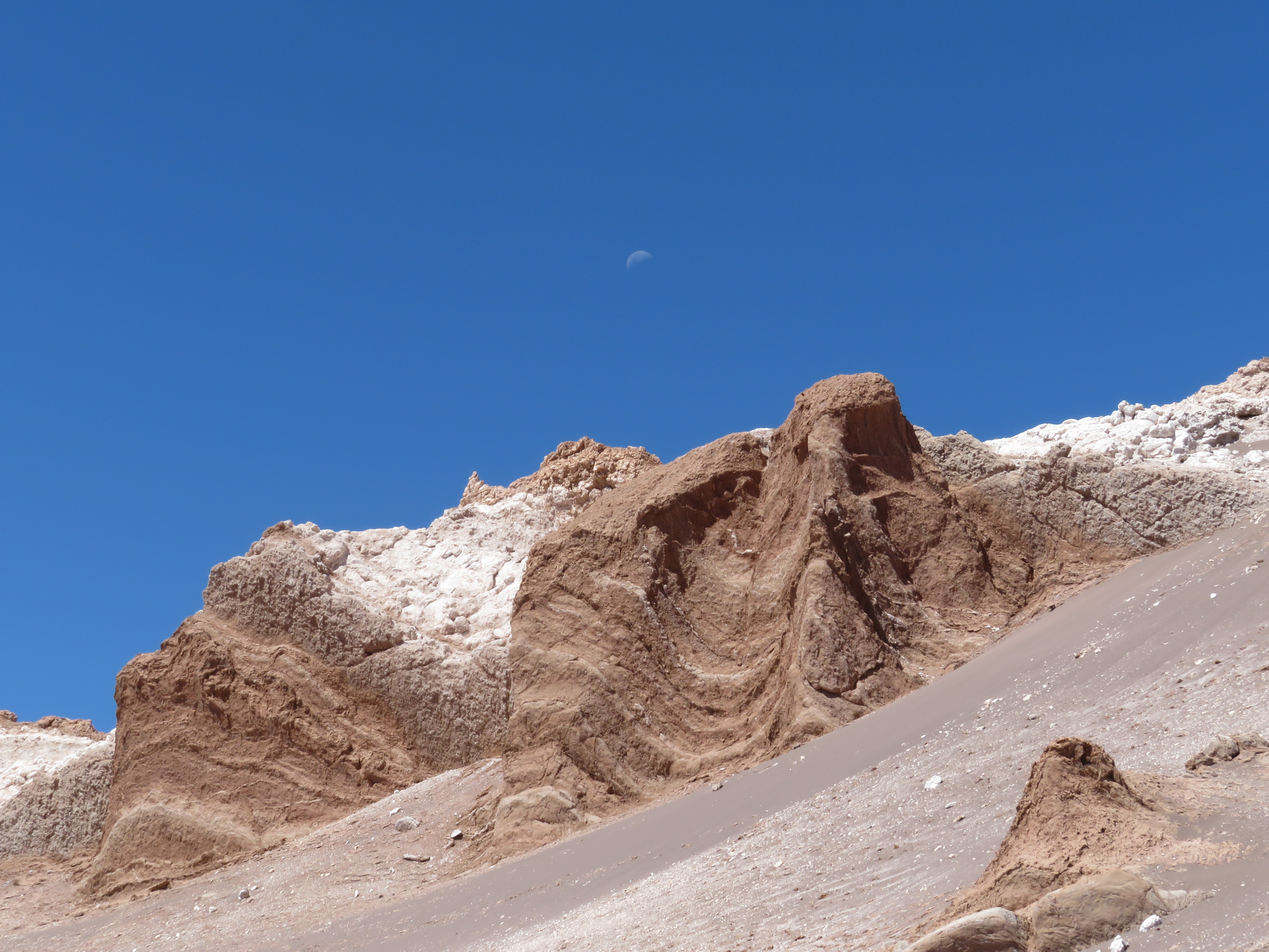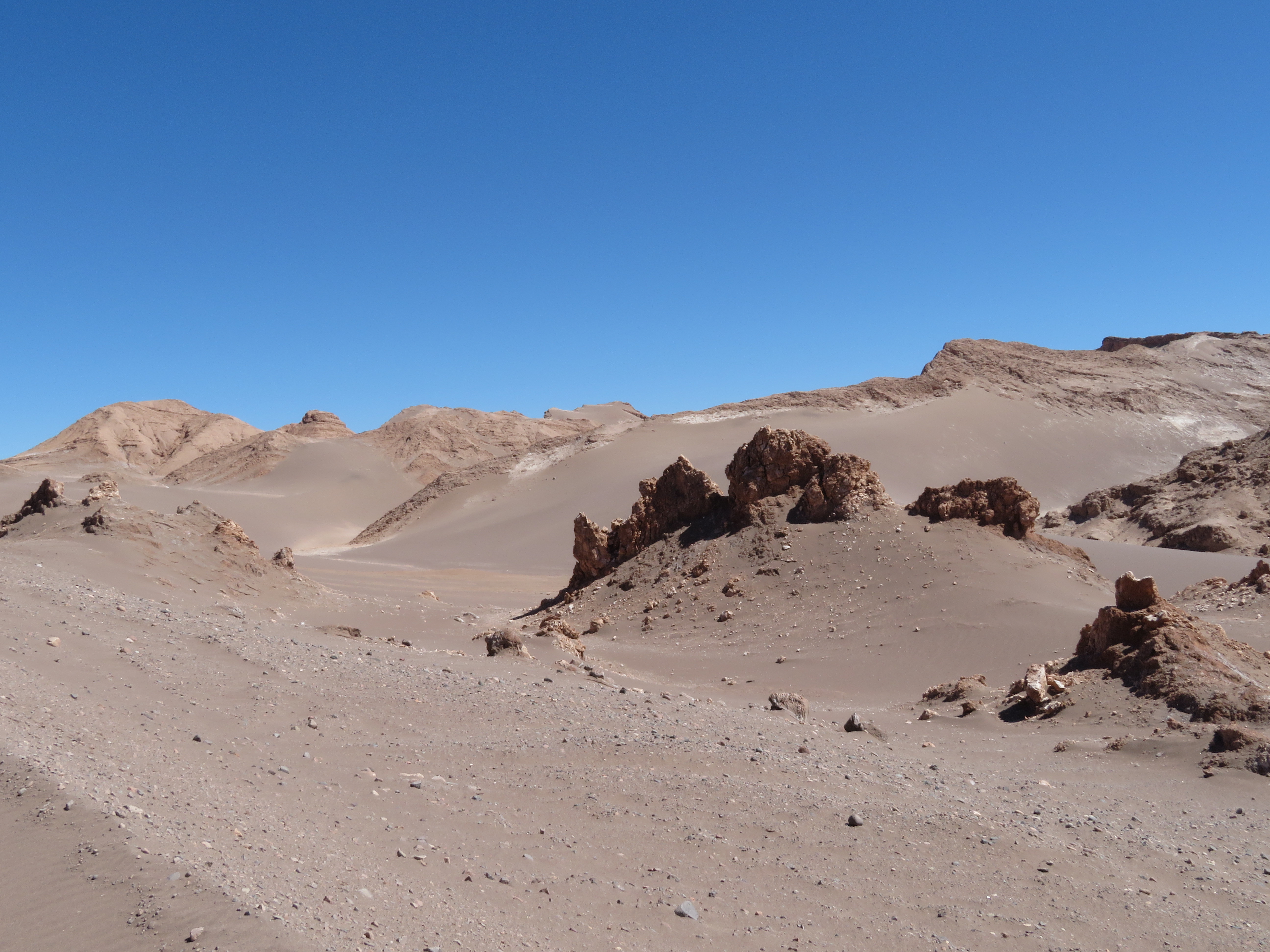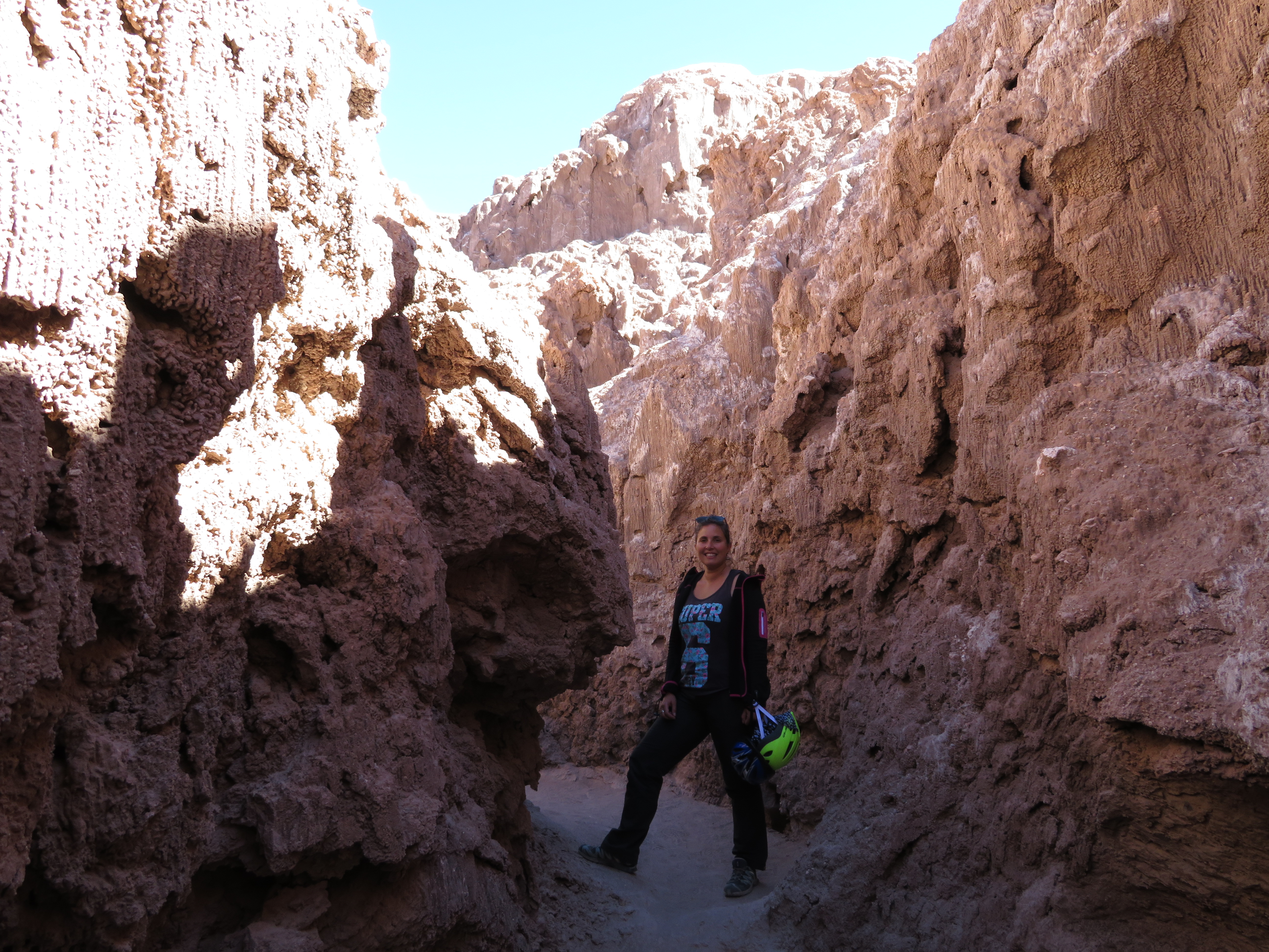 Pour notre part, on décide de se limiter aux sites les plus proches de San Pedro, accessibles à vélo. On consacre donc une première journée à l’exploration de la vallée de la lune, étonnantes gorges où se succèdent les formations rocheuses, cristallisées par le sel, et les dunes de sables. A vélo, ça se fait bien, enfin surtout le retour, car à l’aller ça grimpe un peu quand même !