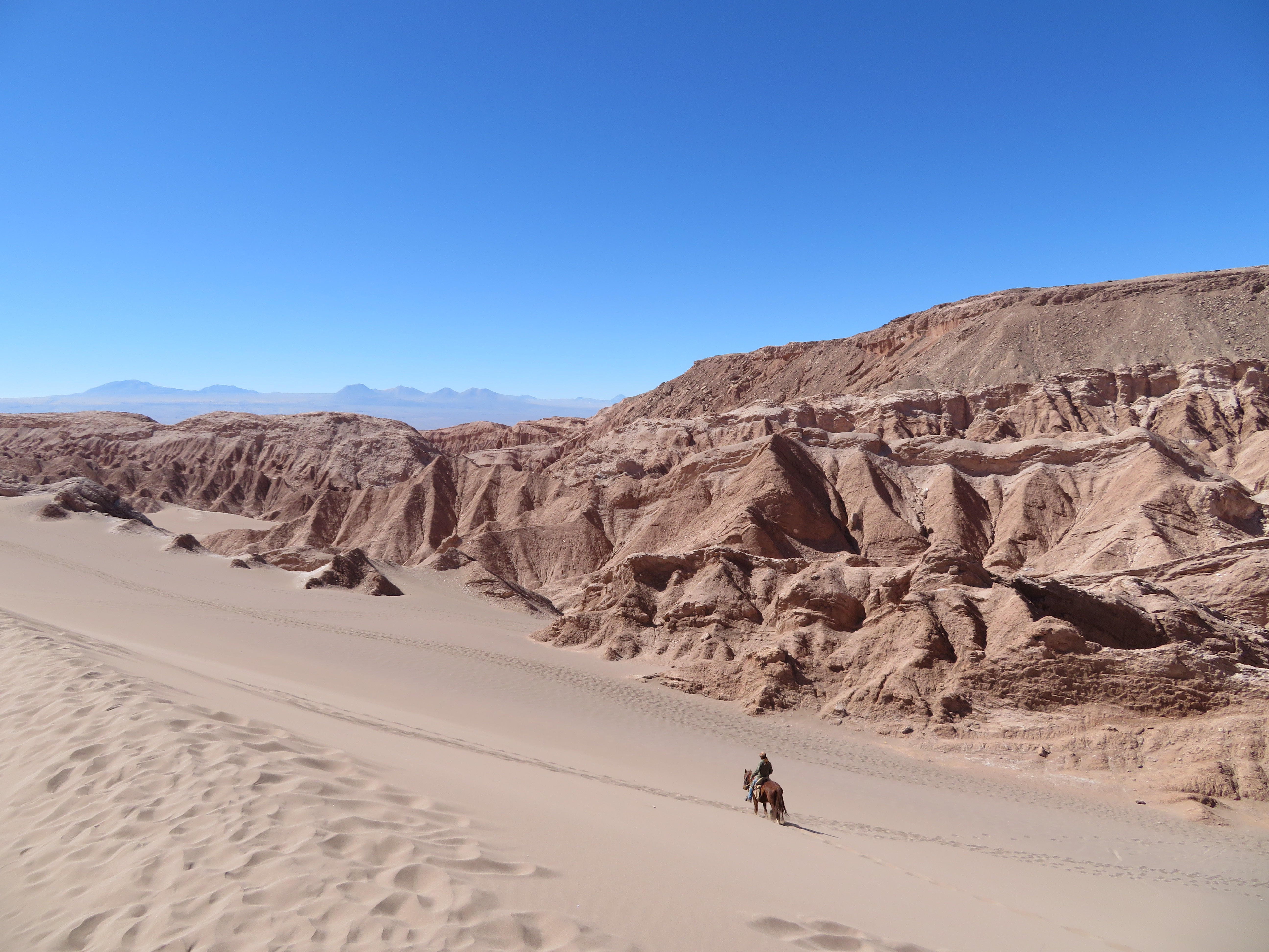 Pour notre deuxième balade, on choisit d’aller visiter la vallée de la Muerte, et histoire de changer, on décide d’y aller à cheval ! Ca fait un moment qu’on voulait se faire une petite promenade à cheval et on s’est dit qu’ici le cadre s’y prêtait bien. On ne regrette vraiment pas, le circuit au milieu des canyons et des dunes de sables est magnifique et donnerait presque l’impression d’être dans un western ! Pour un peu on se prendrait pour John Wayne ! Mais une fois lancés au galop, l’épopée est moins glorieuse ! Une chose est certaine, on n’est pas des cavaliers dans l’âme, et les chevaux ont fait à peu près ce qu’ils voulaient et nous on s’est plutôt laisser promener !