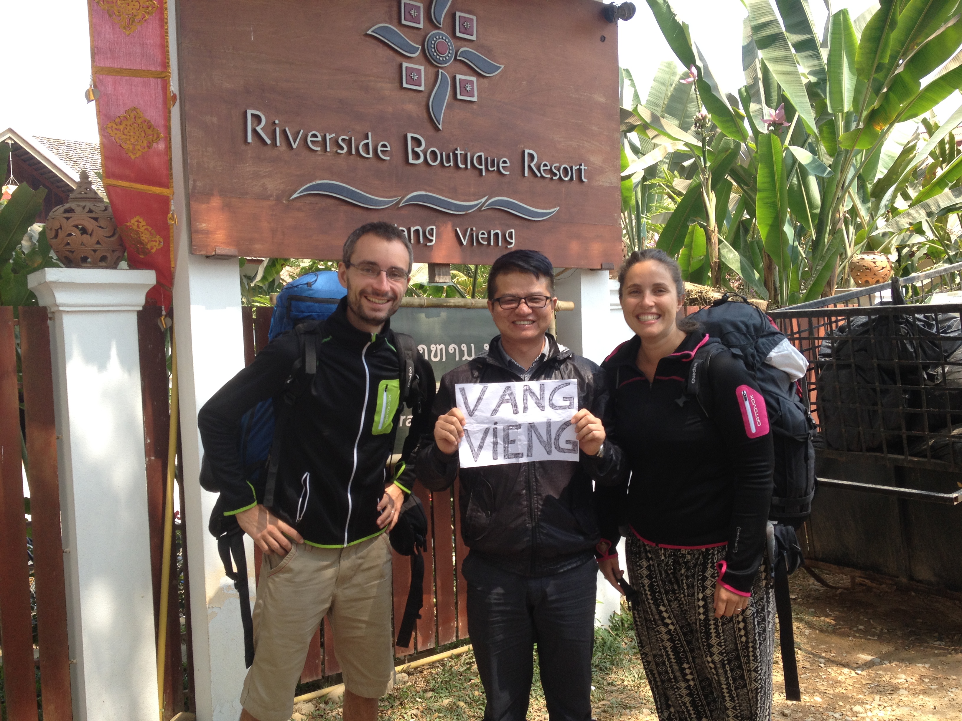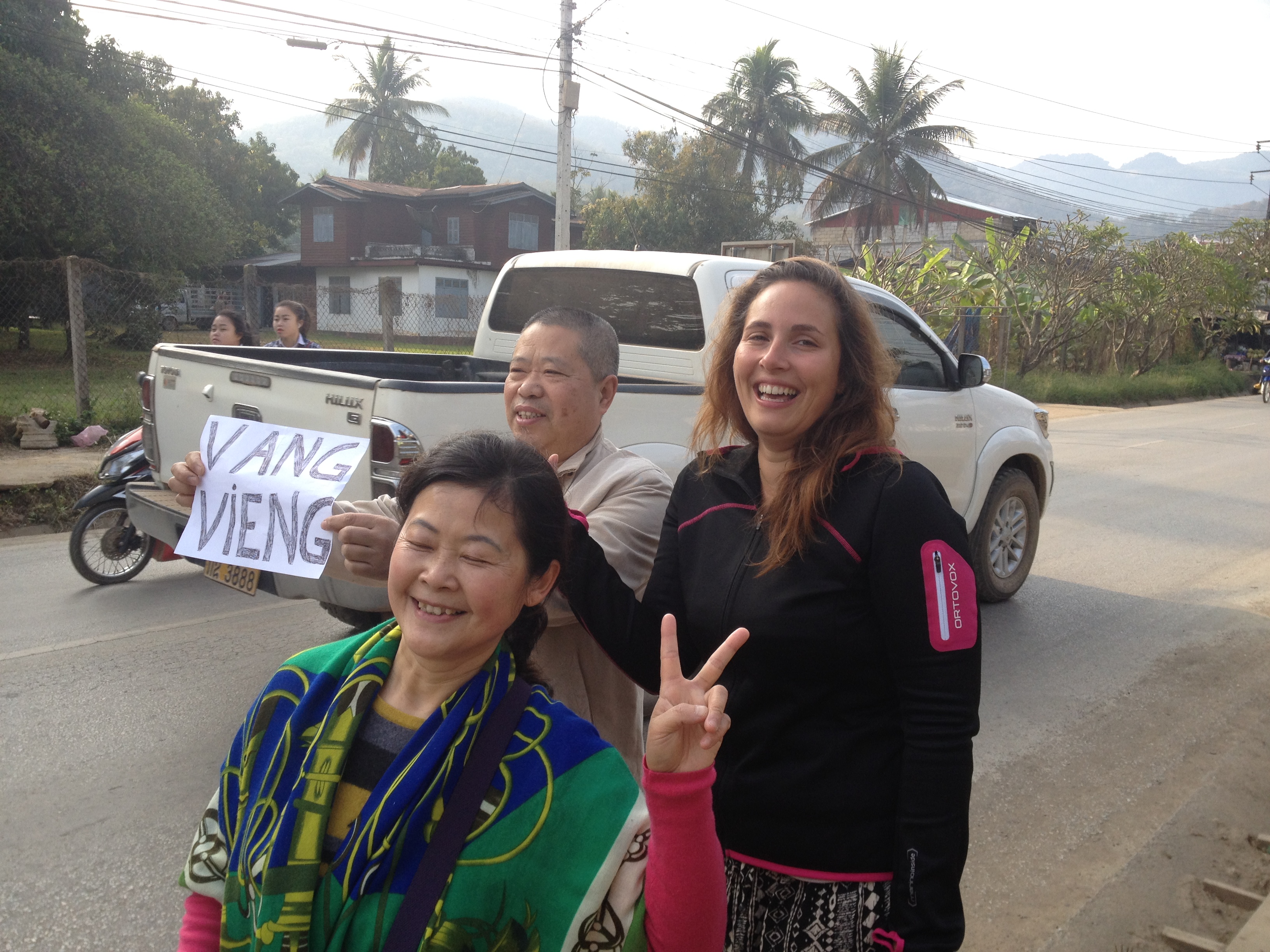 Pour rejoindre Vang Vieng, on décide de se fixer un défi, et de tenter le stop. Il paraît que ca se fait assez bien au Laos, même si le concept est largement inconnu des laotiens. D’après nos renseignements, ce sont surtout les étrangers, et notamment les businessmen chinois, qui s’arrêtent. La veille du départ, on prépare fébrilement notre plan de bataille : la pancarte, le petit mot en Lao pour expliquer ce que c’est que le stop, le repérage du meilleur endroit pour s’installer… On est prêts ! Le jour J, on marche jusqu’à la sortie de la ville, et on commence. Pendant un peu plus d’une heure, personne ne s’arrête, mais par contre on fait bien marrer les laotiens qui manifestement nous trouvent un peu farfelus… Trois chinois passent à pied et se prennent en photo avec nous et le panneau… Normal, Chinese way… On commence un peu à se décourager quand une voiture qui arrive en trombe s’arrête net : ça y’est, on embarque ! Et ça ne rate pas : c’est un businessman chinois (il installe des réseaux de téléphone au Laos et dans différents pays), et son chauffeur laotien ! Le chauffeur est un vrai pro et il nous expédie la route à toute vitesse en moins de 3 heures, ce qui ne doit pas être loin du record national pour ce trajet, sur une route de montagne quand même assez délabrée (on a quand même un peu mal au cœur à l’arrivée) ! Quand on pense que les bus mettent 6 heures et que Manu et Emilie (rencontrés à Luang Prabang) ont même mis 12 heures… Mais bon, eux ça ne compte pas, leur bus de nuit a été stoppé des heures par une milice locale armée qui les protégeait d’un faux checkpoint (véridique !) ! En plus, on est déposés quasiment devant notre guesthouse !