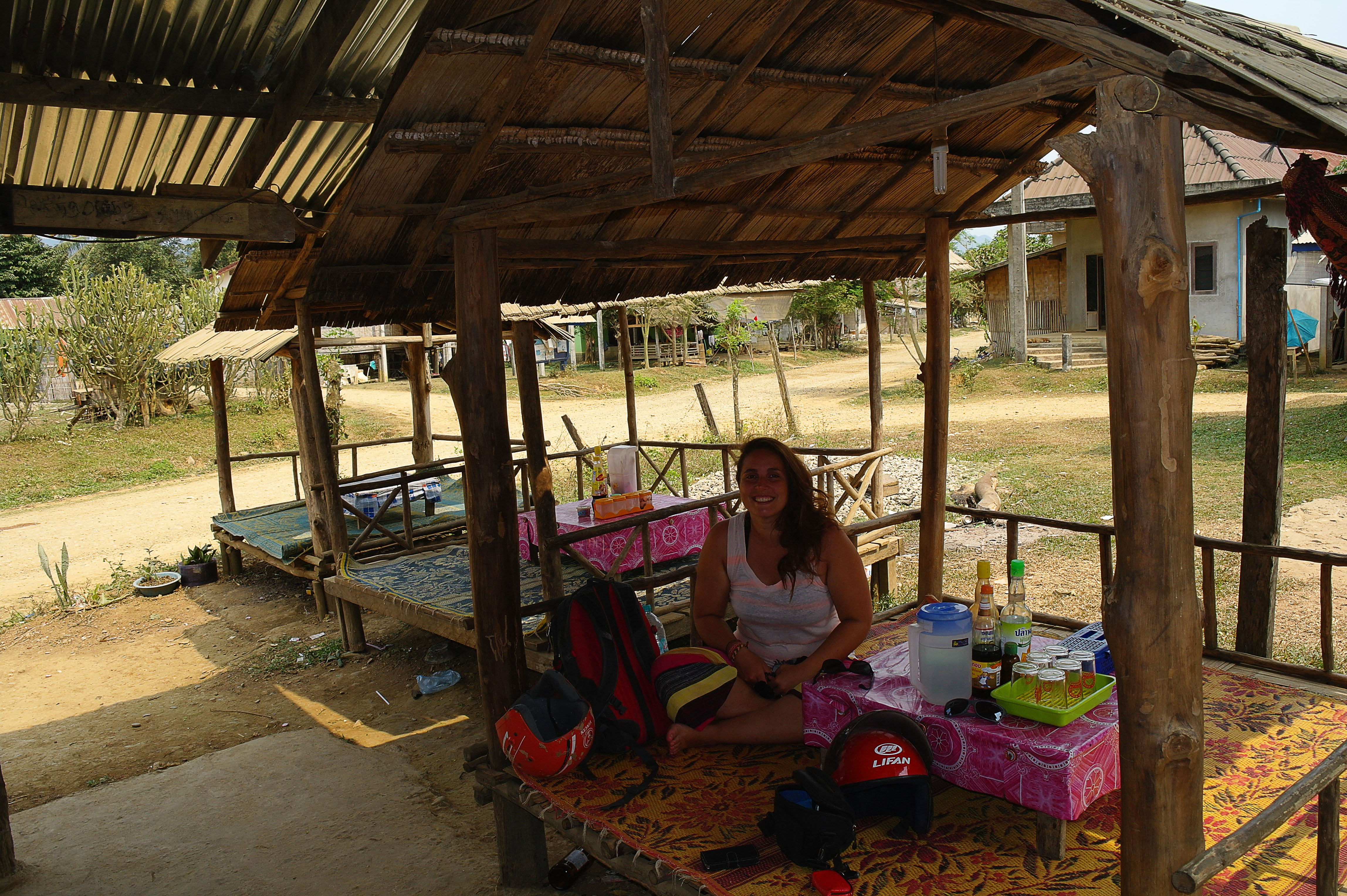 On passe deux jours à explorer le coin à scooter, et après ces longues balades sous le soleil et dans la poussière de la piste, on apprécie de se caler tranquillement dans l’agréable jardin de notre Guesthouse, Mango, où sept petites cabanes sur pilotis, avec hamac, sont installées au milieu des bananiers et des manguiers. L’endroit est très reposant ! On y passe aussi quelques bonnes soirées, dont une soirée « nostalgie du pays », autour de quelques produits devenus rarissimes pour nous : charcuterie, comté et camembert, vin rouge ! Incroyable ! Il faut dire que l’endroit est tenu par un français qui sait s’approvisionner ! C’est, en plus, en bonne compagnie qu’on déguste ces délices, puisqu’on retrouve ici Manu et Emilie pour une dernière soirée (ils sont de passage à Vang Vieng avant de se diriger vers la Thaïlande), et qu’on fait la rencontre de deux Québécois super sympas, Félix et Angelica, qui voyagent en Asie pendant 6 mois, et avec qui la courant passe tout de suite. On fera d’ailleurs un bon bout de route tous les quatre au Laos, pendant une dizaine de jours (mais c’est une autre histoire).
