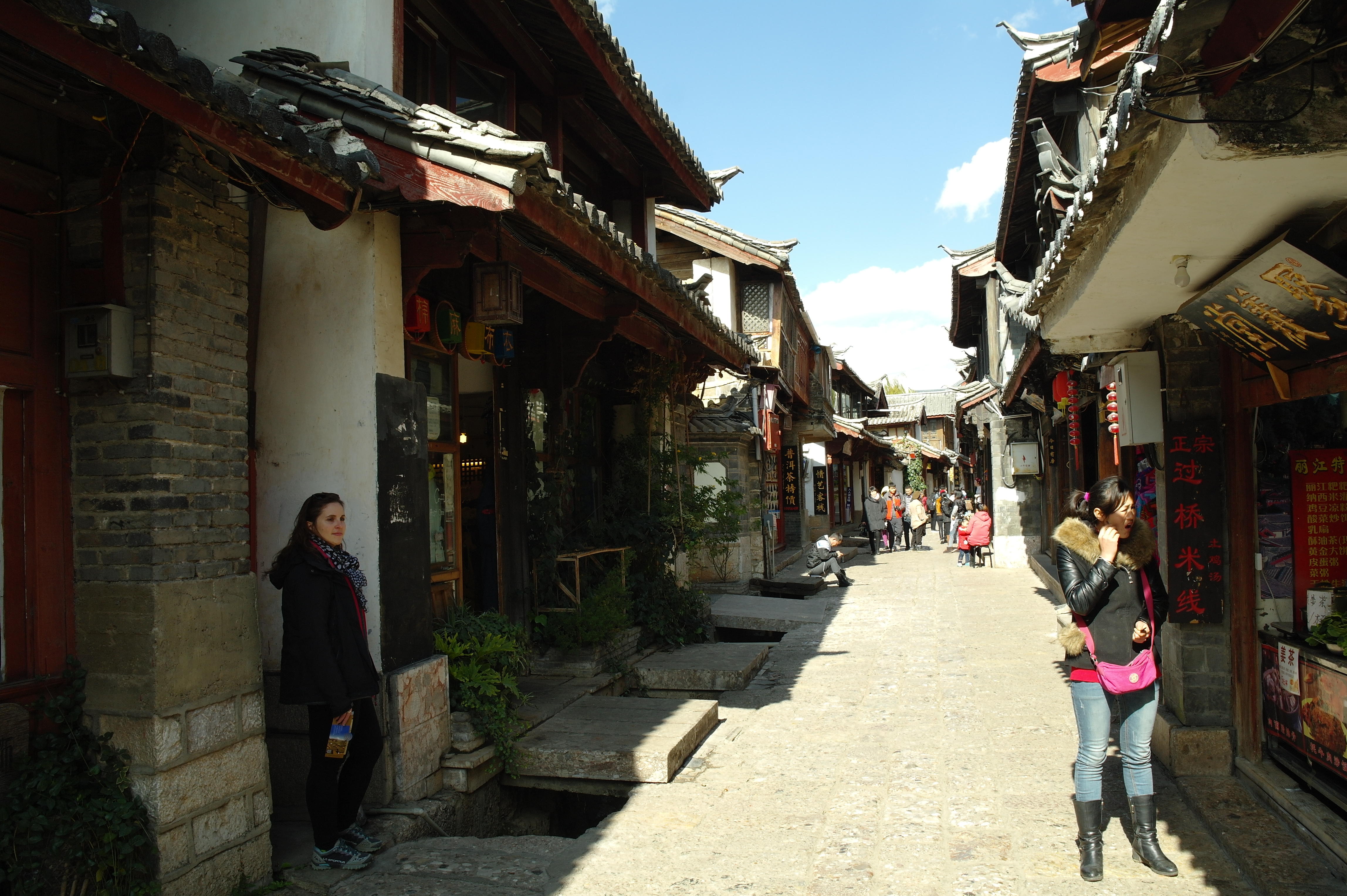 Problème majeur, la ville est plus-qu’ultra-démesurément-incroyablement touristique. Consciente de la valeur de son patrimoine, la ville de Lijiang a décidé de prendre les choses en mains… A grands coups de clips publicitaires, la ville a su attirer les touristes, majoritairement chinois. Résultat, elle revendique aujourd’hui plus de 20 millions de visiteurs par an (à qui elle facture un billet d’accès à la vieille ville de 12 euros chacun, c’est rentable…). On a la chance de passer par là hors saison et c’est vivable, mais les panneaux conseillant des itinéraires bis pour gérer les flux de piétons font froid dans le dos. Et comme les touristes chinois n’aiment rien plus que le shopping, ben pour leur faire plaisir la ville historique a été purement et simplement dénaturée, et il ne reste plus une seule maison qui ne soit pas occupée par un hôtel, une boutique de souvenirs (ici le grand truc c’est les tam-tams et les breloques, la viande de Yak et les vêtements Naxi, la minorité ethnique du coin, descendants de nomades tibétains) ou un stand de grillades, dont les vendeurs interpellent sans arrêt le promeneur. On apprend d’ailleurs en discutant avec les gérants de notre AJ (hors de la vieille ville), que la municipalité rachète carrément les maisons pour y installer ces boutiques… Du coup le sentiment d’émerveillement devant la beauté de la vieille ville s’estompe bien vite et nous laisse avec l’impression agaçante de déambuler au cœur d’un mini Disneyland…