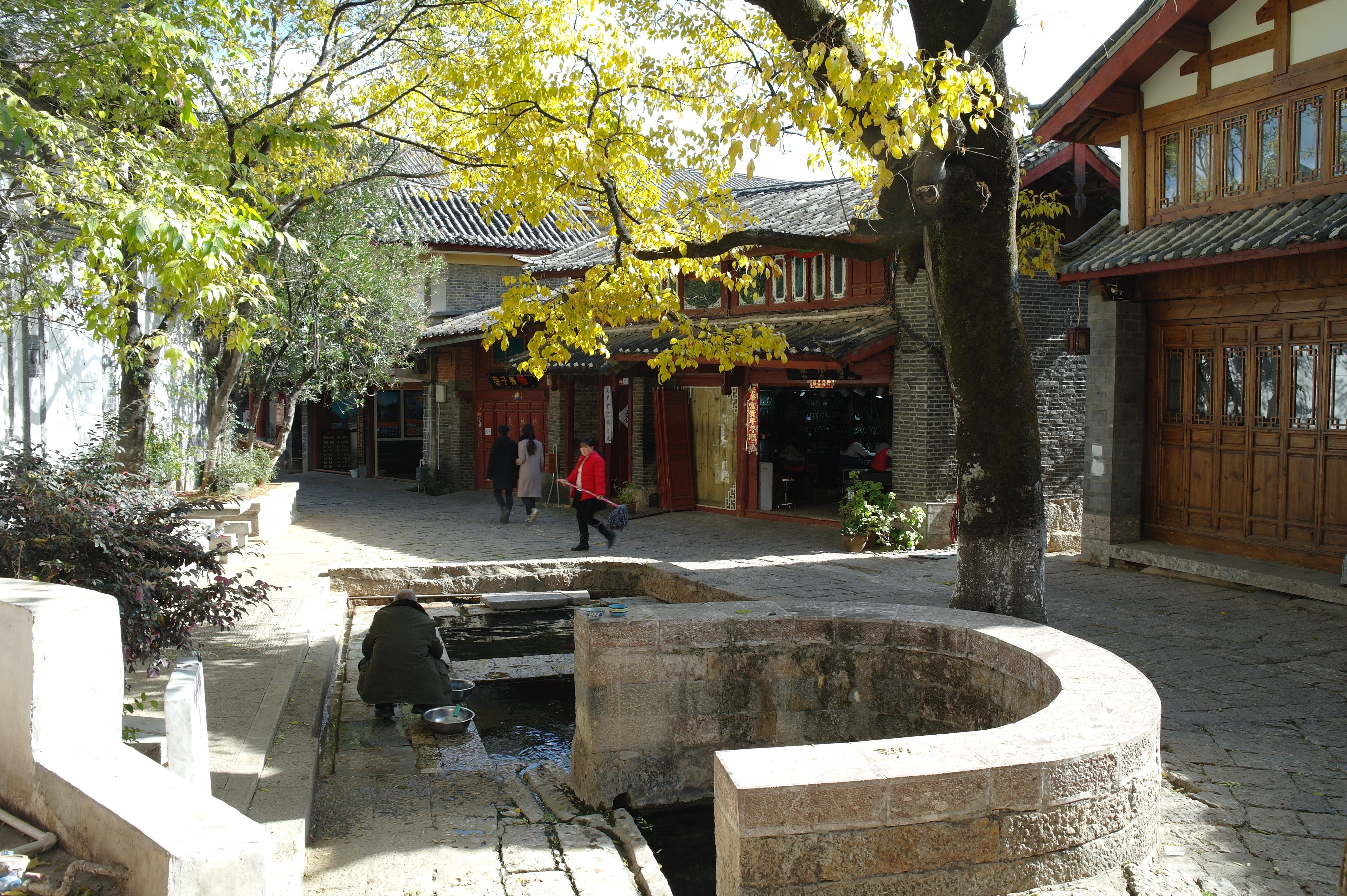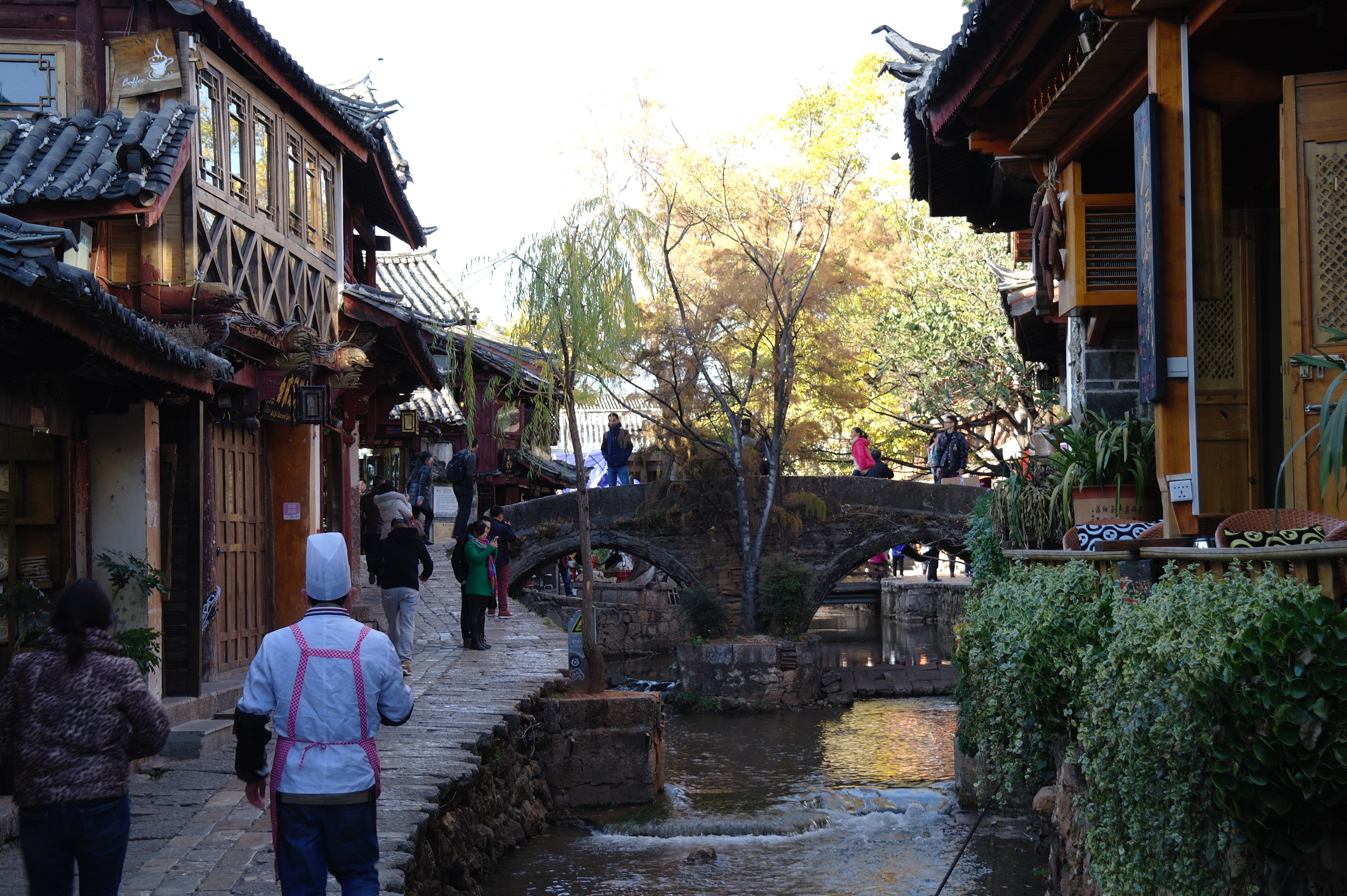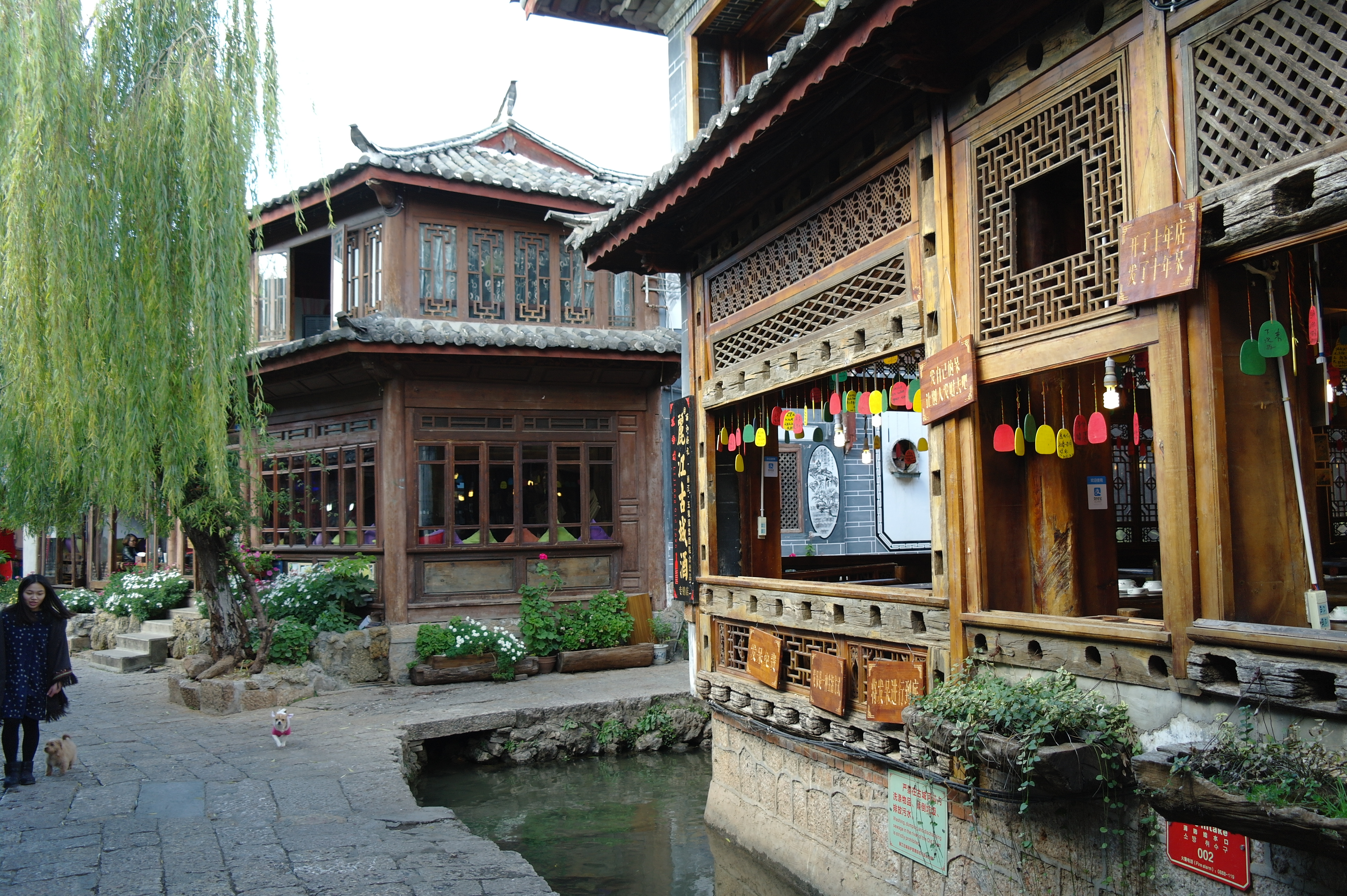 Lijiang est une superbe petite ville. La vieille ville, qui s’étend sur quelques kilomètres carrés et est entièrement piétonne, est constituée d’un réseau de ruelles pavées et de canaux, bordés de maisons anciennes aux toits traditionnels. Au fil de la balade, on emprunte de charmants petits ponts de pierre, on traverse de petites places ombragées agrémentées de fontaines… Vue des hauteurs, la ville forme une mer de toits de tuiles encadrée par les montagnes qui vaut vraiment le coup d’œil…