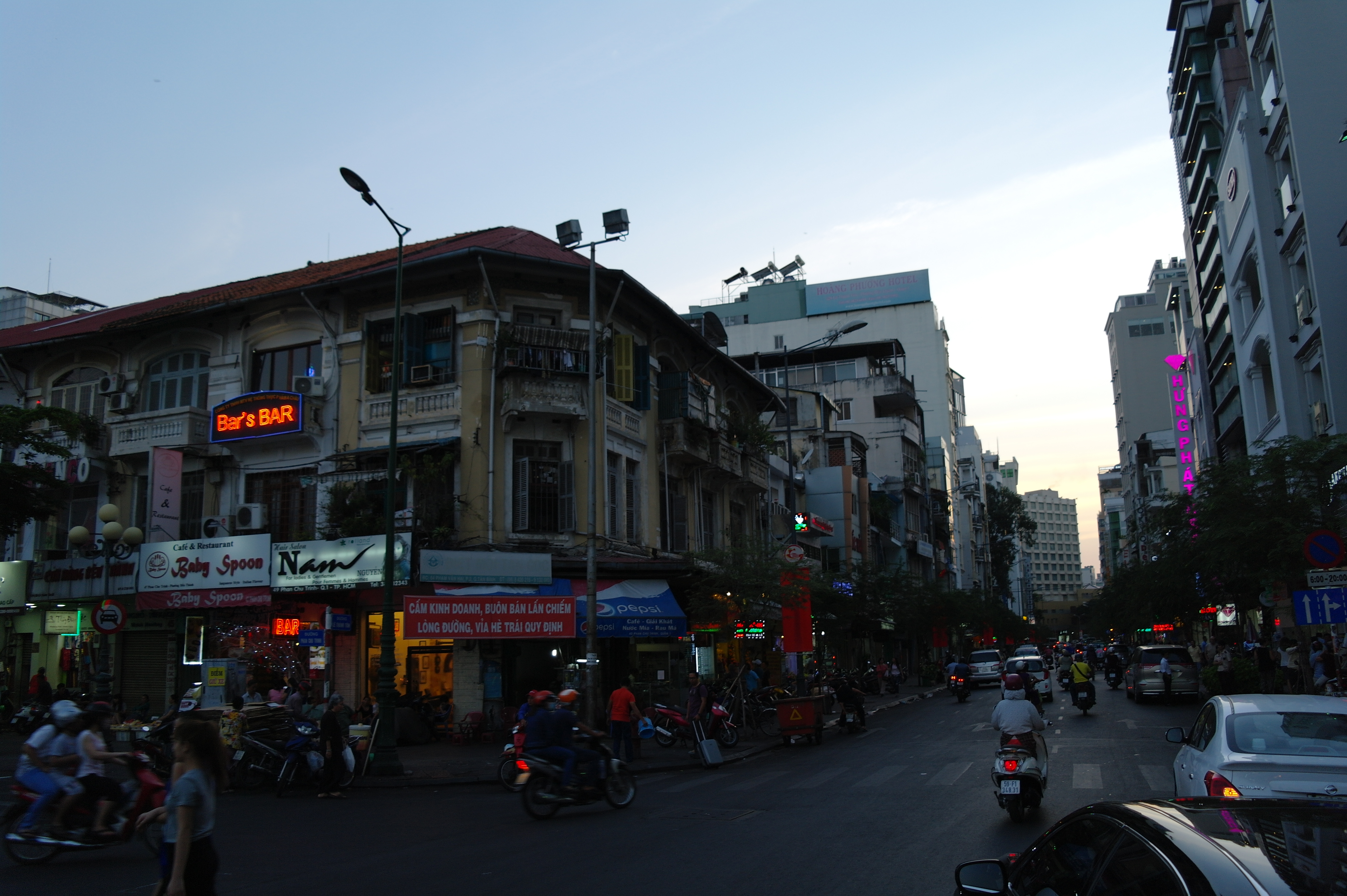 On passe une première soirée agréable, posés devant le restau ; On sympathise tout de suite. Phuoc est vraiment cool, il a beaucoup d’humour, et il se met en quatre pour qu’on se sente bien. Il nous explique plein de choses sur le Vietnam, les mentalités, les usages, et il est également très curieux de ce qui se passe et se fait en France. On est rejoint par Trung, « l’oncle » de Phuoc (en fait c’est juste un ami, mais comme il a une quarantaine d’année il a le statut « d’oncle » !), et on fait connaissance autour de quelques bières. Phuoc se lève souvent pour aller s’occuper de ses quelques clients, mais