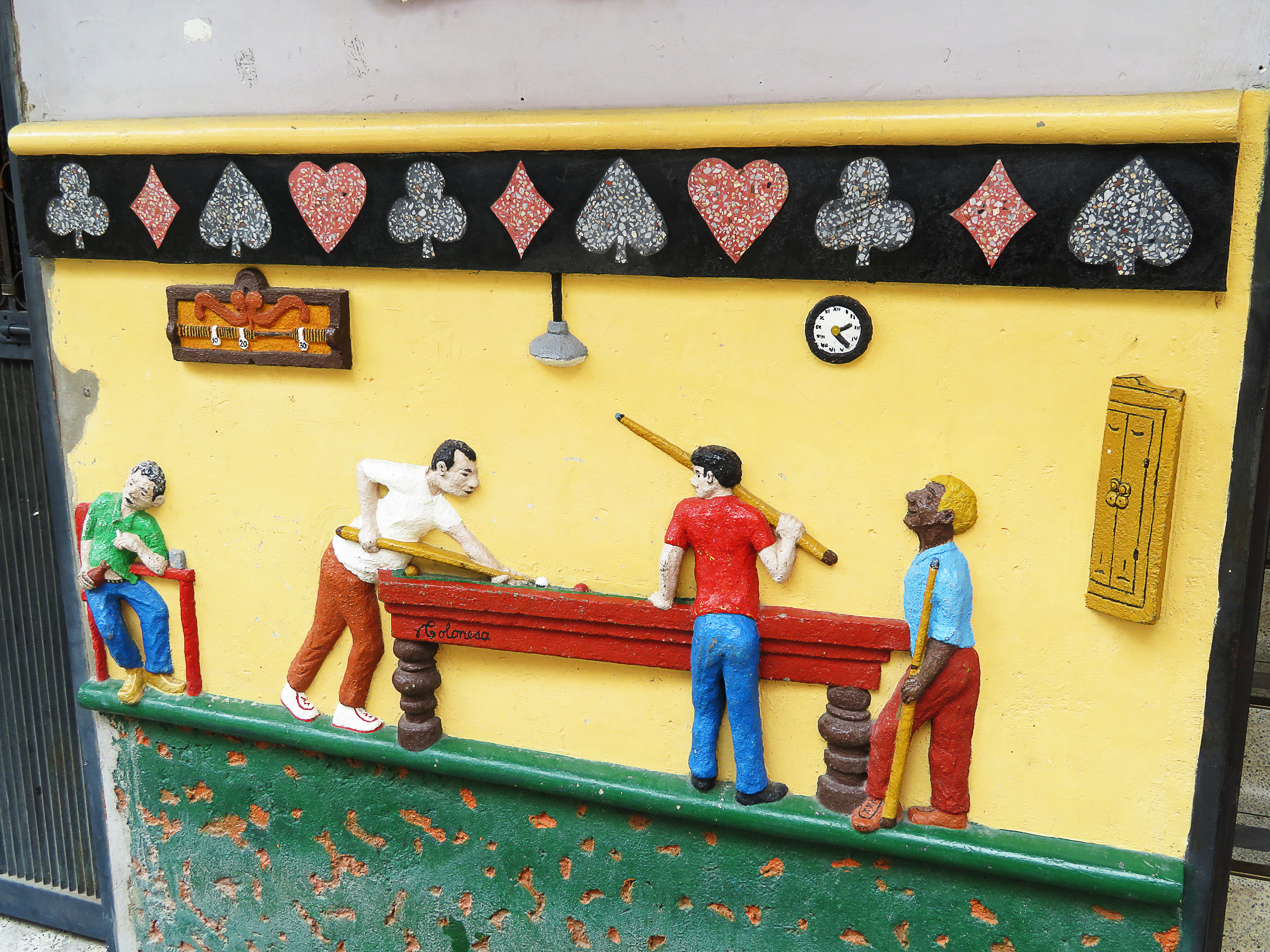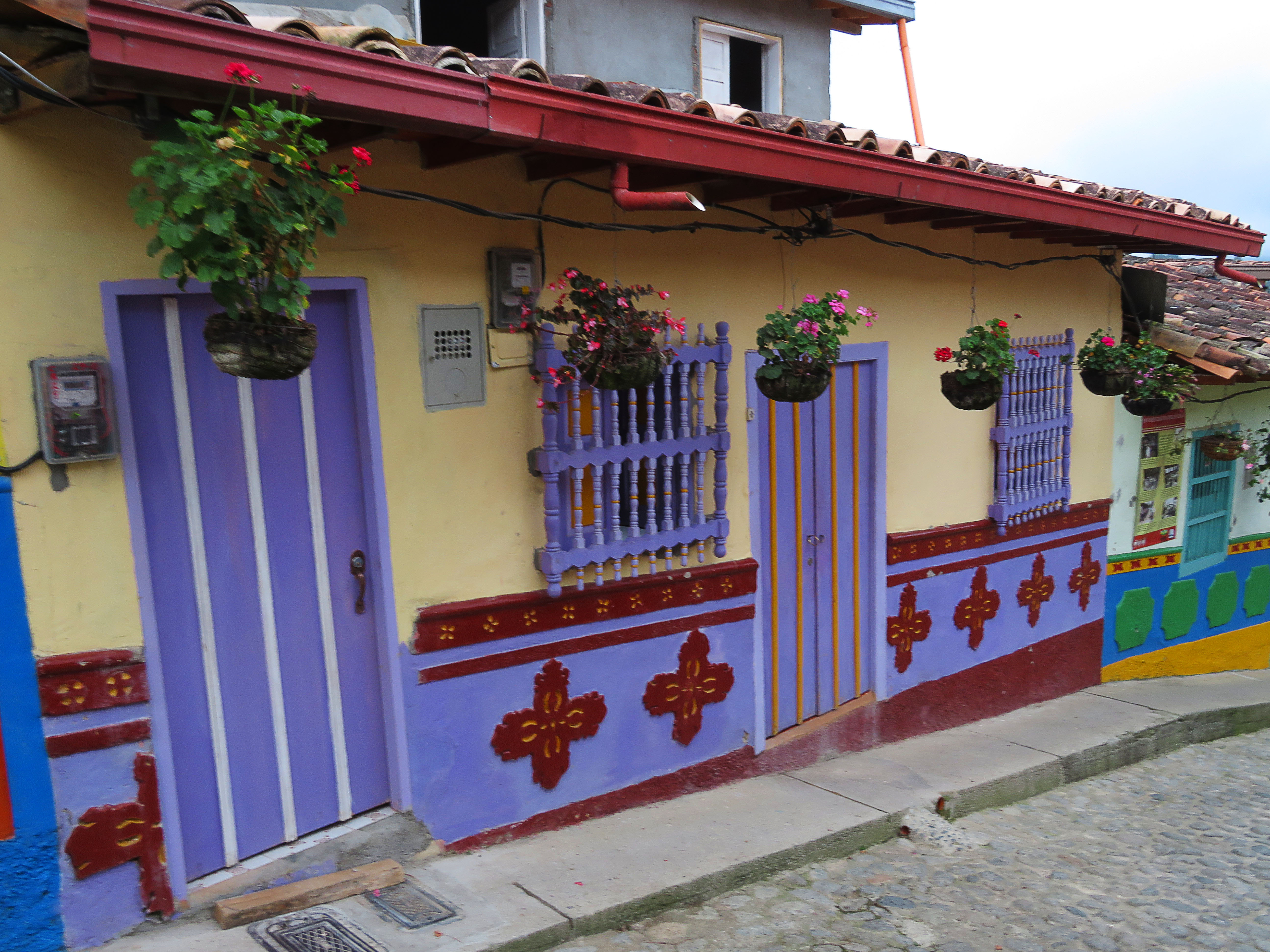 La particularité du village de Guatapé c’est la décoration des façades de ses maisons. Dans chaque rue, toutes les façades sont peintes en couleurs vives, avec des fenêtres et balcons décorés, des frises décoratives et des bas reliefs (« los zocalos ») représentant l’histoire du village, des scènes de la vie quotidienne, des animaux ou simplement des formes géométriques. Les ruelles, où circulent très peu de véhicules, sont pavées, fleuries et bordées de lampadaires ouvragés. Le tour du village est vite fait, mais la balade vaut le coup.