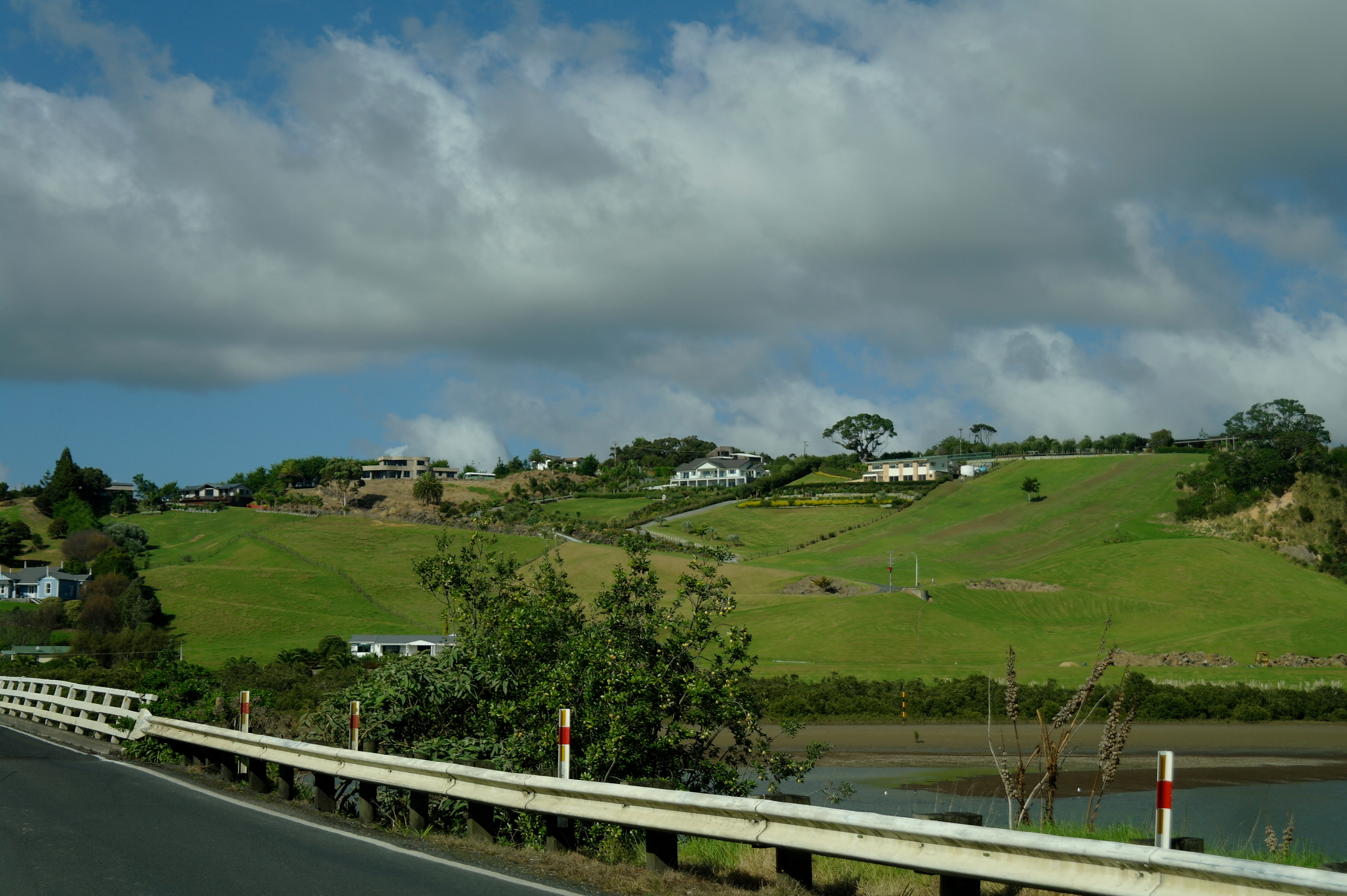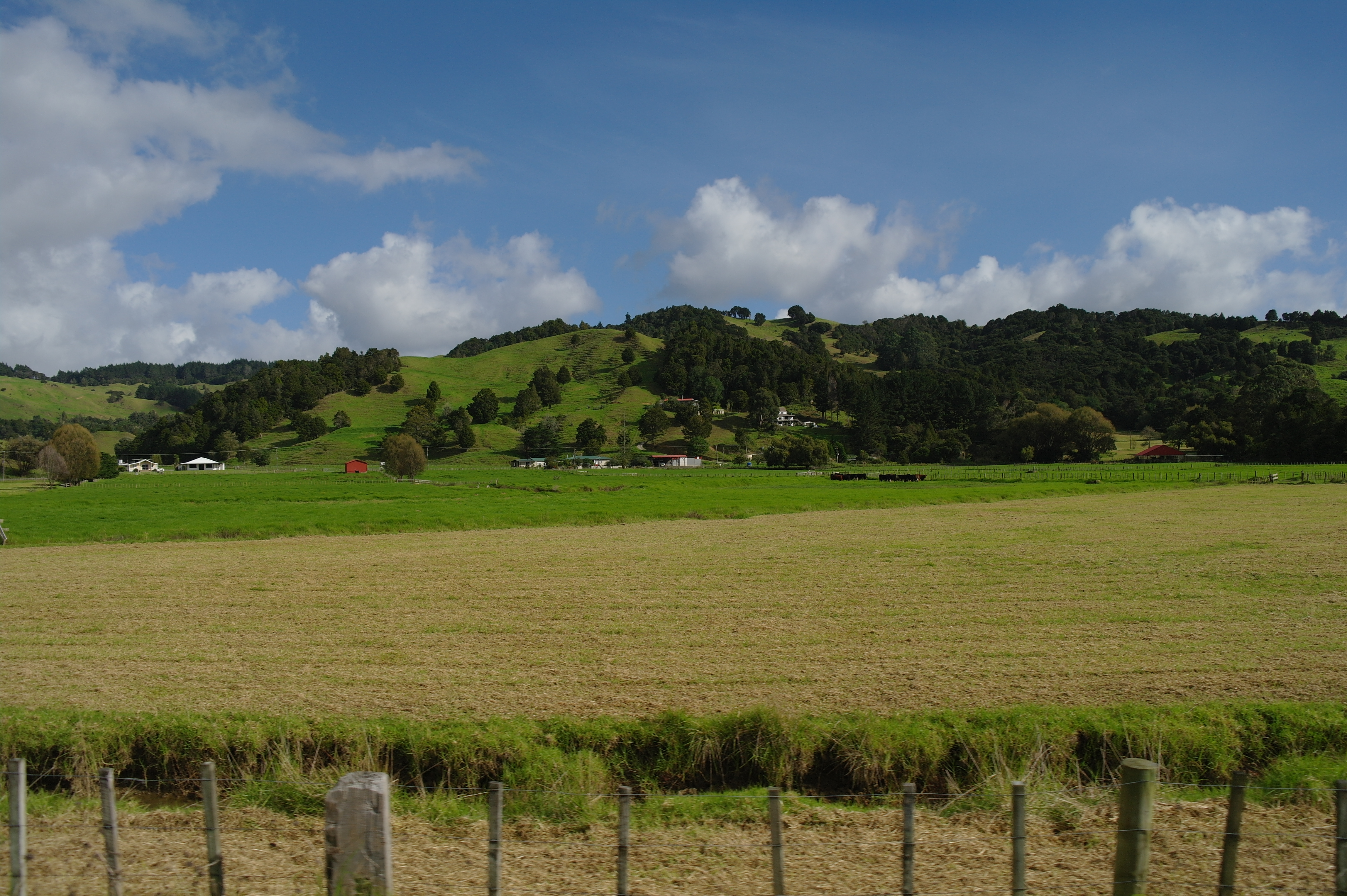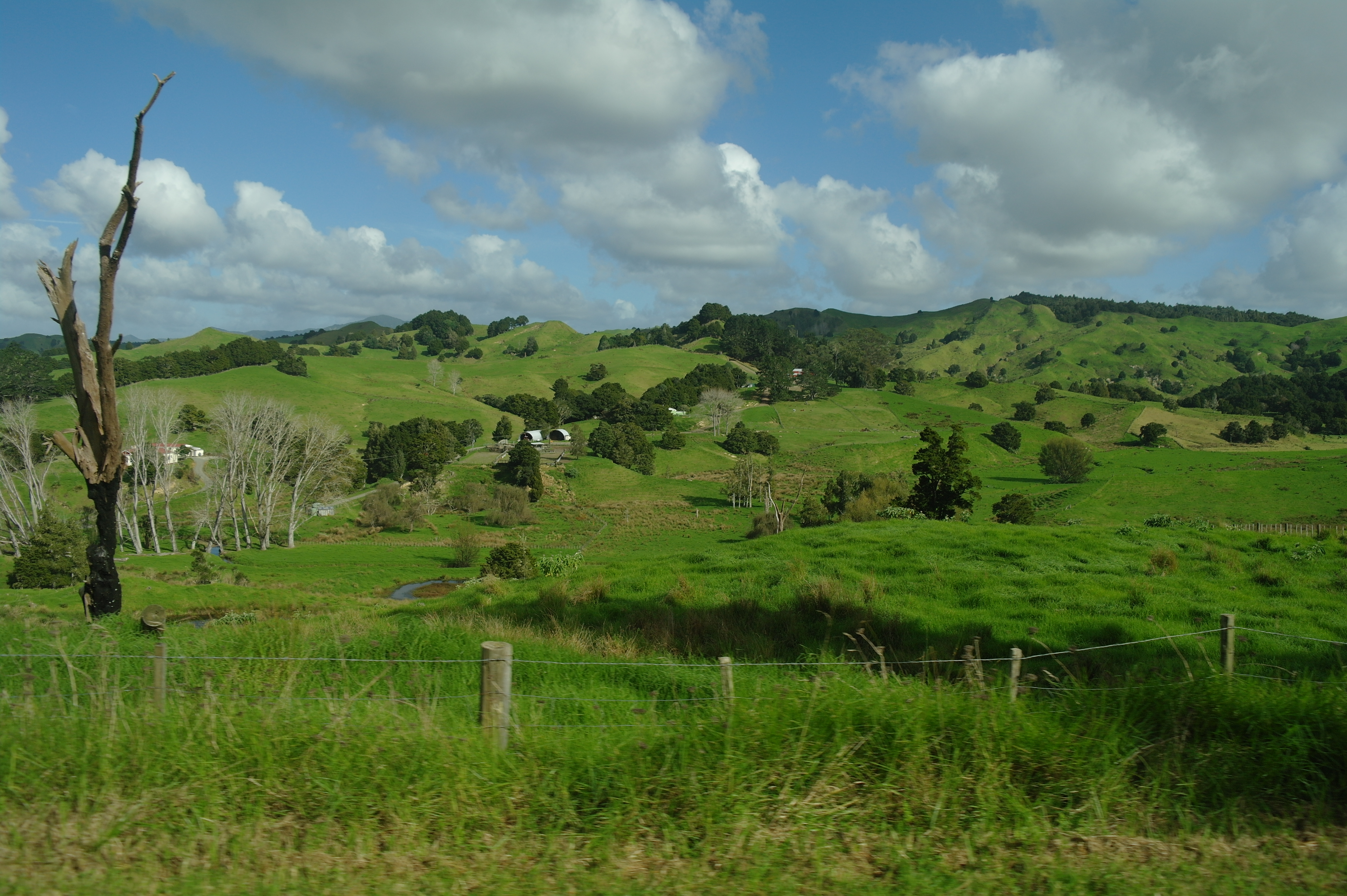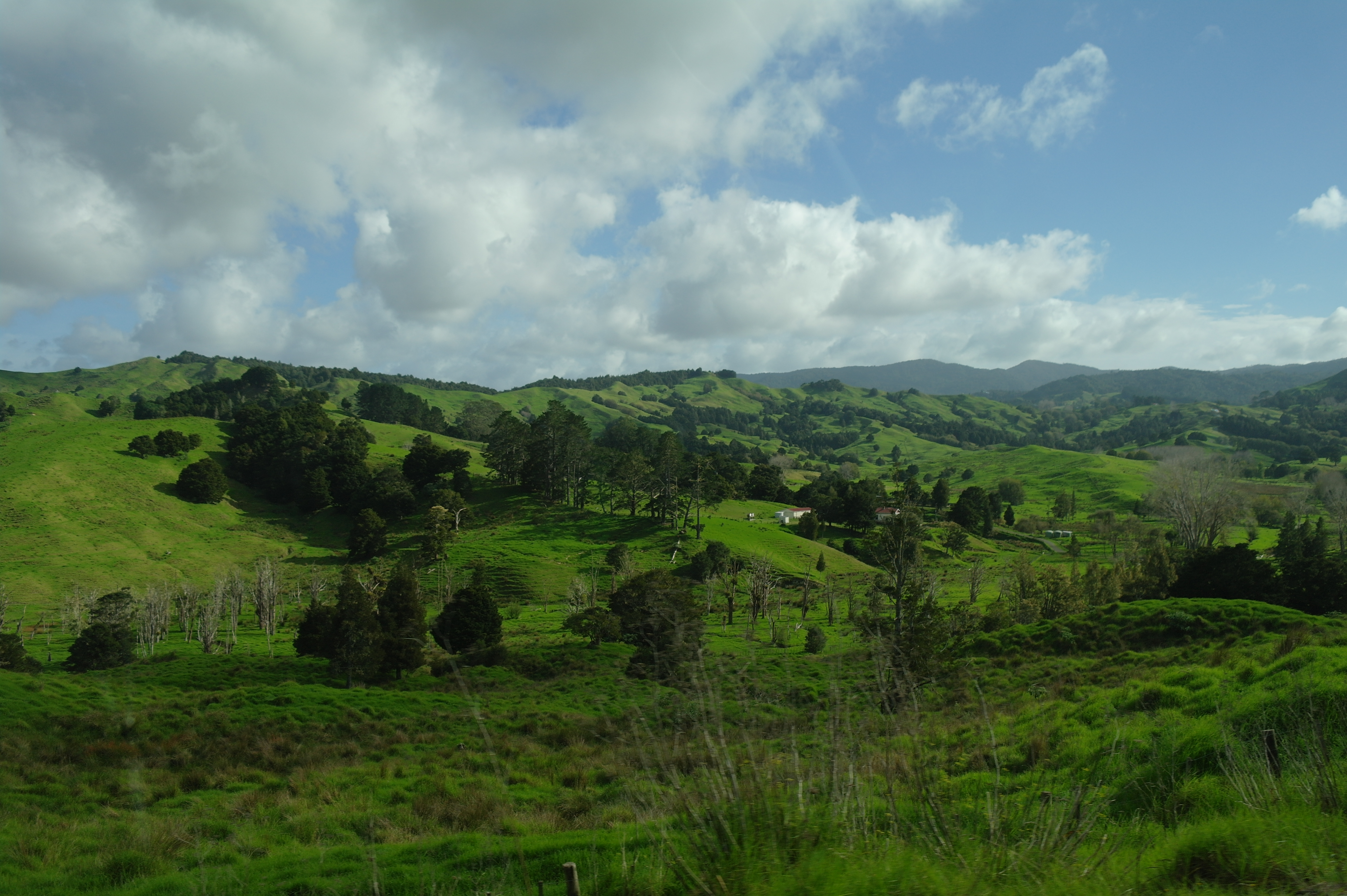 On traverse d’abord des paysages faits de collines abruptes et très vertes, recouvertes de pâturages où se baladent vaches et moutons. Ca grimpe, ça redescend, la kikismobile a du mal ! Par contre c’est très beau, dans le genre bien propret, herbe bien tondue, pas un arbre qui dépasse, et les petites maisons style mobil-home avec leur façade rutilante et parfois leur drapeau néo-zélandais flottant fièrement au vent.