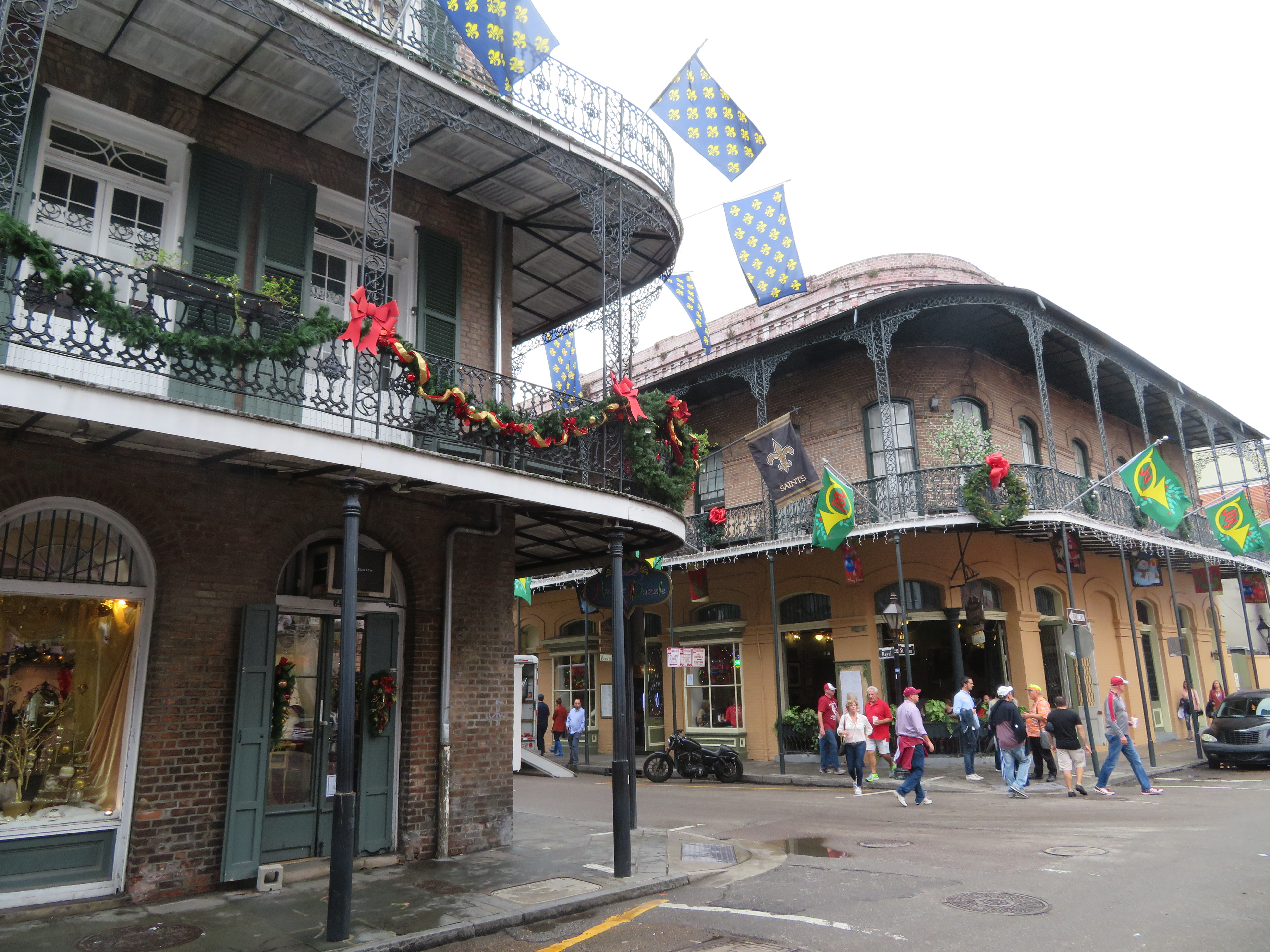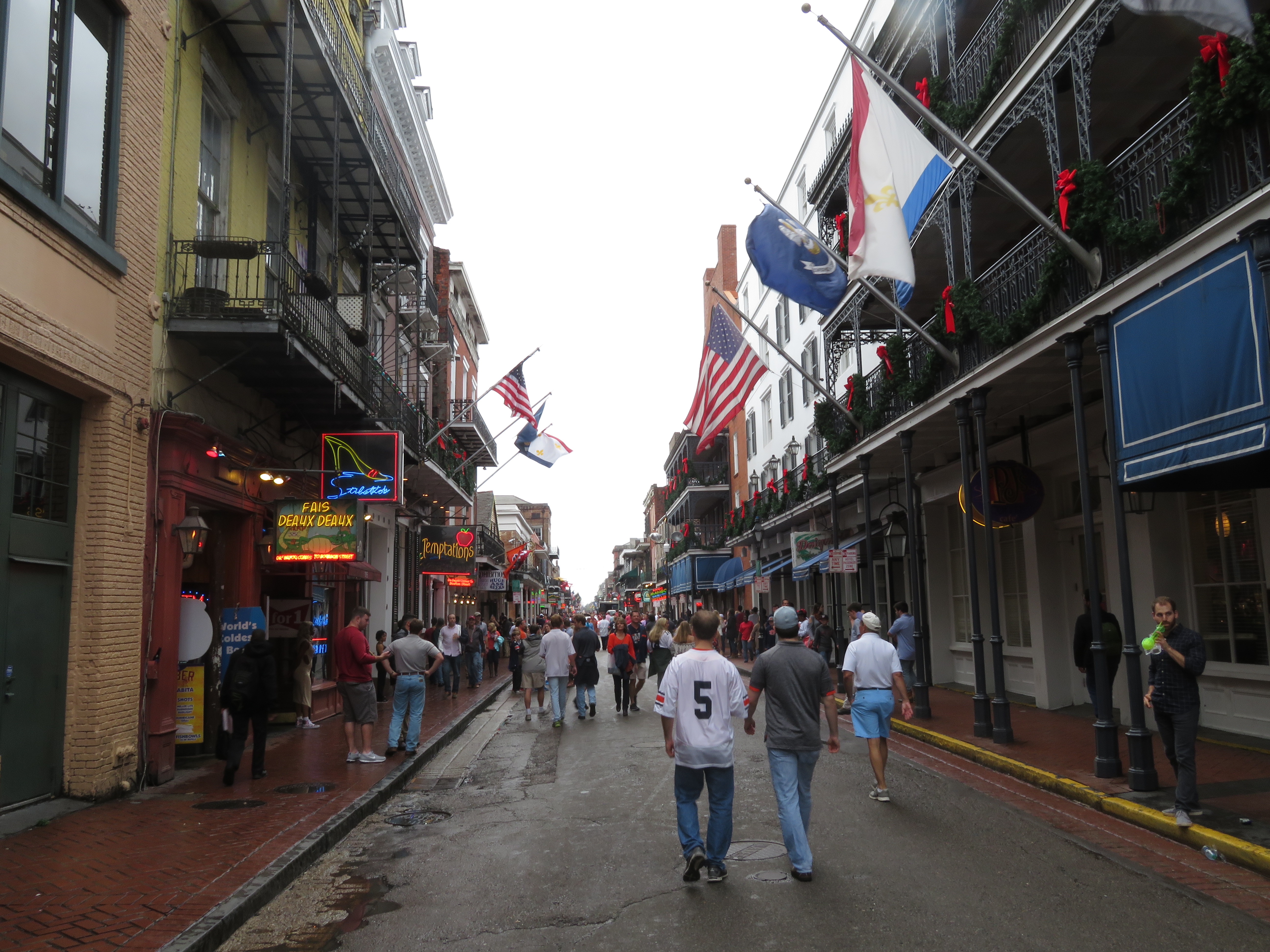 En ce dimanche soir, il y a en ville beaucoup d’animation, malgré le déluge qu’on se reçoit : demain c’est le sugar bowl, un important match de football américain, et les supporters de l’Oklahoma ont déboulé et ils sont chauds bouillants. Pour l’occasion, il y a des lancer de colliers de perles : c’est une tradition de la Nouvelle Orléans, en principe réservée au carnaval du mardi gras, mais qui a pris un peu d’avance. Il paraît que normalement les filles montent leur poitrine pour recevoir un collier, mais malheureusement on n’a pas droit à cet aspect là du folklore.