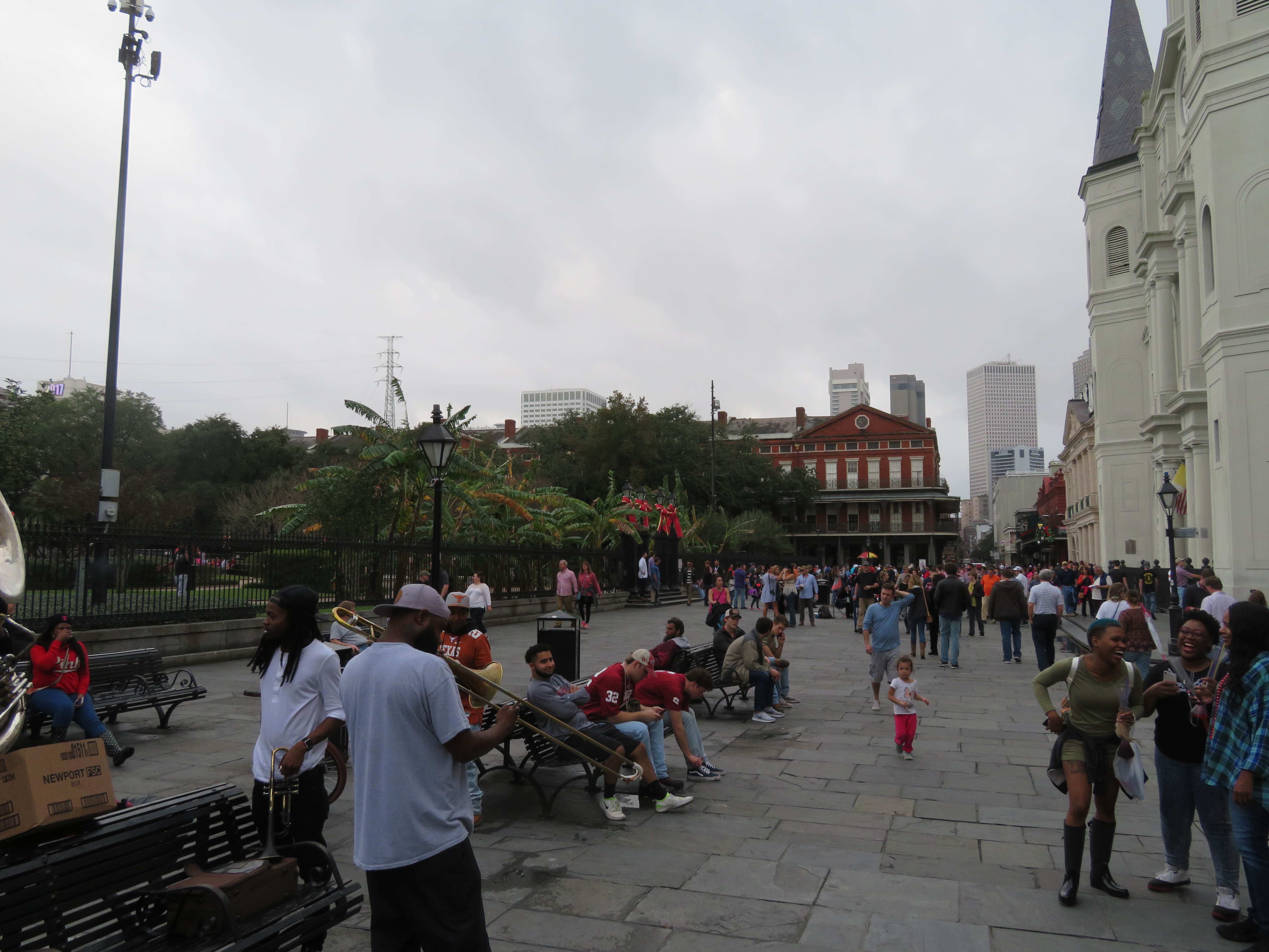Le lendemain, après avoir changé d’hôtel (et on trouve beaucoup mieux), on déambule à nouveau dans ce vieux centre, ainsi que sur les rives du Mississipi (finalement assez décevant ici, les rives faisant assez zone industrielle). On découvre une ville très particulière, qui détonne aux US. Outre son côté rétro, NOLA (c’est le petit nom de la Nouvelle Orléans) cultive une francophilie affichée (à travers les noms des magasins, de rues comme « Royal », « Dauphine », ou encore « Chartres»), ainsi que des origines créole et cajun revendiquées (les Cajuns étant les descendants des colons français expulsés du Canada par les Anglais au 18e Siècle, qui ont fini par atterrir ici, en Louisiane). Une identité particulière qui se ressent aussi dans la nourriture, très différente du reste du pays : il y a ici une riche cuisine créole, avec des plats emblématiques tels que le Gombo aux écrevisses ou le Jambalaya… On en dit plus dans la rubrique C koikon mange !). Et puis il y a toujours beaucoup d’ambiance dans les rues, et ce tous les soirs : il y a de la musique un peu partout, des groupes jouent en live quasiment dans chaque bar (et les bars sont nombreux 😉 ), il y en a aussi dans les rues, c’est vraiment cool (d’autant qu’ici il fait doux même en hiver et qu’il est agréable d’être dehors). Dès Miami, on nous avait plusieurs fois décrit NOLA comme la ville la plus festive des Etats Unis, et on comprend pourquoi. Bref, aller boire des coups dans les bars tout en écoutant des petits concerts sera l’une de nos activités à la Nouvelle Orléans.