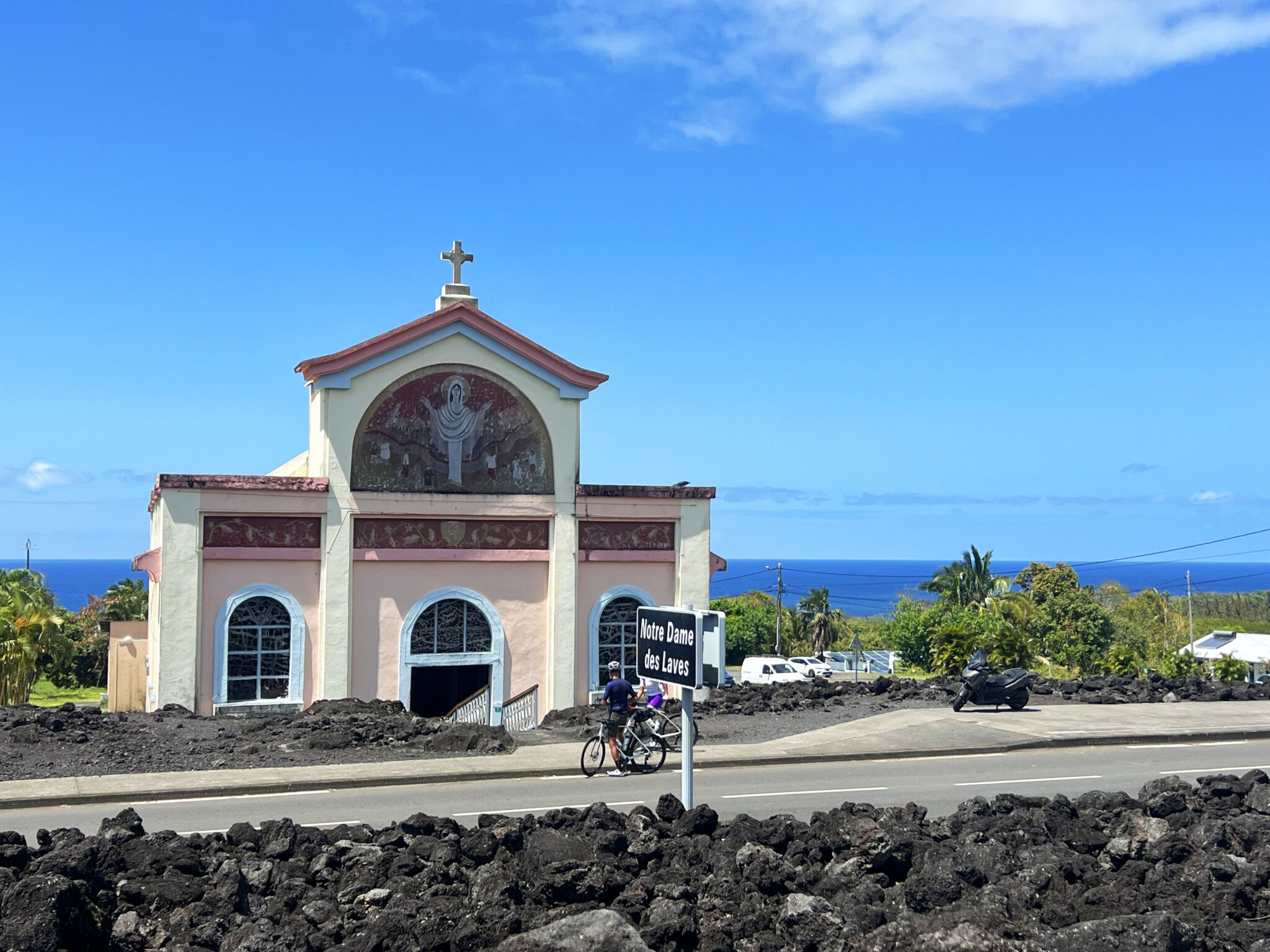 En longeant la côte depuis le nord, on aperçoit les restes d’une première coulée, celle de 1977, au niveau du village de Piton Sainte Rose, juste en face de l’église Notre-Dame des laves, qui a gagné son nom quand la coulée l’a encerclée sans la toucher.