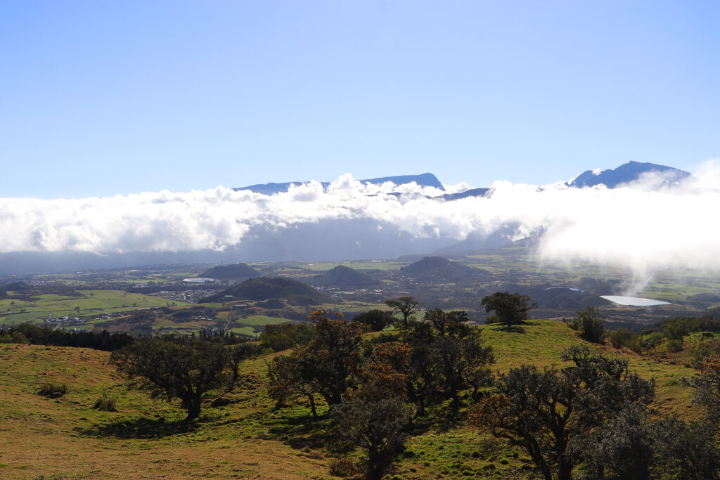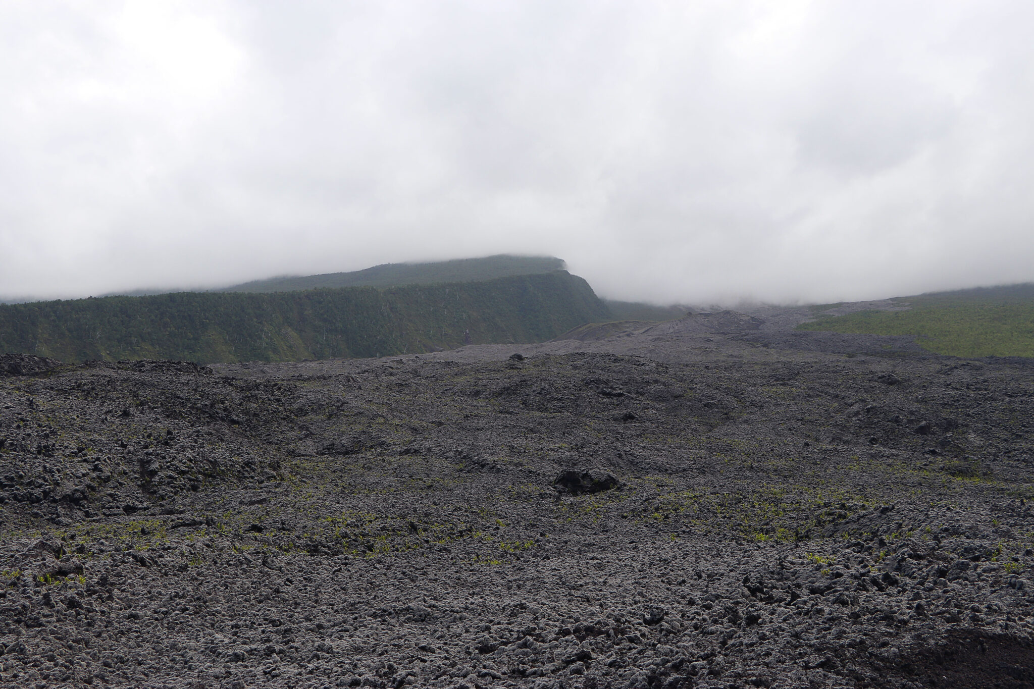 On s’engage ensuite sur la route du volcan qui commence par grimper sec vers le haut de la première caldeira, une chaîne rocheuse appelée « les remparts ». Le nom est approprié tant cette barrière rocheuse est impressionnante. De là-haut, on fait plusieurs arrêts points de vue, vers l’ouest sur les hautes plaines et le Piton des neiges au loin, vers l’est sur la vallée de la rivière des remparts, une vallée profonde entre les deux remparts rocheux successifs (mais envahie par les nuages lors de nos passages).