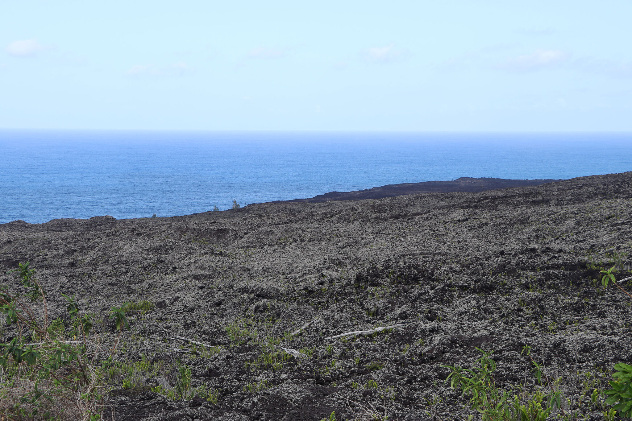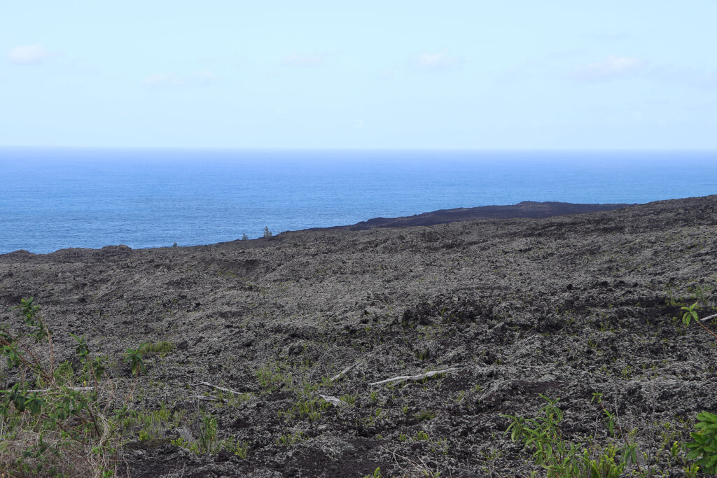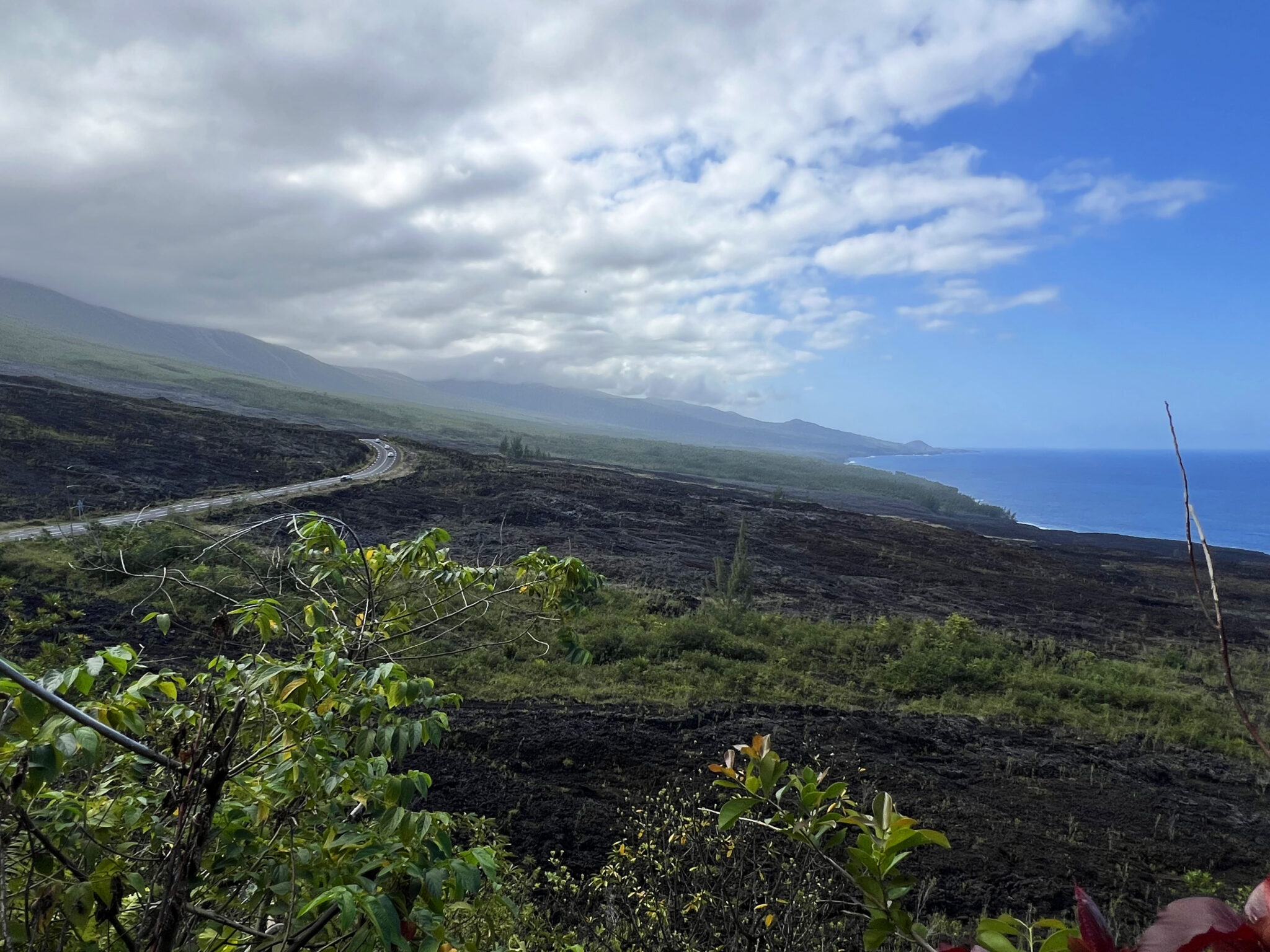 Plus au sud, on entre dans la zone du grand brulé, avec une vue plongeante sur les vastes zones de roche volcanique : la lave a solidifié et la végétation reprend doucement sa place.