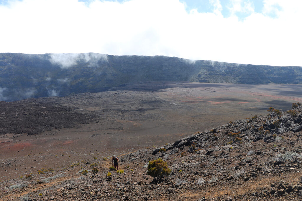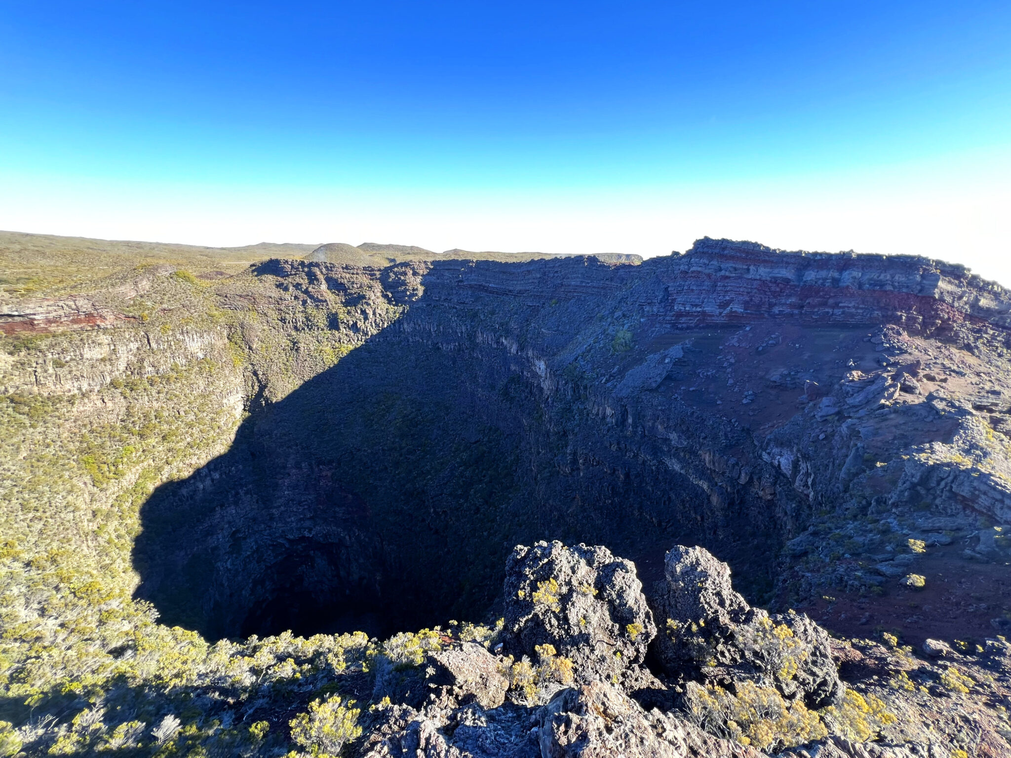 Après avoir longé les remparts on s’arrête au niveau du cratère Commerson, un cratère vieux de 2000 ans ultra profond et abrupt. Il se trouve à deux minutes de marche de la route, on y accède très facilement, et l’arrêt vaut vraiment le coup, c’est vertigineux !
