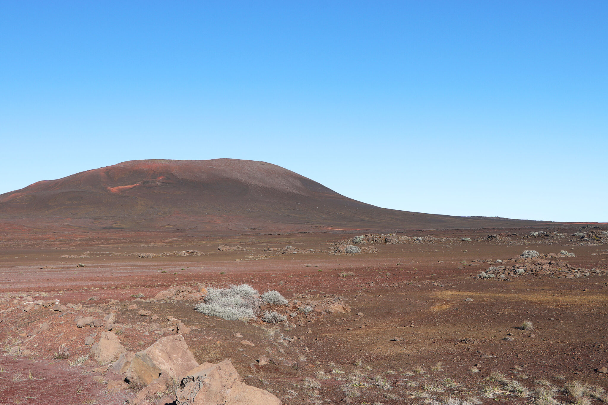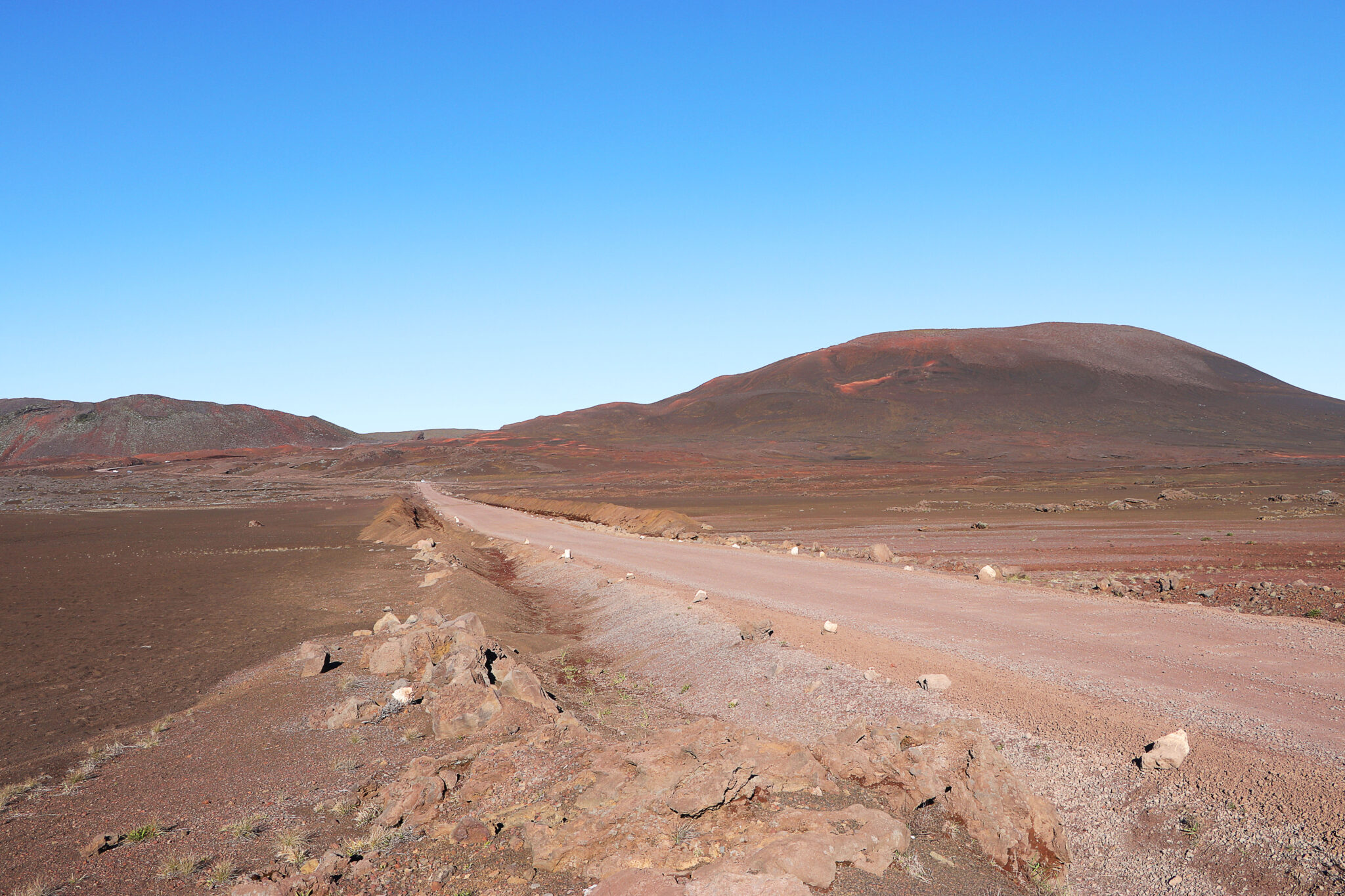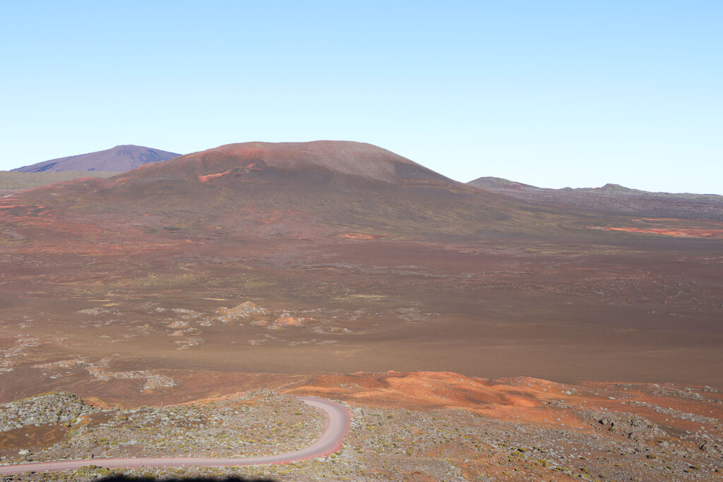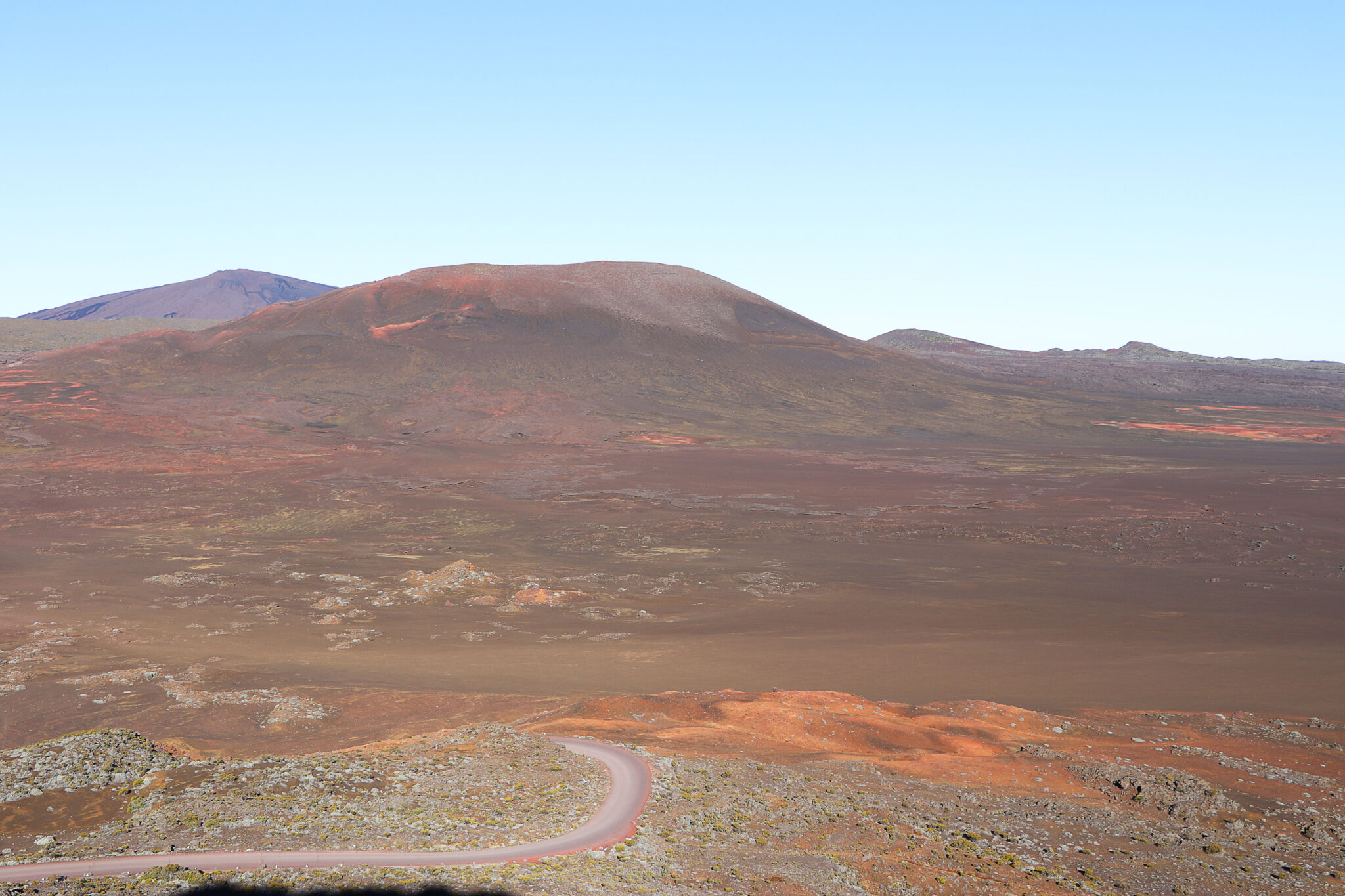 Un tout petit peu plus loin, la route surplombe puis traverse l’emblématique Plaine des sables, une zone aride aux faux airs de planète mars, avec déjà le piton de la fournaise qui apparaît en arrière-plan. On y descend par une route en lacet qui offre de beaux points de vue, puis on peut librement s’arrêter au cœur de la plaine. On y est d’ailleurs revenu pour y randonner et grimper le petit Piton Chisny, pour mieux apprécier cet environnement minéral.