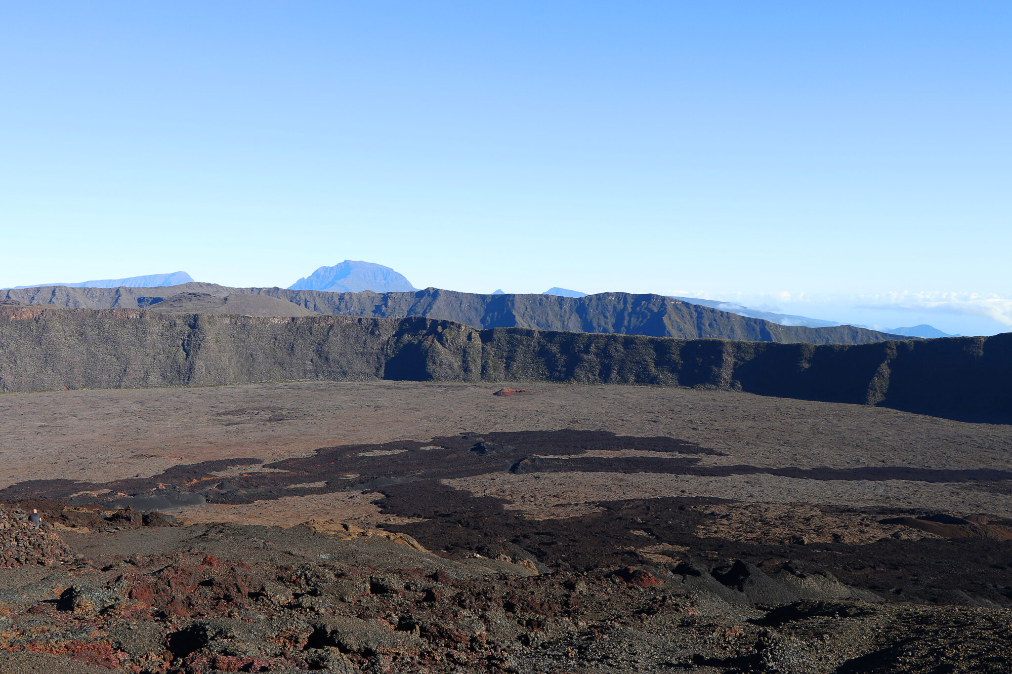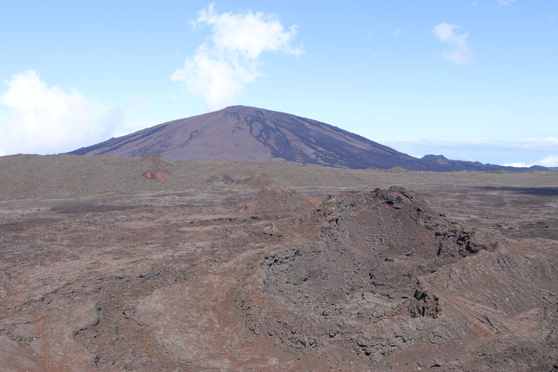 Dans un troisième temps on commence à monter le long du cône, qu’on contourne par son versant Nord-est. La montée est régulière et pas spécialement difficile, si ce n’est qu’on marche dans la roche et que le sol est parfois un peu instable. Quant à la végétation, elle est quasi-inexistante. En se retournant, on profite d’une vue de plus en plus large sur l’enclos parsemé de petits cônes, les sommets au loin (deux lignes de remparts, puis le Piton des neiges et le Grand Bénare qui dépasse), puis sur les coulées et l’océan indien quand on aborde le flanc Est.