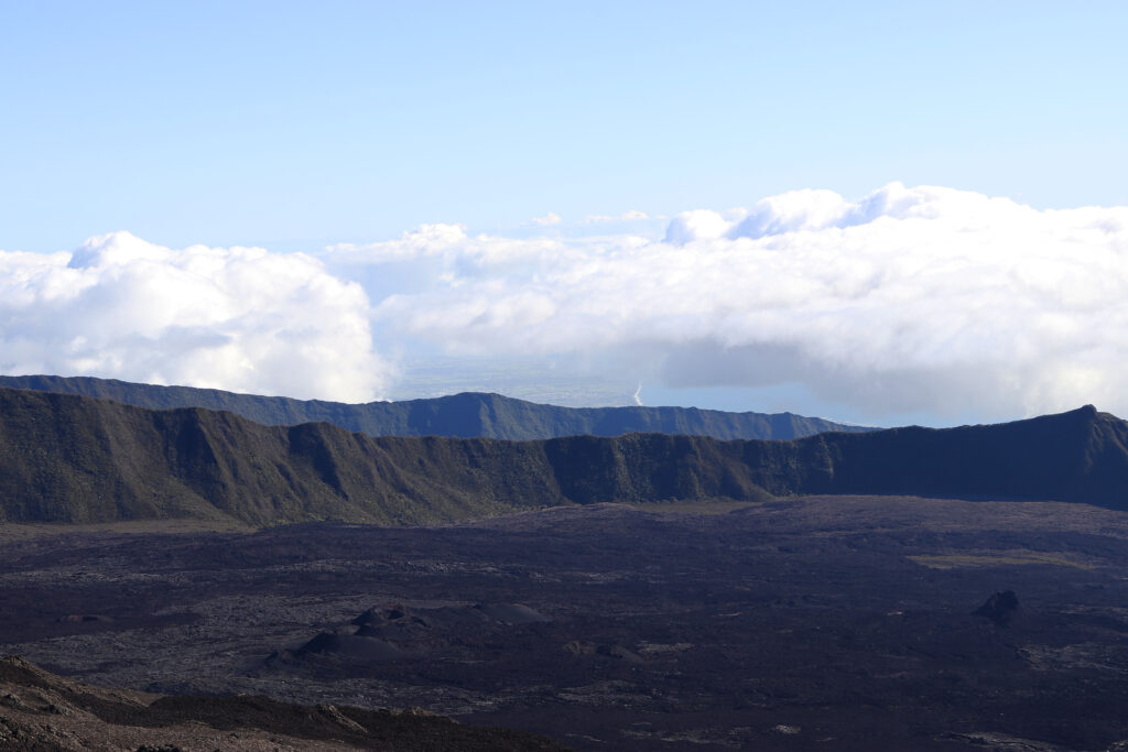 Enfin après 2h30 on atteint le balcon Dolomieu : la vue est plongeante sur le cratère profond et de l’autre côté sur l’océan ou plutôt pour nous sur la mer de nuages : le tout est magnifique !