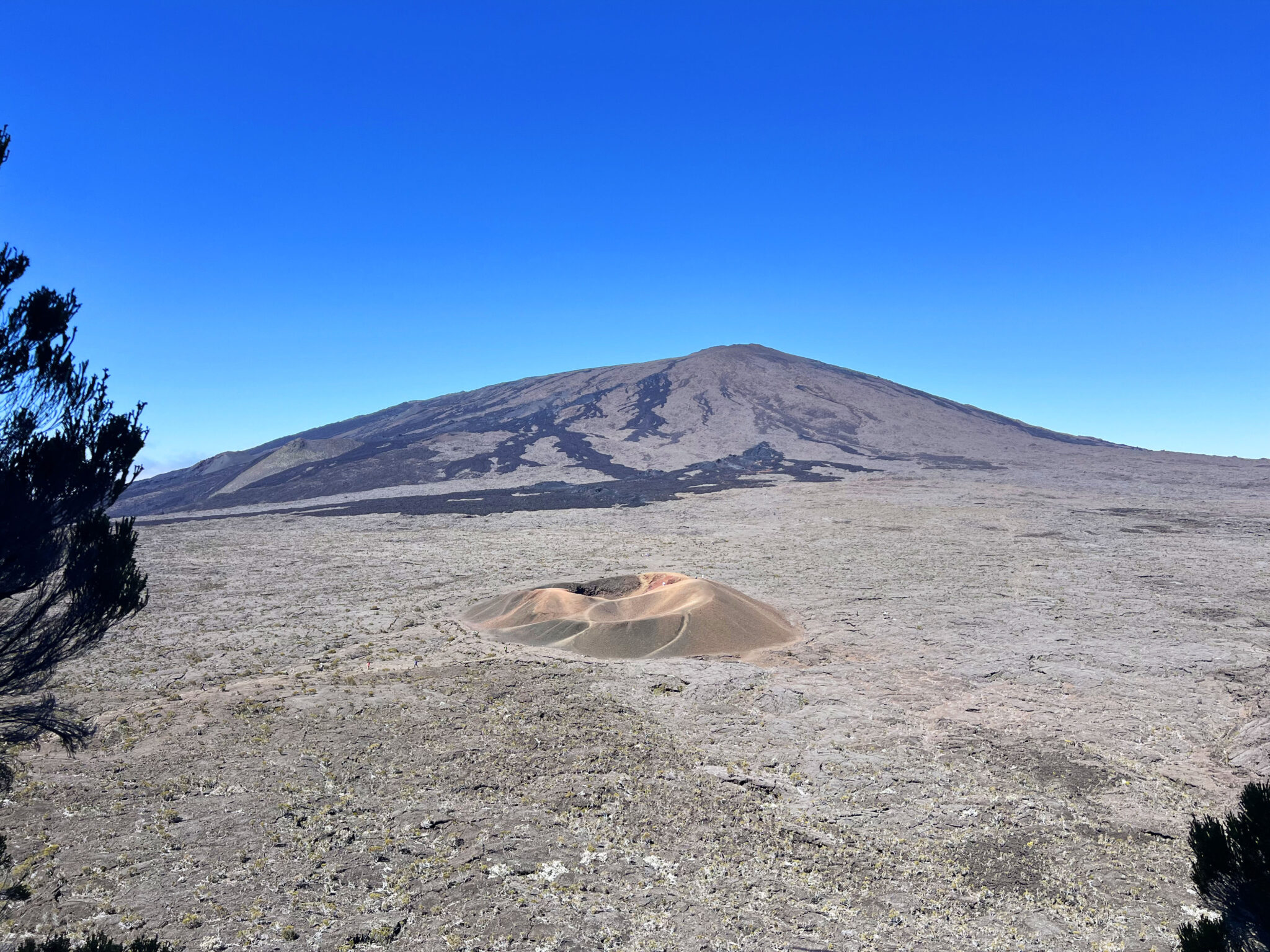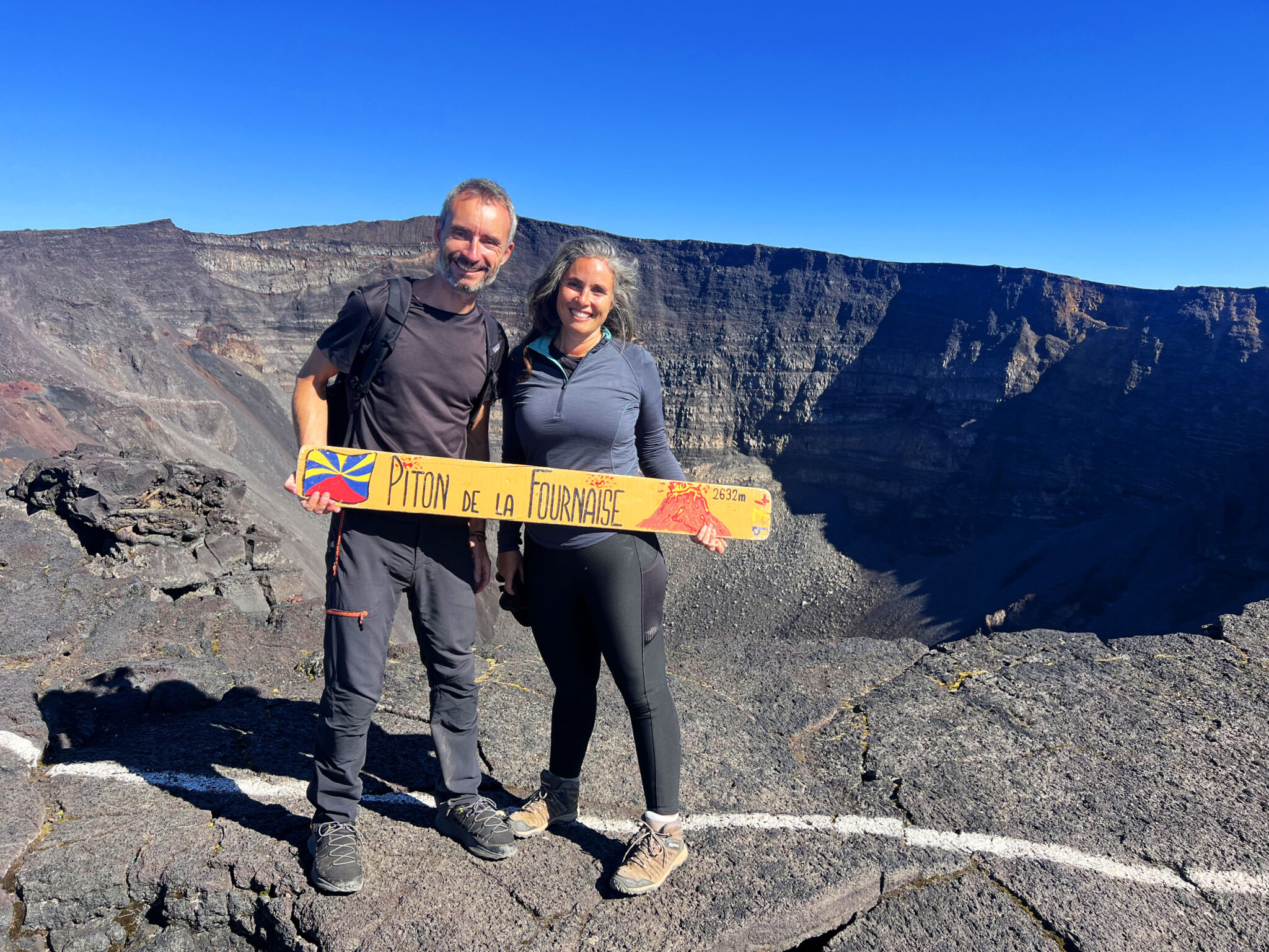 Le volcan du Piton de la Fournaise est l’un des emblèmes de La Réunion : sommet du coin sud-est de l’île, il culmine à 2632 mètres… du moins à ce jour, car chaque éruption peut changer la donne ! La dernière remonte à août 2023, ce qui est plutôt ancien et on attend la prochaine : il est actif ce piton ! Quand il explose c’est l’attraction sur l’île, volcan la pété !, tout le monde vient assister au spectacle, de préférence de nuit, et dans ces moments-là ça bouchonne sur la route du volcan ! Pour notre part on l’a vu au calme, dommage pour le spectacle des éruptions mais ça nous aura permis d’y randonner tranquilles, et évidemment de grimper à son sommet.