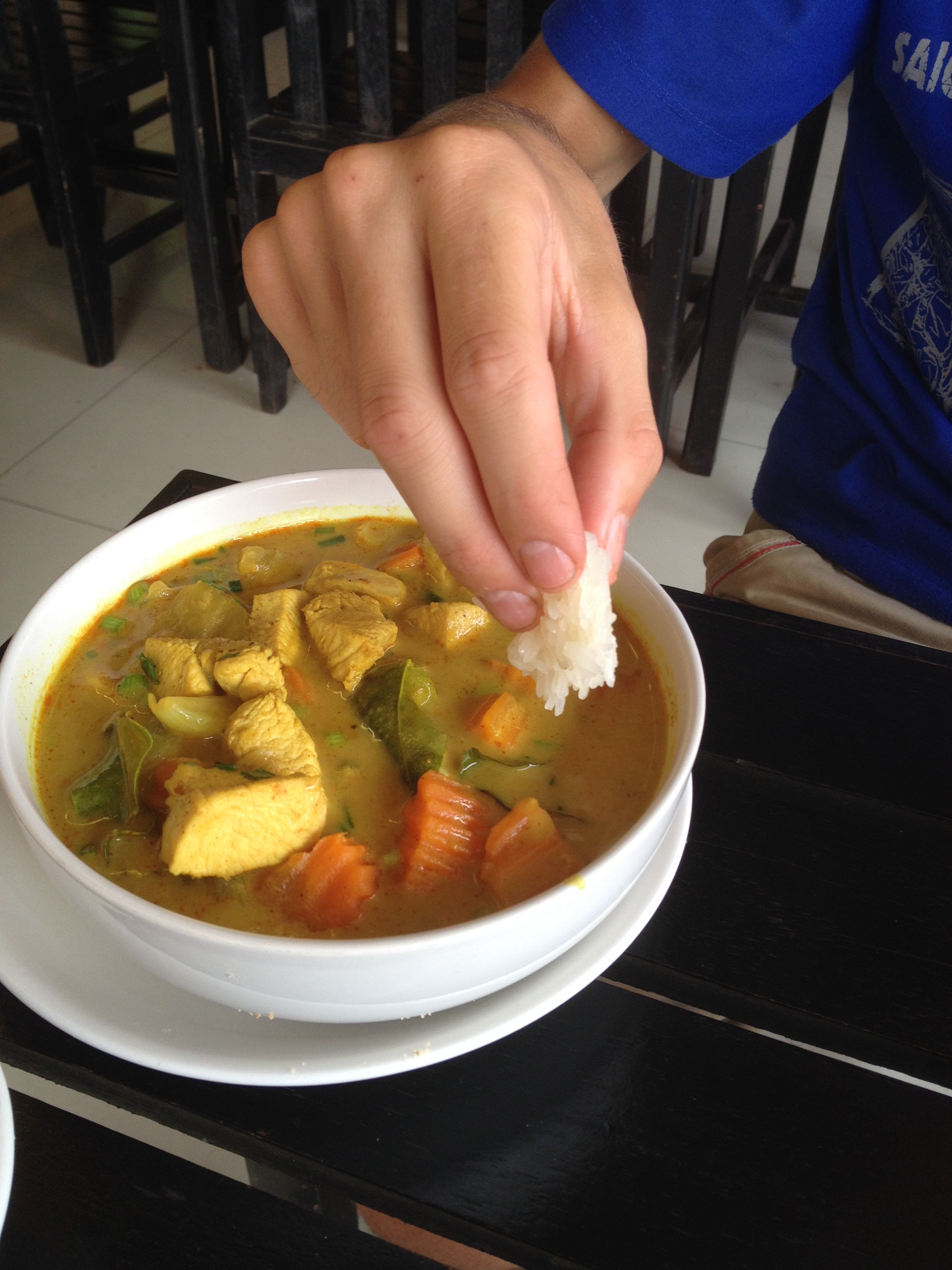 Certainement l’un de nos plats préférés, le lao curry : petits légumes croquants (poivrons, oignons, tomates), ananas et viande de porc, poulet, bœuf ou canard (assez présent dans la cuisine laotienne), parfaitement relevés par la sauce lait de coco – curry qui fait toute l’originalité du plat : un pur délice !