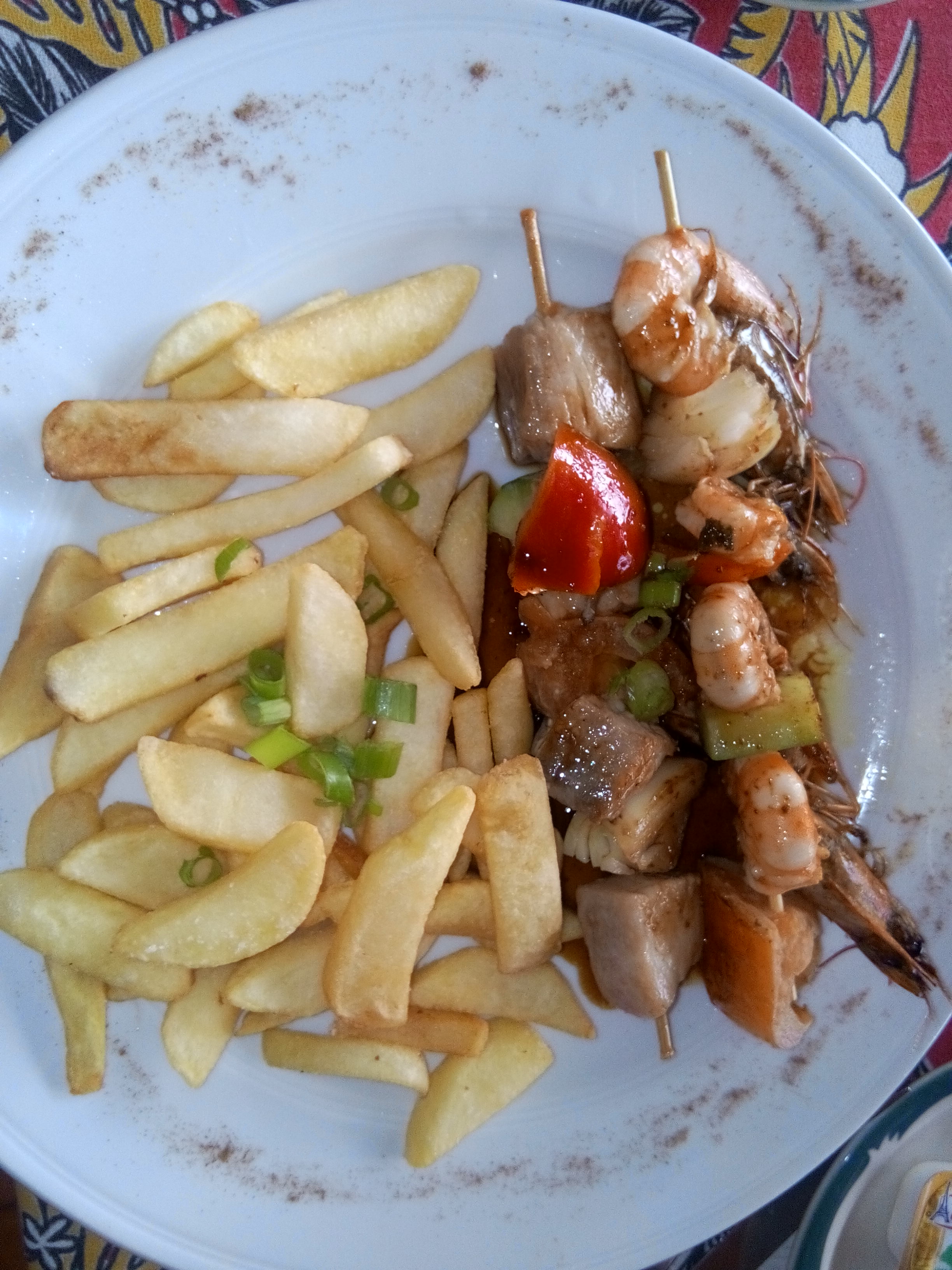 Enfin, côté dessert, on trouve plein de très bons fruits (ananas, papaye, ainsi qu’un fruit jusqu’ici inconnu pour nous, le Mangoustan, dont le goût rappelle la pêche mais en plus acidulé), et des gâteaux de noix de coco bien bourratifs !