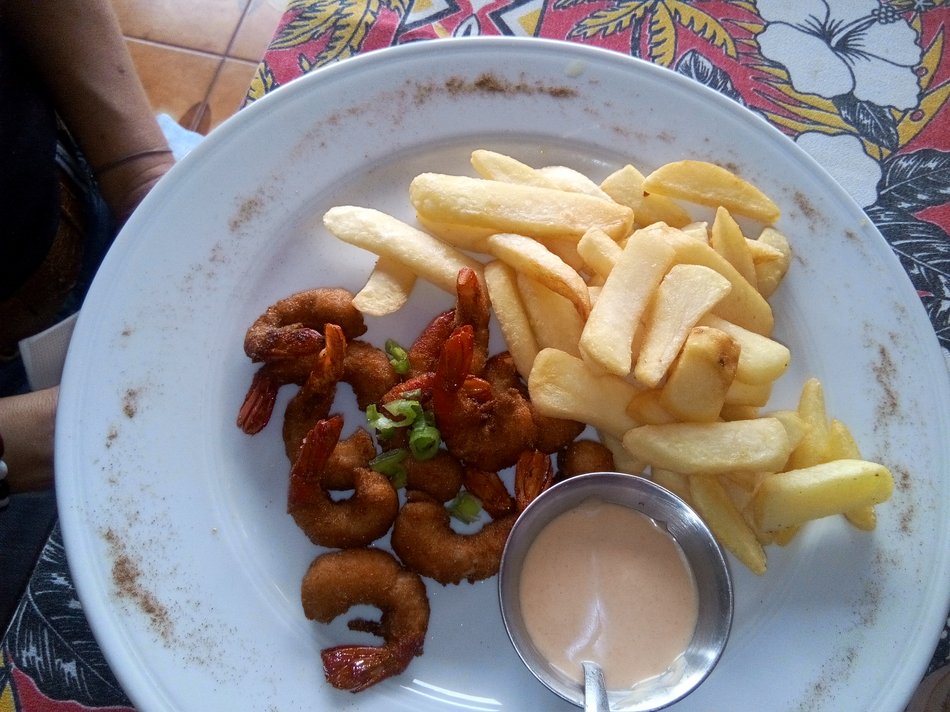 On trouve également un poisson local appelé le Mahi-Mahi, qu’on peut par exemple goûter avec une petite sauce à la vanille, divers poissons de lagons ou encore de l’espadon. Les crevettes (qu’on appelle ici les « chevrettes » s’agissant des crevettes d’eau douce) sont aussi très bonnes, cuites, panées, et mêmes crues !