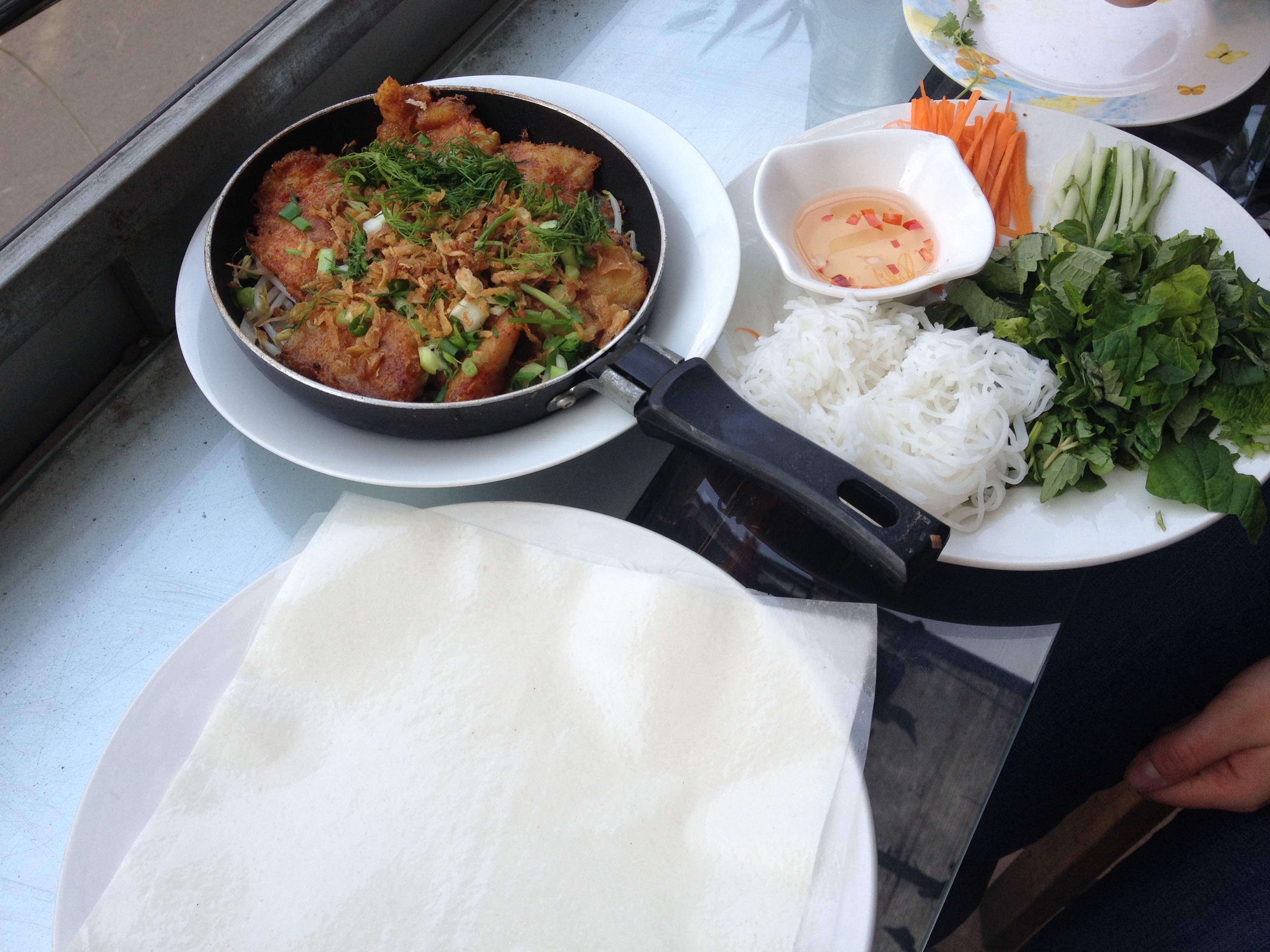Spécialité de Hoi An, dans le centre du Vietnam, un petit ravioli à base de farine de riz fourré à la crevette, portant le nom poétique de « rose blanche ». On a beaucoup aimé aussi ! A Hué, dans le centre également, on a pu goûter le Banh Khoai : c’est une petite crêpe garnie de crevettes, porc, œuf et légumes (soja notamment), dont on prend de petits morceaux, qu’on roule dans de la salade et de la menthe, et qu’on trempe dans la sauce à la cacahuète. Gras, mais excellent !