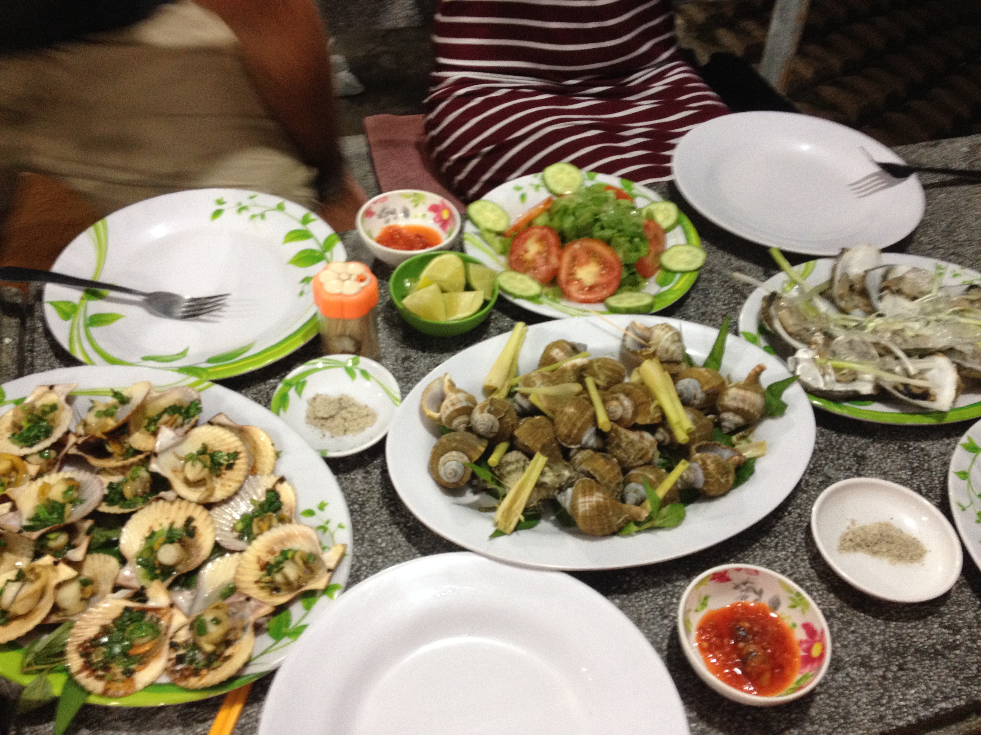 A Mui Né, sur la côte sud du pays, on se fait un festin de fruits de mer au barbecue. Multitude de coquillages, dont certains ressemblent à des petites Saint-Jacques, gambas, calamars, tous marinés et relevés de délicieuses sauces aigre-douces. Un régal !