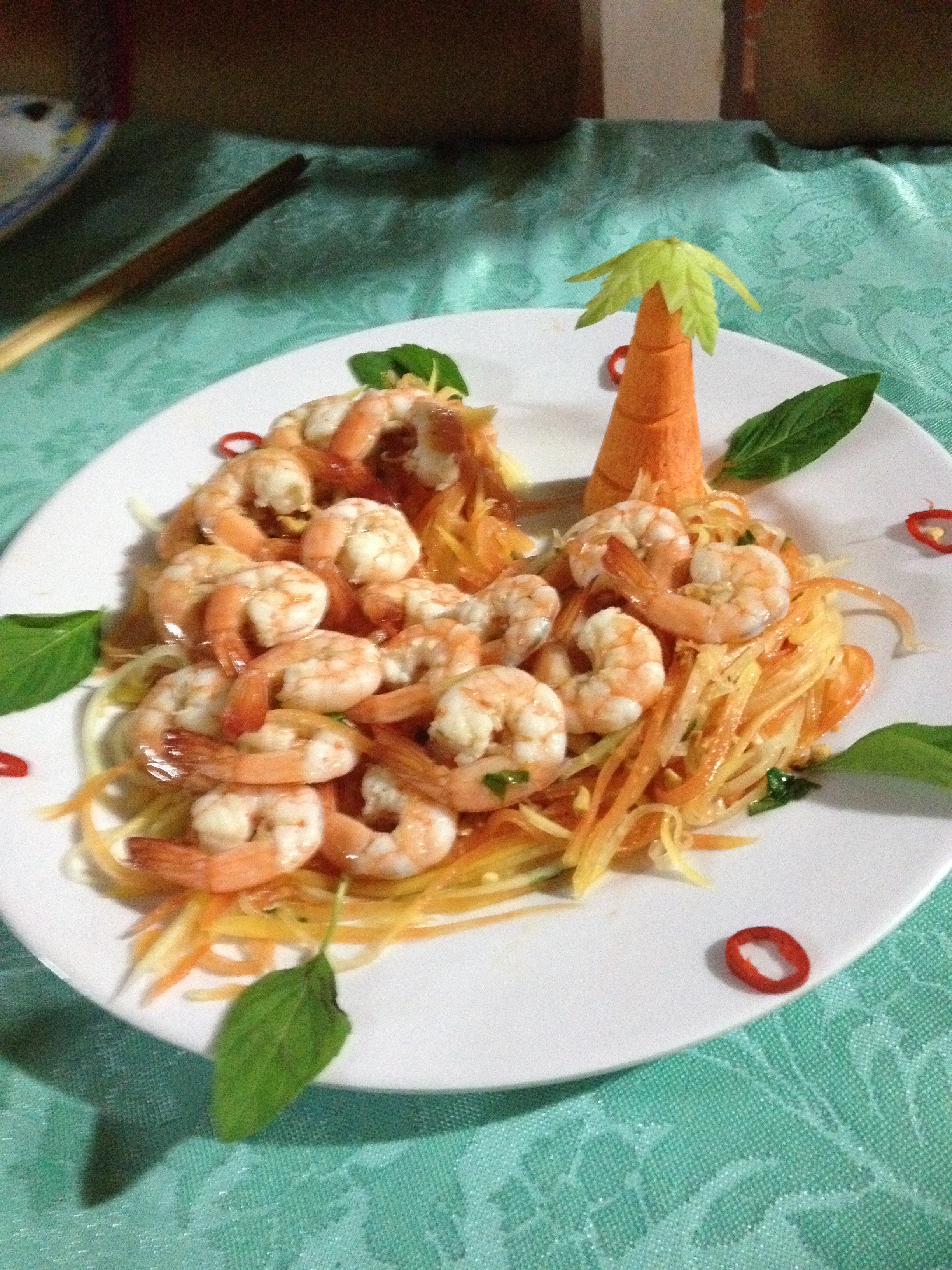Dans le Mékong, on déguste le savoureux poisson éléphant pêché dans le Delta, un plat typique de la région, qu’on accompagne d’une salade de papaye aux crevettes, adorablement présentée.