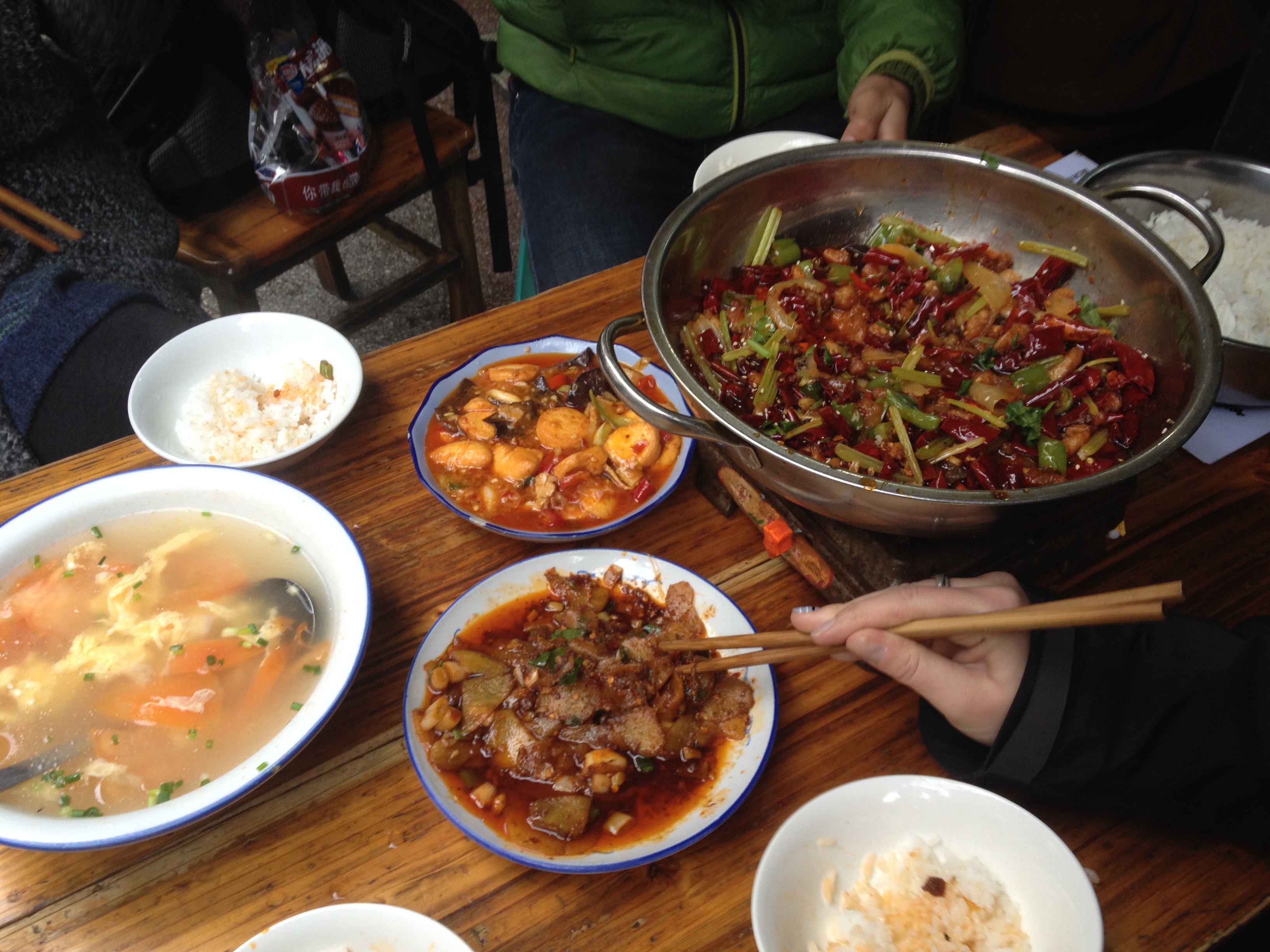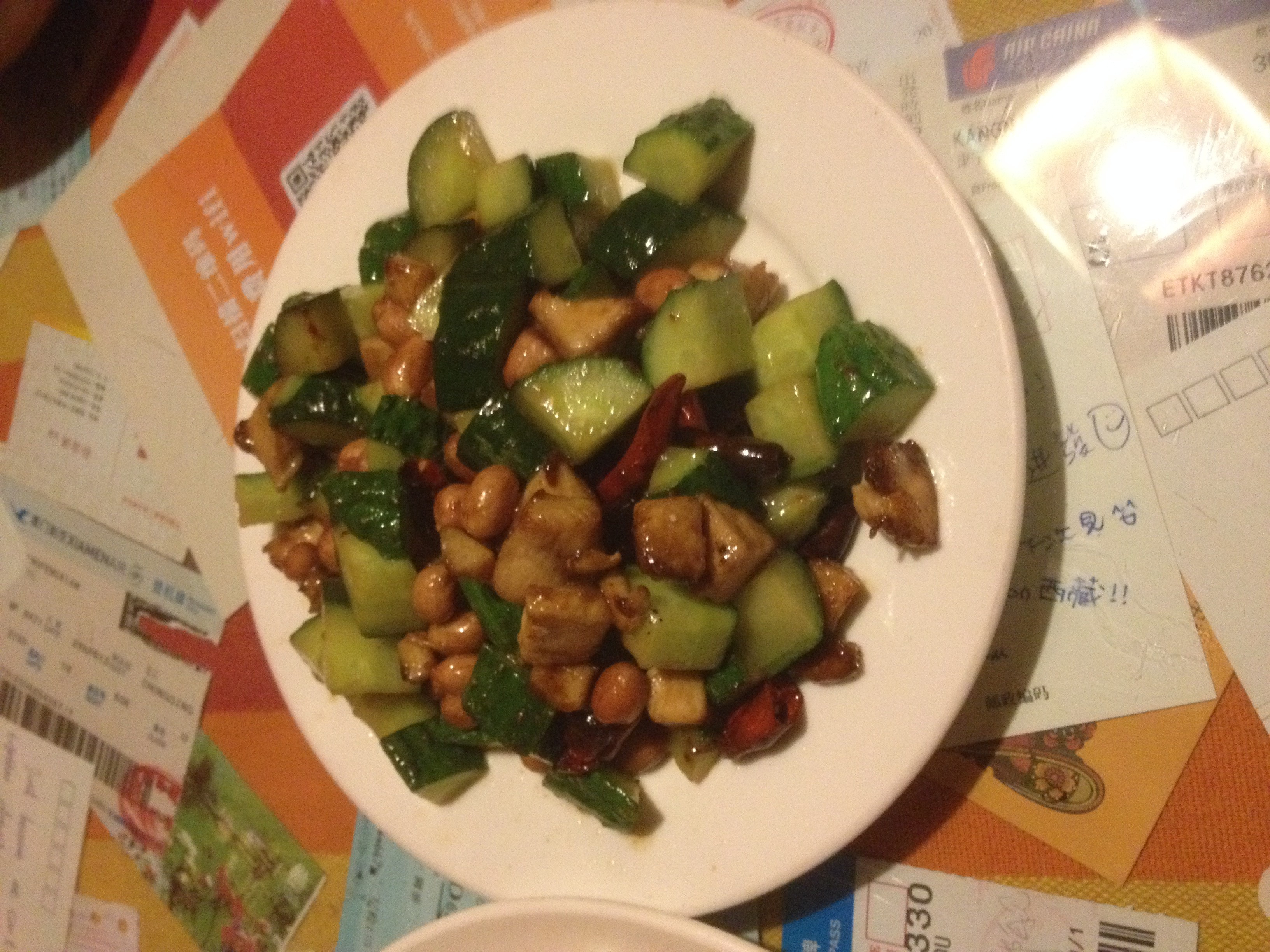 Dans le Sichuan, outre la fondue, on déguste le Gong Bao Ji Ding, un plat de poulet au concombre (cuit) pimenté et aux cacahuètes grillées, mais aussi, avec Jason, une autre version de poulet pimenté, accompagné de flans de tofu aux champignons noirs dans une sauce aigre douce et de patates au paprika (et au piment, évidemment, faut pas déconner c’est le Sichuan ici quand même !!).