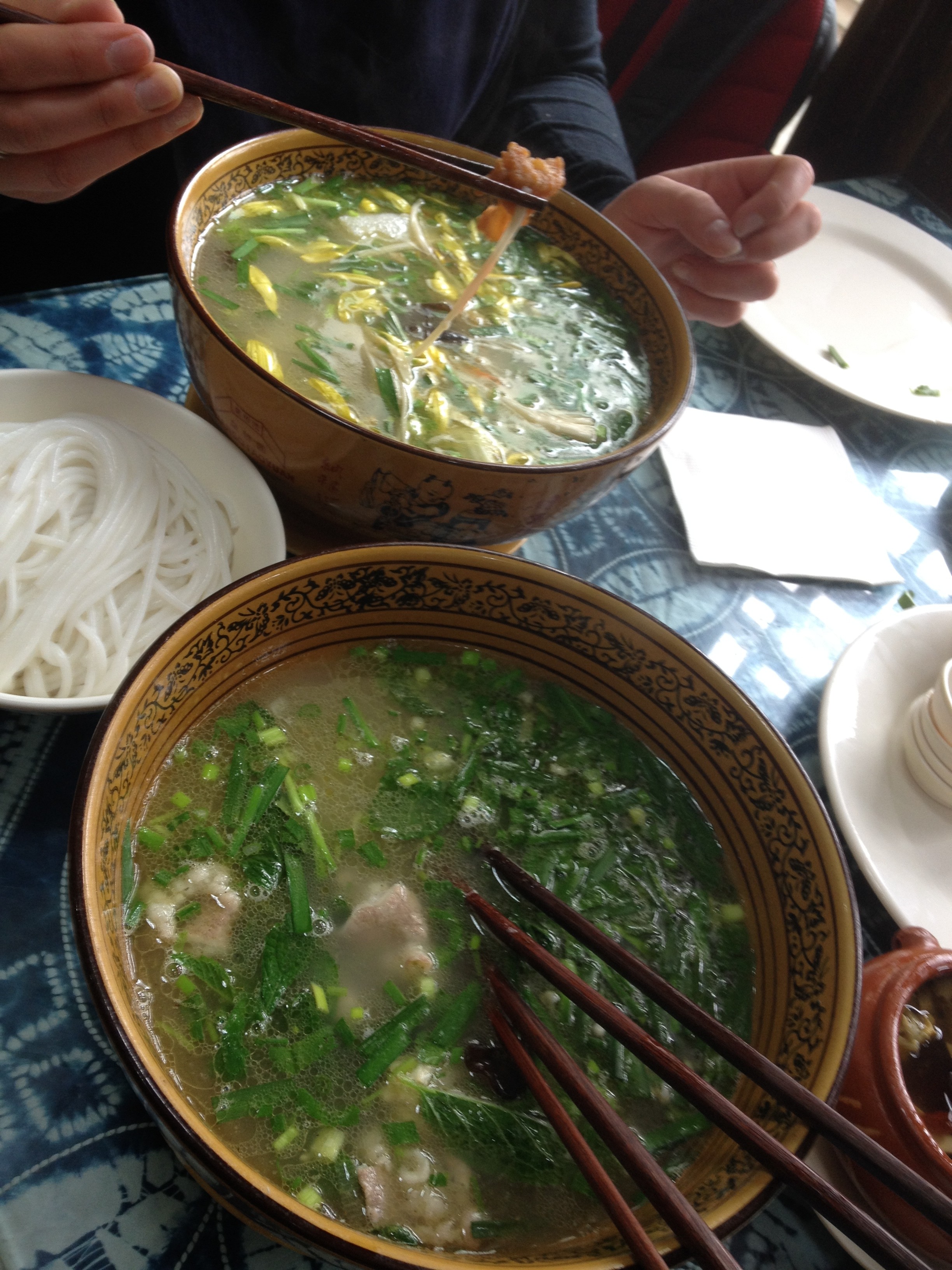 A Kunming, dans le Yunnan, la grande spécialité porte un nom rigolo : les Nouilles qui sautent le pont. Pourquoi ce nom ? La légende dit que le plat aurait été inventé par une chinoise qui l’apportait tous les jours à son mari qui s’était retiré sur une île pour y méditer. L’épouse dévouée traversait donc quotidiennement le pont avec son plat de nouilles (on parle du plat, pas du mari) pour nourrir son insulaire de conjoint. D’où le nom de nouilles qui « sautent » le pont. Bref ; comment se présente ce plat ? On nous apporte un grand bol de bouillon parfumé aux herbes, et, à part, toute une série de garnitures à plonger dedans (lamelles de viandes, de poisson, de légumes, des sauces et épices), un peu comme une fondue. Encore à part, les nouilles, à ajouter à tout ça. Ensuite, bonne pêche !