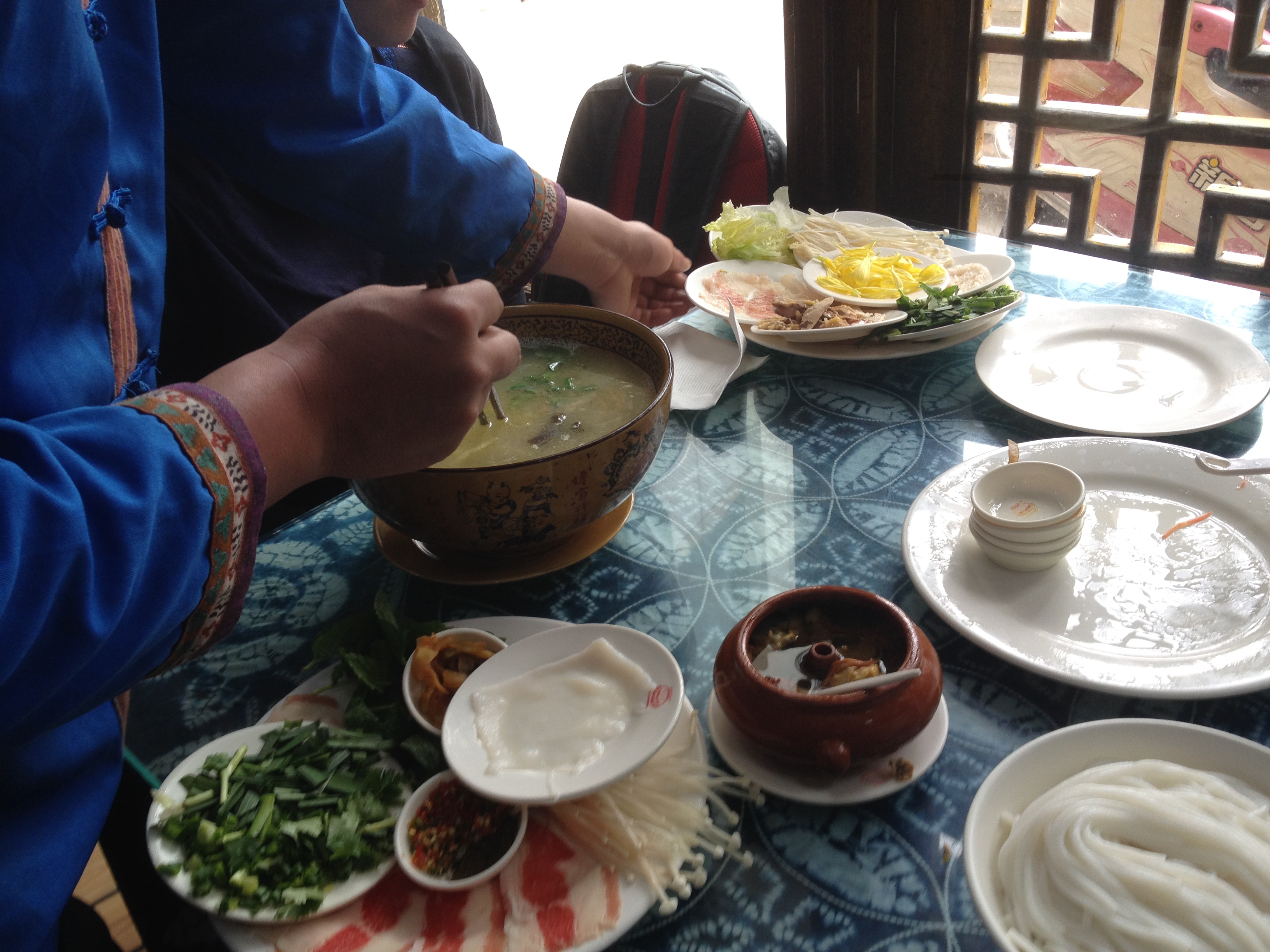 Une fois le choix fait, baguettes en main, on peut se lancer dans la dégustation des plats, qui arrivent tous en même temps (pas de rythme entrée, plat principal, etc), généralement sous l’œil amusé des chinois. Assez souvent, le patron se fait « protecteur » à notre égard : on met beaucoup de soin à nous montrer comment le plat s’assaisonne, se prépare, comment s’en sortir avec la fondue…