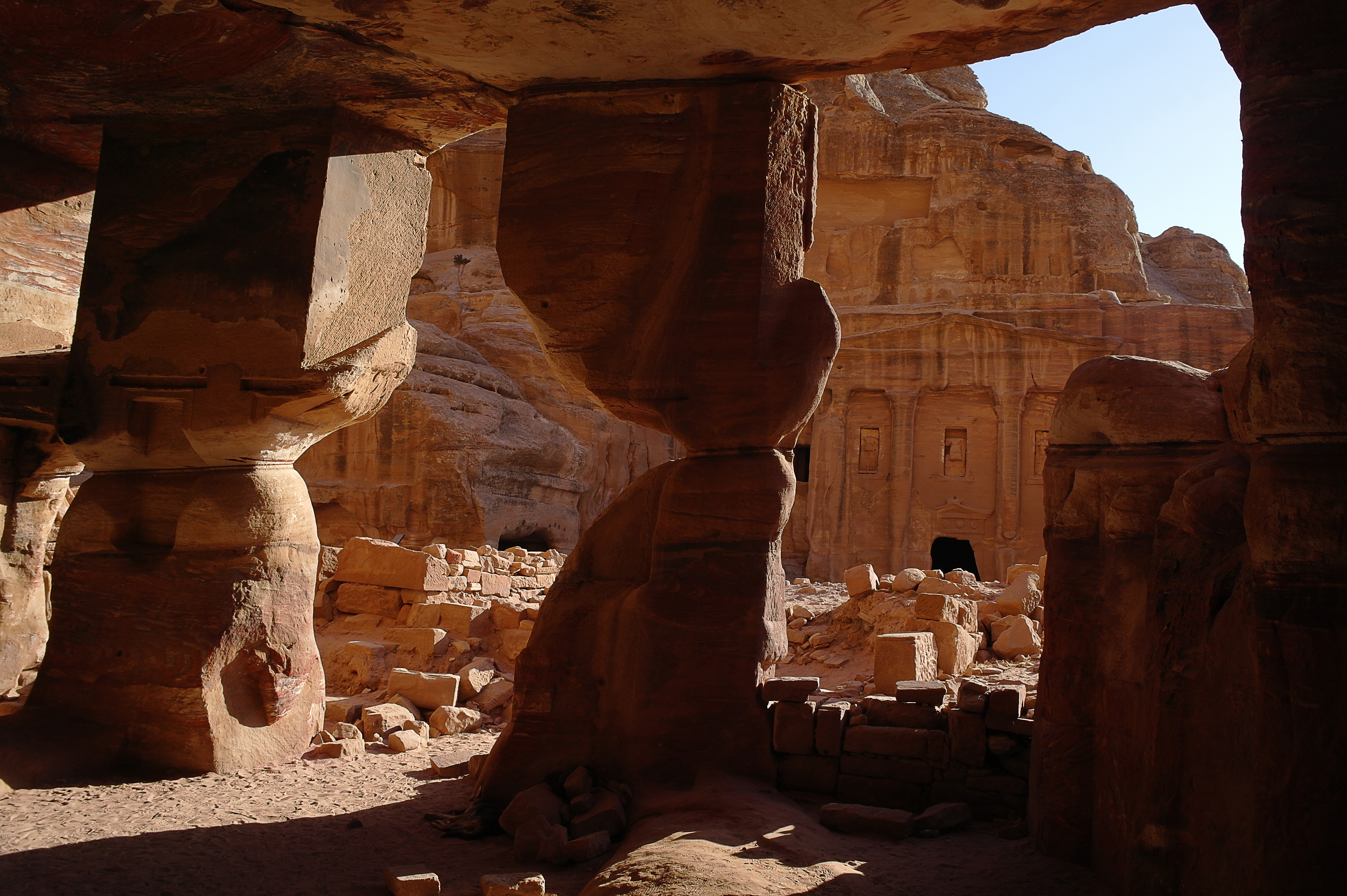 On arrive ensuite au niveau des tombes royales, un alignement de hautes façades abritant des tombeaux de personnages importants de l’époque nabatéenne. On peut entrer dans certaines et profiter d’un peu de fraîcheur (et c’est pas du luxe !).