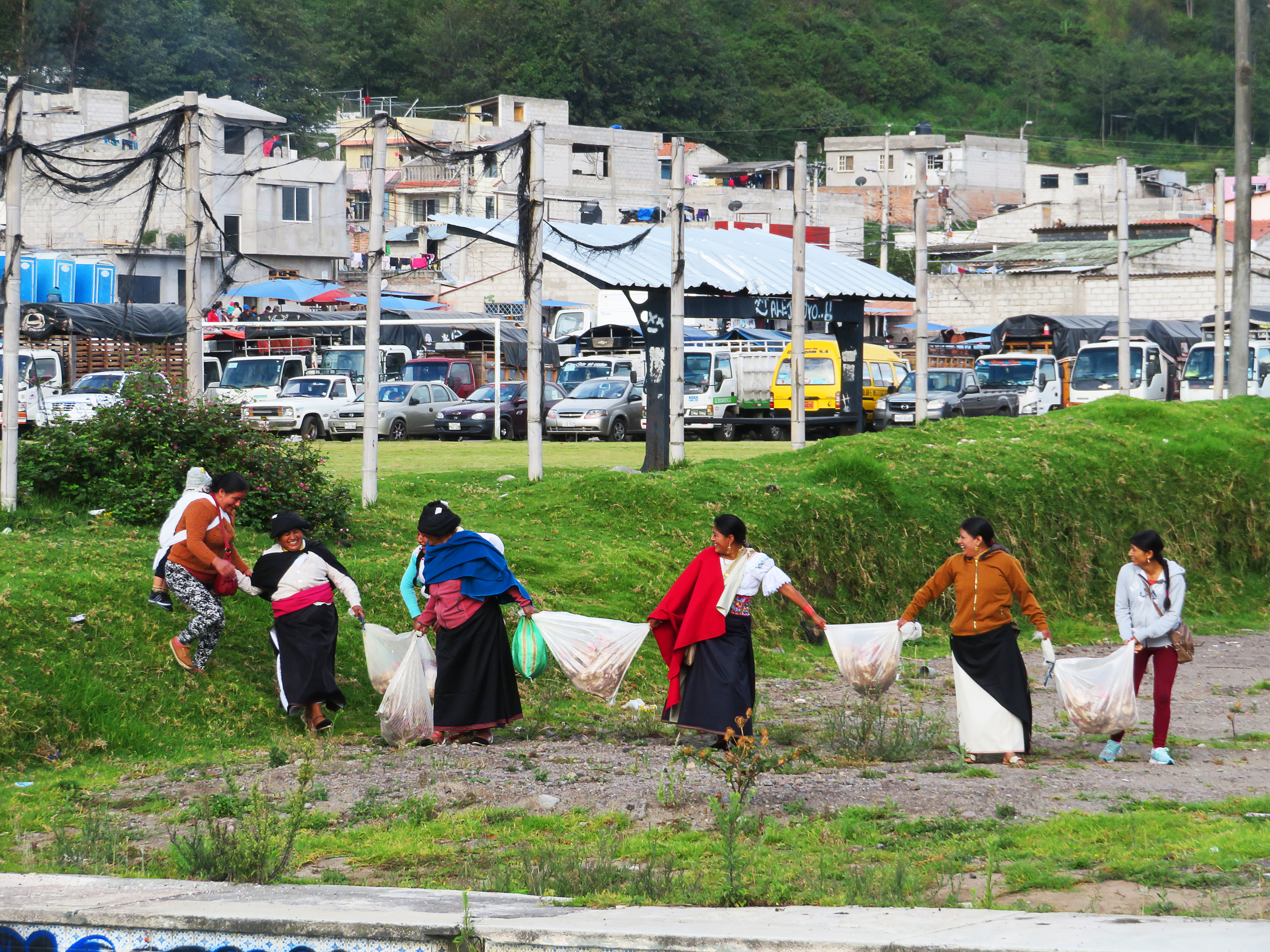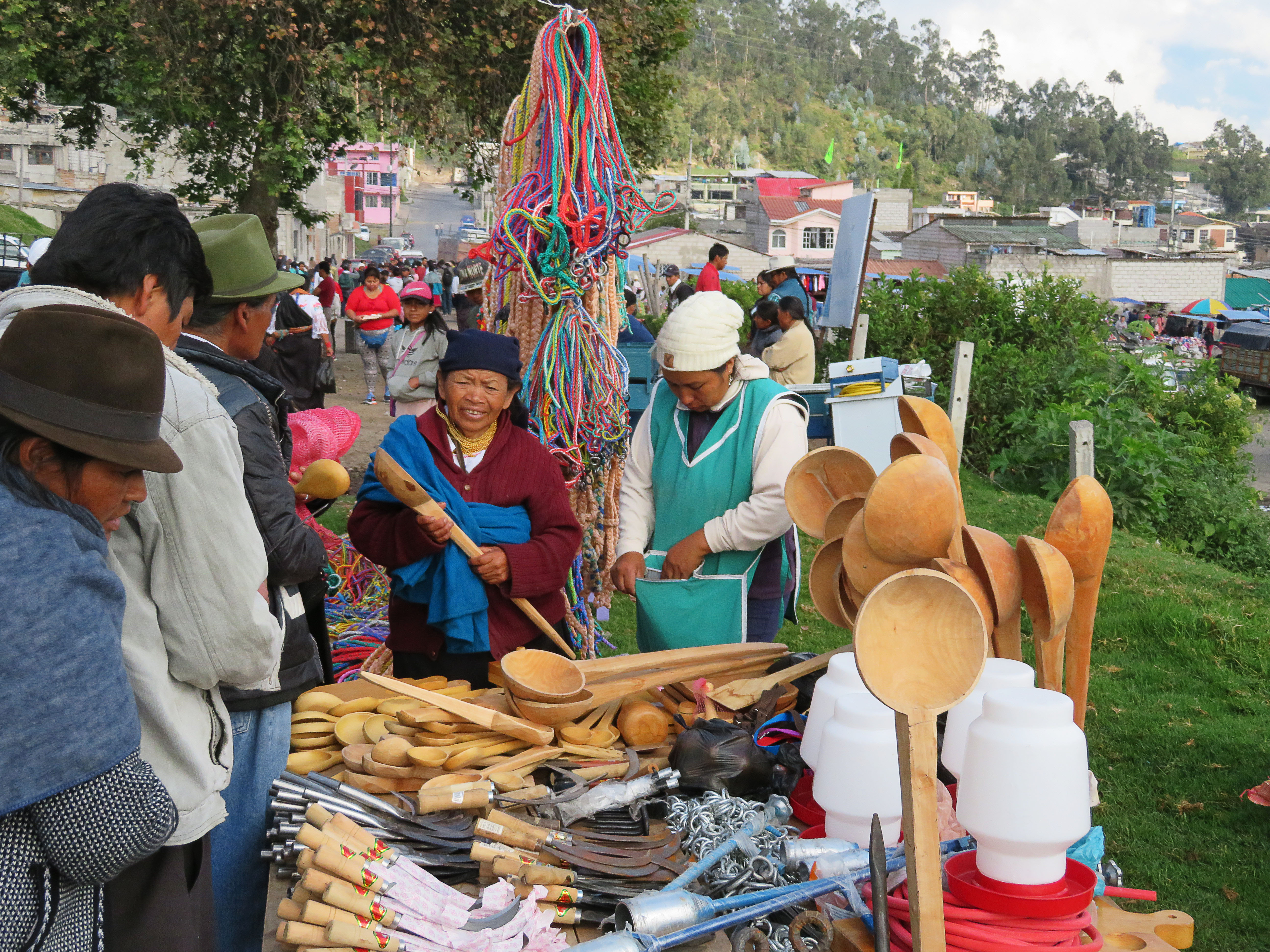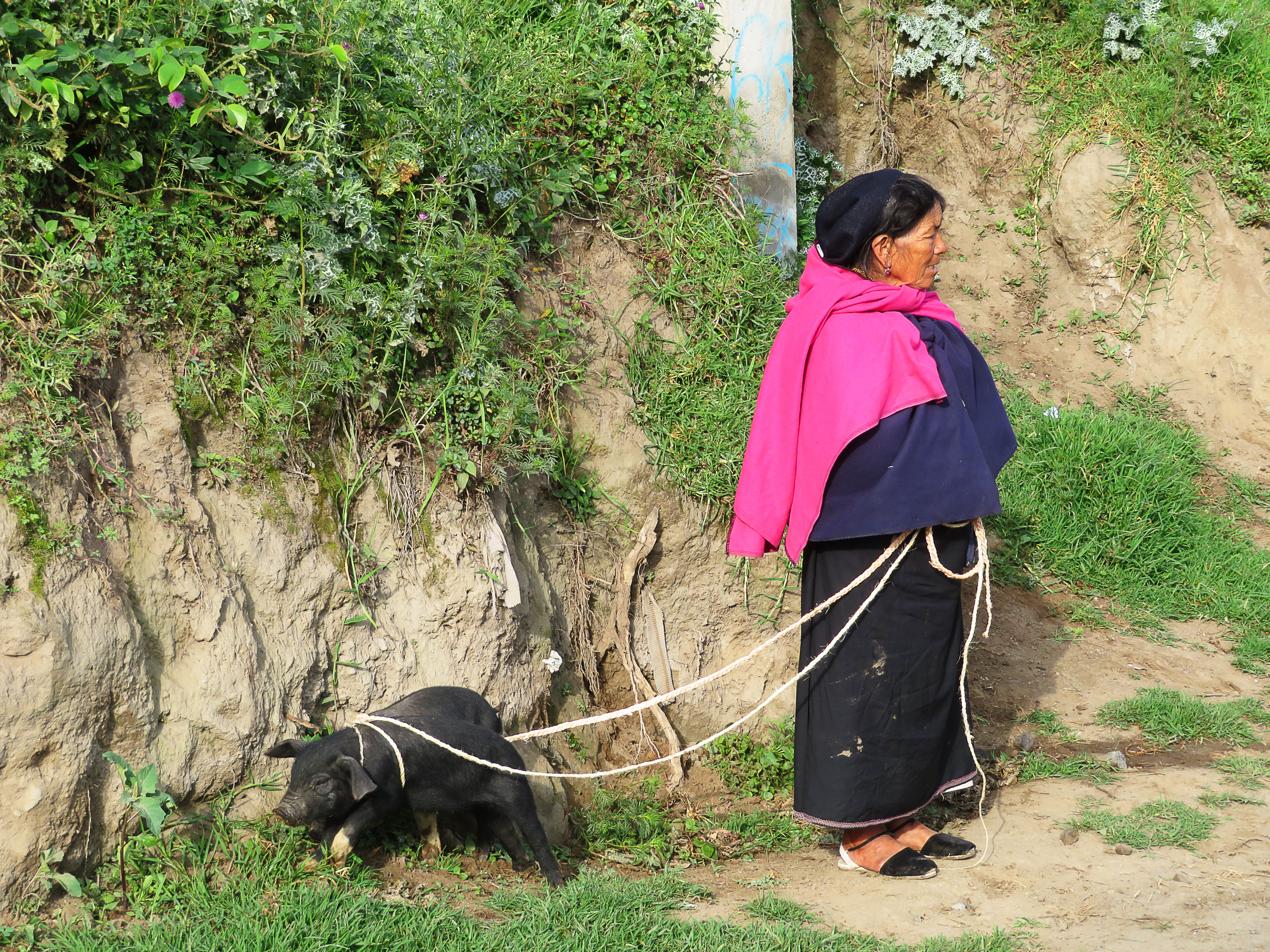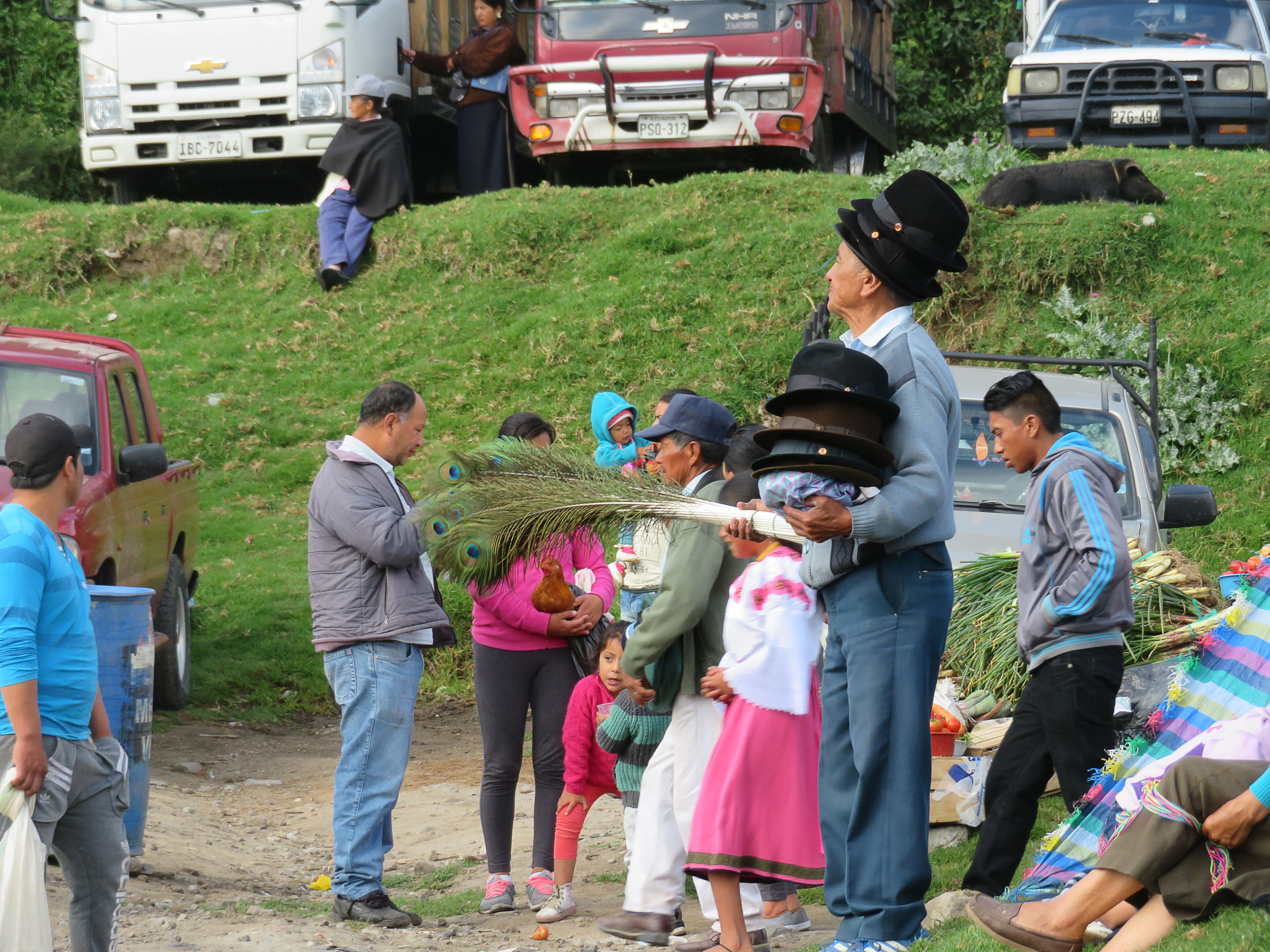 Après trois agréables jours à Quito, on prend la direction d’Otavalo, un village situé deux heures plus au nord. Otavalo est surtout connu pour son grand marché du samedi matin, et on arrive donc la veille pour être sur place et ne pas rater le marché aux bestiaux qui se tient en bordure du village entre 6h et 9h (eh oui, il faut se lever tôt !). Pour l’occasion, les habitants de la région (en majorité des indiens arborant leurs belles tenues traditionnelles) viennent nombreux et il y règne une forte animation. Pour des non-initiés comme nous c’est effectivement tout un spectacle : c’est une foule qui se presse ici, on négocie fermement la dizaine de cuy ou la caisse de poussins tandis que passe une grand-mère traînant ses trois cochons ou qu’un groupe fait embarquer quelques vaches dans son camion.