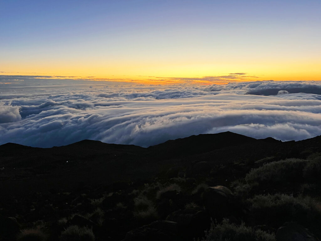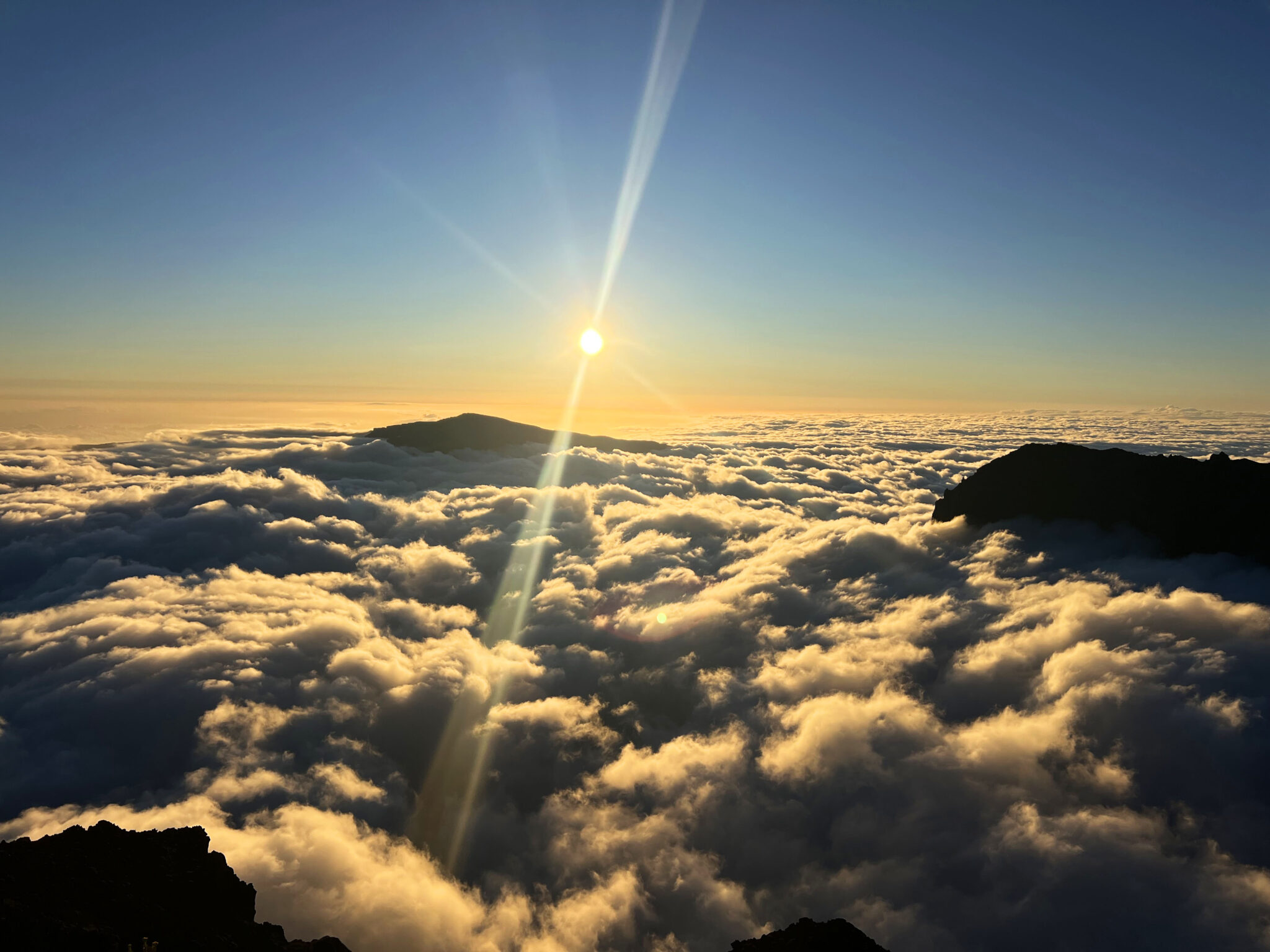 On termine comme on peut en mode un pied devant l’autre et la tête dans les bâtons, et on boucle cette deuxième partie en 2h, juste à temps pour le coucher de soleil sur la mer de nuages et les sommets qui dépassent. Le paysage est magnifique, on sait pourquoi on a fourni tous ces efforts pour monter !
