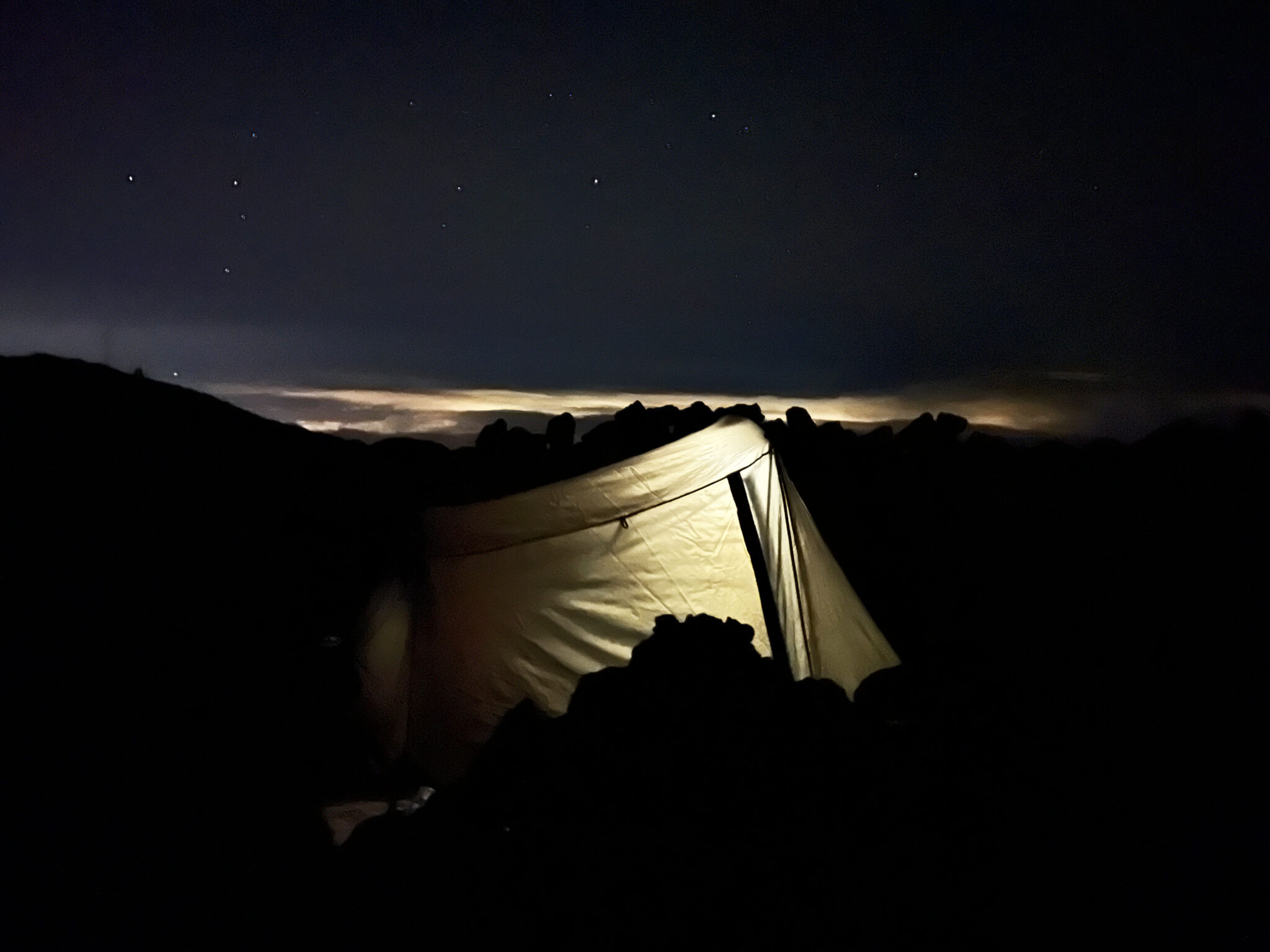 Il n’y a pas beaucoup de monde en haut, seulement quelques campeurs, et des traileurs qui repartent en courant et vont faire la descente de nuit. On installe vite fait bien fait notre bivouac avant la nuit dans un des cercles de pierres : on appréhende un peu le froid, mais on est équipés : couverture de survie par terre pour doubler le tapis de sol, bons matelas et duvets avec drap de soie et bouillote artisanale dans des bouteilles d’eau, vêtements chauds, au final ça passera super bien d’autant qu’on a la chance de tomber sur une suit sans vent ! Un petit planteur pour se récompenser, un repas léger et dodo, la nuit sera courte mais correcte !