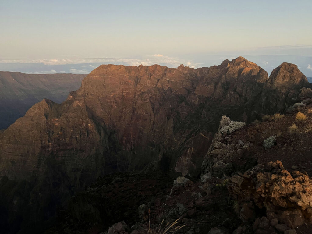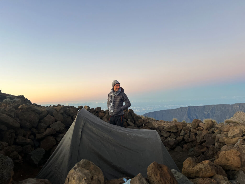Le matin à partir de 4h30 c’est l’autoroute, il y’a foule au sommet, tout le monde est bien réveillé après avoir enchainé des heures de marches, et bien sûr il y a toujours 2-3 boulets avec des drones bruyants. On se cale au niveau de notre tente qu’on a plantée à quelques dizaines de mètres à l’écart du sommet, c’est plus calme pour apprécier le lever de soleil côté volcan Piton de la Fournaise. La vue (à 360 degrés) est plus dégagée que la veille (c’est toujours mieux le matin à La Réunion), sur les cirques et jusqu’à la mer, mais quand même pas au point de porter jusqu’à l’île Maurice comme certains jours très clairs. Le spectacle est époustouflant et on prend le temps d’en profiter avec un café et le petit-dej.