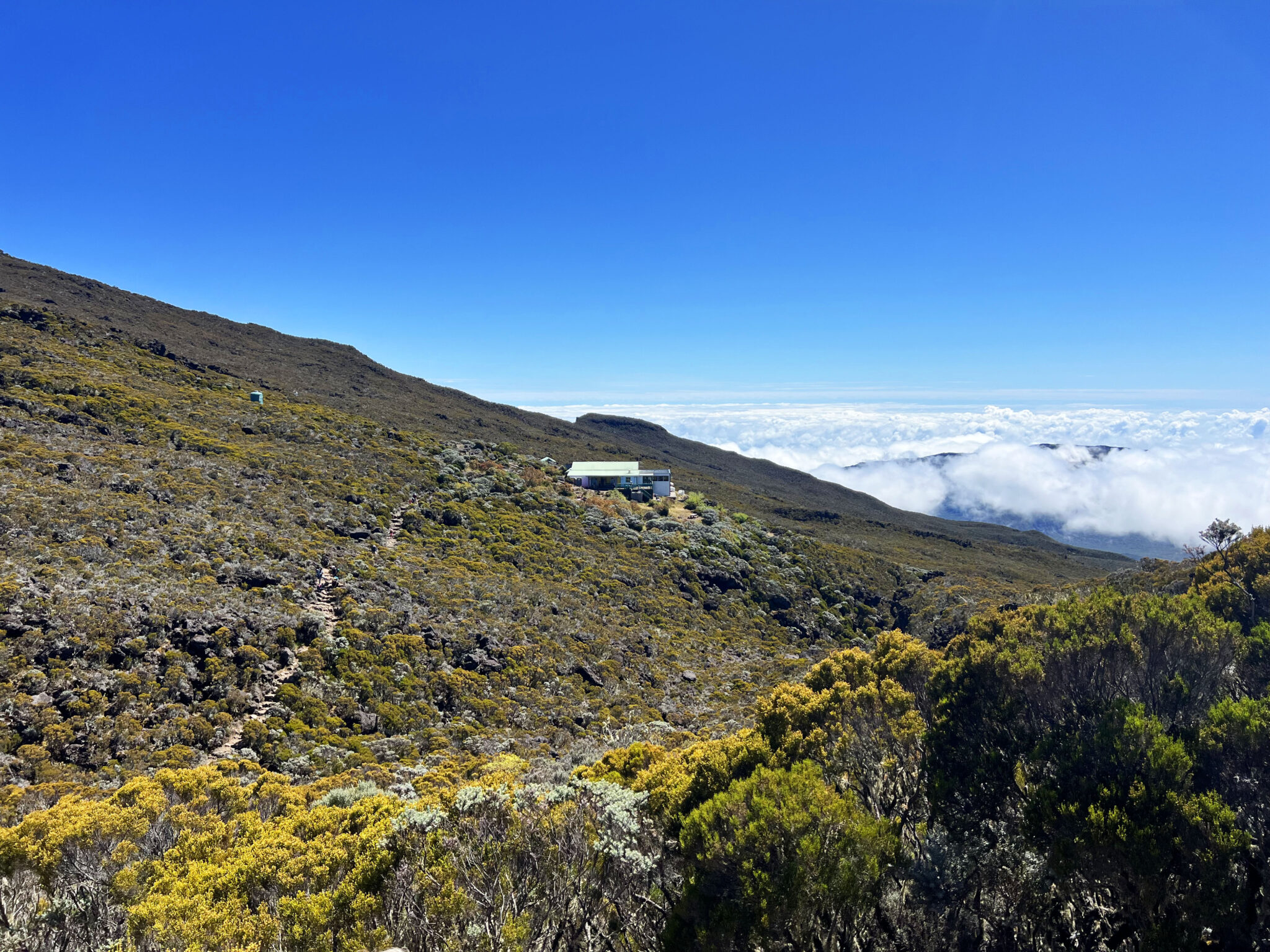 On passe ensuite par une phase moins raide (c’est très relatif quand même), avant et après l’aire de repos qui marque plus ou moins la mi-parcours de cette première phase (à presque 2000 mètres d’altitude), puis on attaque un gros mur dans la dernière partie vers le gîte (de 2100 à 2500 mètres d’altitude), avec carrément des escaliers métalliques dans certaines portions, et un enchaînement de coudes ultra raides. Cette portion est fatigante, les sacs pèsent bien sur les épaules. Après 3h30 on est contents d’arriver enfin au col et au gîte (où on fait la jonction avec les sentiers en provenance d’Hell-Bourg et Bourg Murat), on est sur la crête entre les cirques de Cilaos et de Salazie, à 2500 mètres d’altitude, avec le Piton des Neiges sur notre gauche mais dissimulé par les nuages. A ce stade on a monté 1100 mètres de dénivelé et il en reste 600 (quand même !) pour le sommet. On se fait une pause méritée au niveau du gîte (où il y a un peu de monde, ceux qui s’arrêtent pour la nuit et ceux qui continuent), mais pas trop longtemps car l’heure tourne et on préférerait éviter de finir à la frontale.