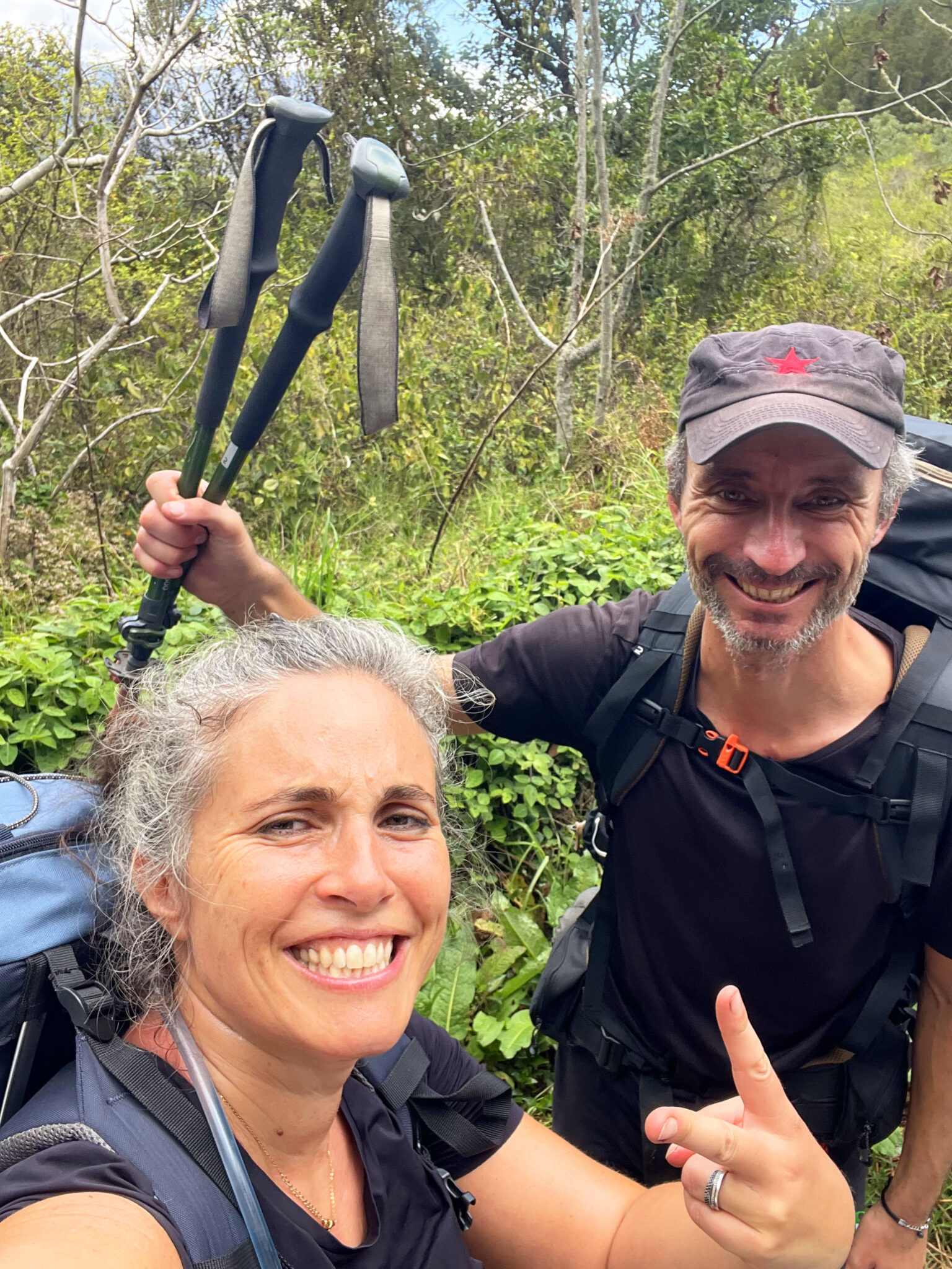 On sonne donc le départ au lieu-dit du bloc où on laisse la voiture pour la nuit (attention il y a eu des vols, il faut éviter de laisser des affaires à l’intérieur), sur le coup de 12h15, l’idée étant de marcher toute l’après-midi et d’arriver avant la nuit au sommet. On est assez chargés : 17 et 14 kilos (dont 8 d’eau au total), c’est un peu beaucoup !