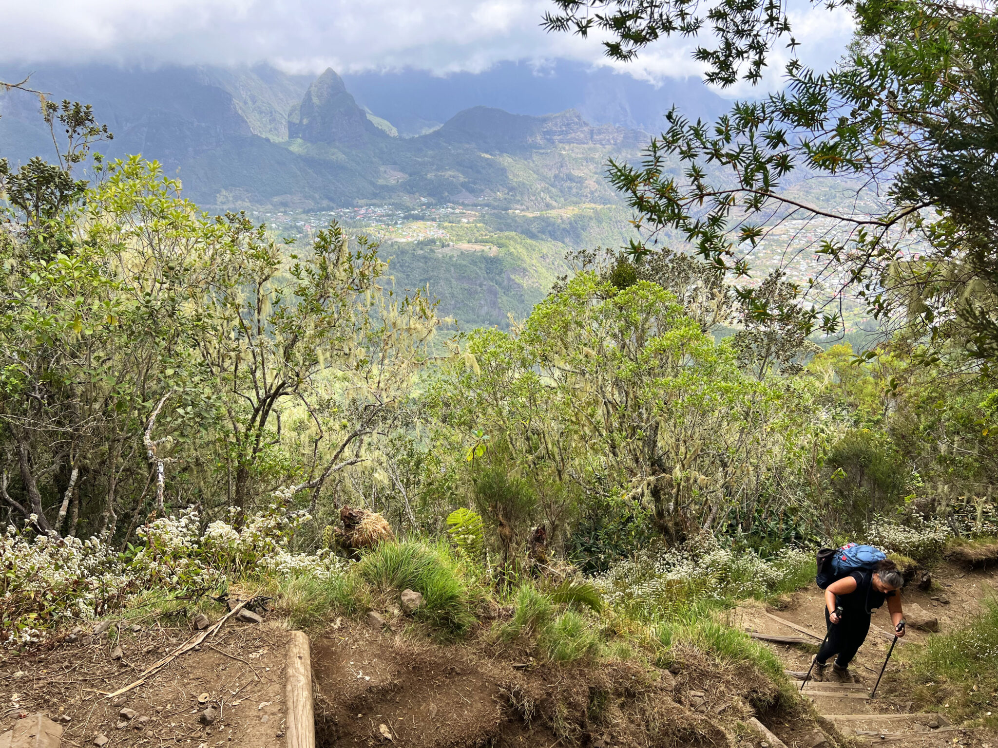 Ensuite il reste à redescendre par le même chemin que la veille. La partie jusqu’au gîte (1h15) est sympa, pas si dure en descente et avec une vue plus dégagée qu’hier qui nous permet de voir le volcan en face de nous et le cirque de Salazie sur notre gauche.
