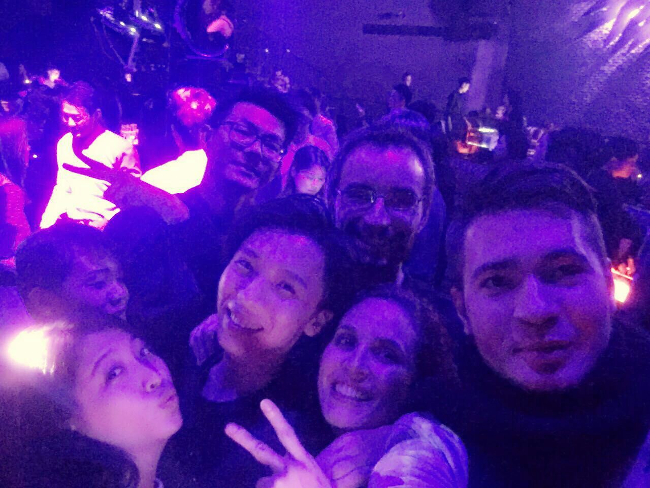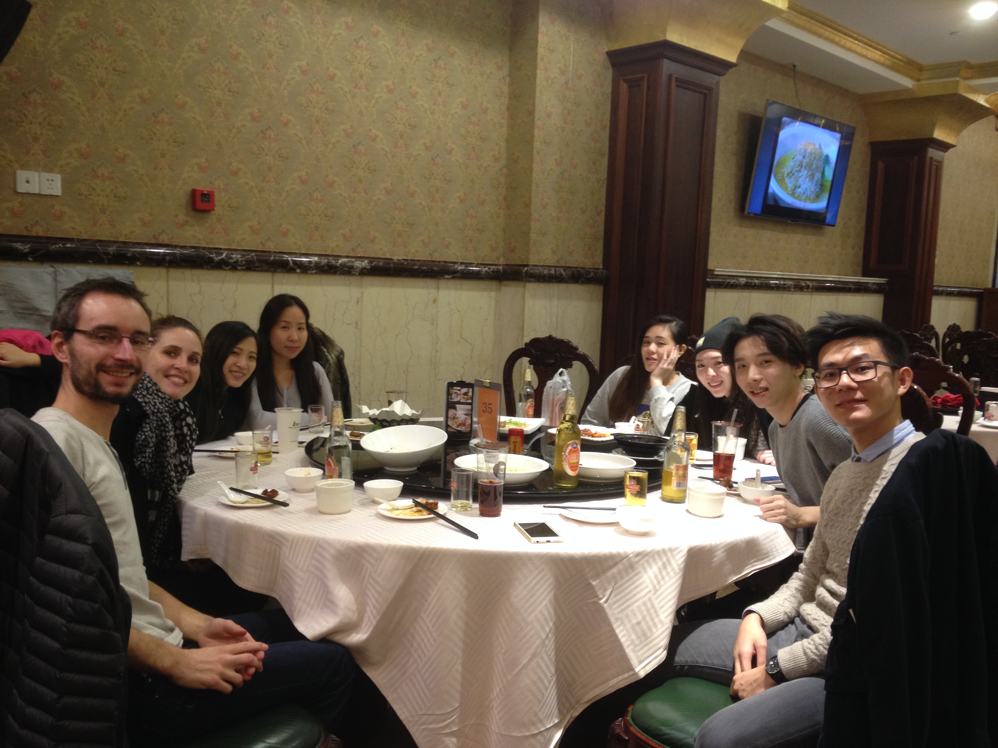 Le soir, on retrouve Romanda, Louis et Yann, et plusieurs autres de leurs amis (dont un Russe, Vadim, qui vient d’Oulan Oude qu’on a visité). Ils nous font découvrir le Shanghaï by night qu’on n’aurait surement pas connu seuls. Au programme des réjouissances : restau à la découverte des spécialités shangaiaises, pour un repas « à la chinoise », c’est-à-dire que des plats nombreux et variés sont commandés et mis en commun, sur le grand plateau tournant au centre de la table, et chacun pioche ce qu’il veut. On adore cette façon de faire, conviviale et qui permet de goûter plein de choses. Les chinois sont morts de rires quand on leur explique qu’en France, au restau chacun commande son plat pour lui et que tout au plus on se fait goûter un peu. Suite des évènements : bar étudiant où ils ont tous leurs habitudes et où les consos ne sont vraiment pas chères (ça n’est pas si courant à Shanghaï…), puis le lendemain nouveau bar en haut d’un building avec une super vue sur la ville et un petit tour en boîte histoire de prendre la température des nuits de Shanghaï, avant de rentrer à la maison… en Uber bien sur !