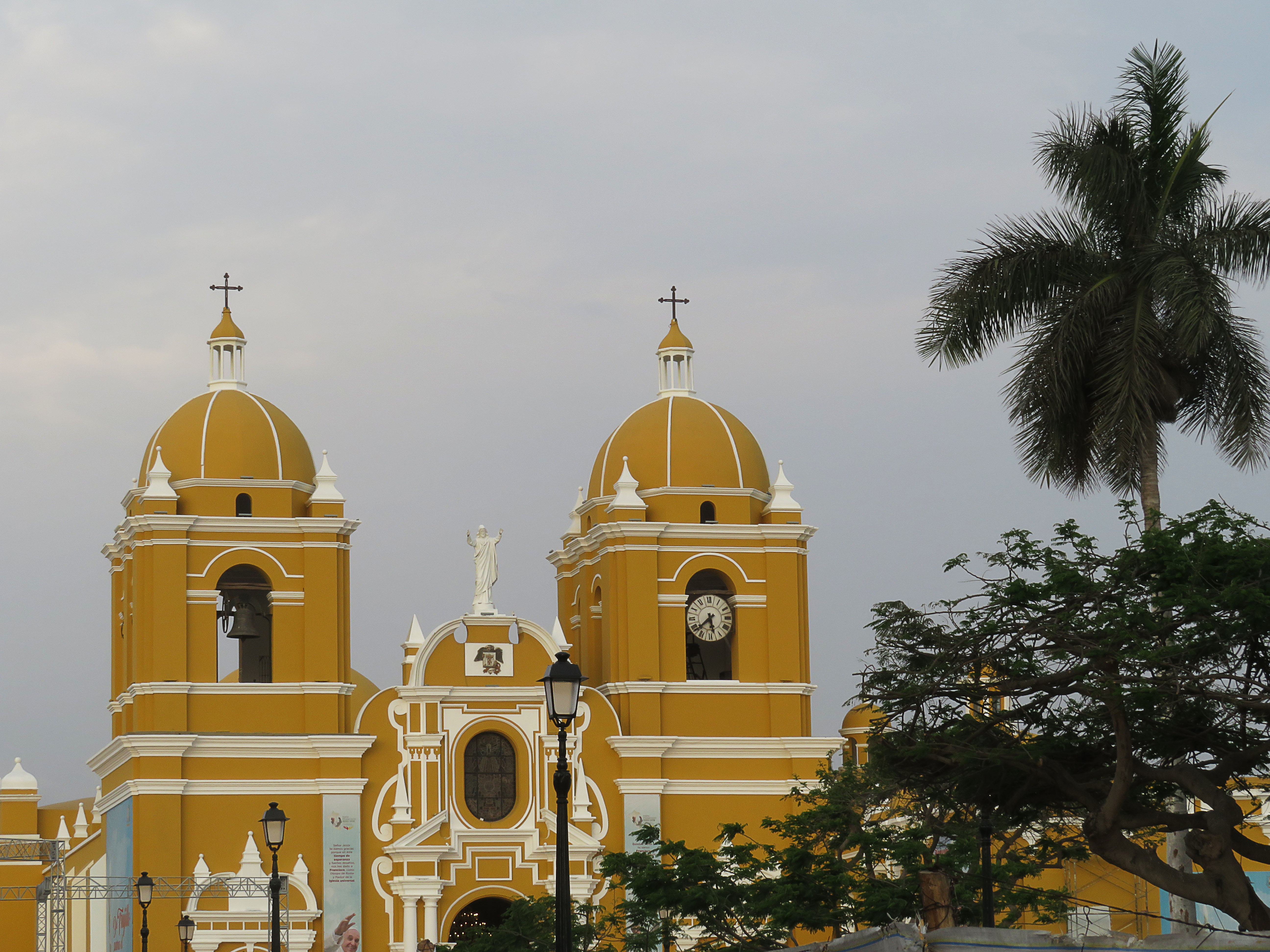 Trujillo est la deuxième grande ville du pays (presque 1 million d’habitants). Son centre-ville est plutôt agréable avec sa traditionnelle plaza de armas et ses rues agrémentées de bâtiments aux belles façades coloniales. La ville est toujours animée mais lors de notre passage c’est l’effervescence totale car on est à moins de 10 jours de l’arrivée du Papa Francisco ! Ca s’agite dans tous les sens : pour l’occasion on refait les routes, les façades, on réaménage la Plaza de armas, et on vend des t-shirt à l’effigie du Pape.