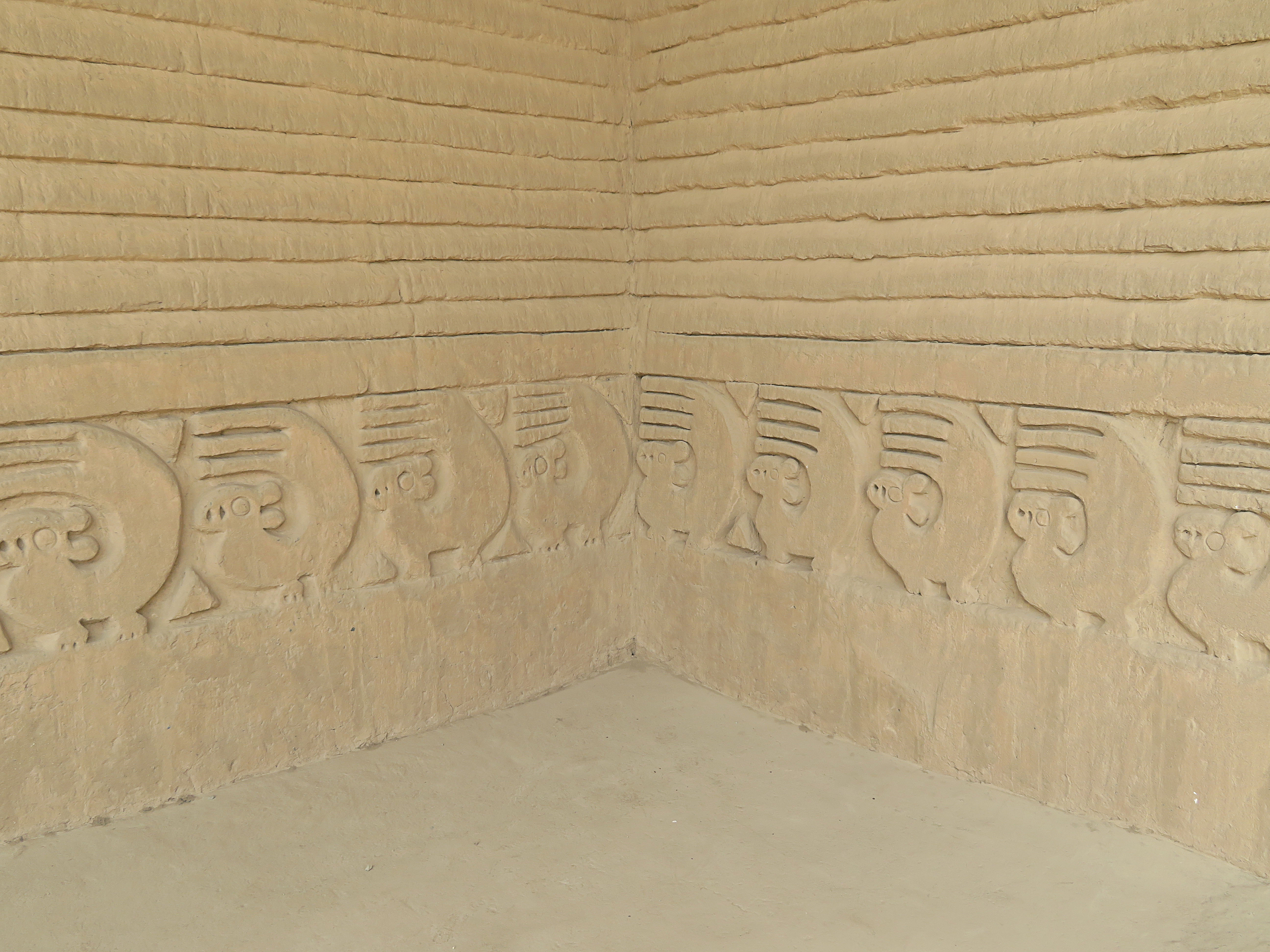 A la suite des indiens Moche, ce sont les Chimu qui ont régnés sur la côte Nord du Pérou, jusqu’à ce que les Incas les délogent au 15ème siècle (mais pas pour longtemps puisque les Espagnols sont arrivés dans la foulée). A quelques kilomètres au Nord de Trujillo, les Chimus ont construits une vaste cité où ont été identifiés une dizaine de palais fait d’adobes. Il semble que chaque souverain ait fait construire le sien, pour y vivre et y régner puis pour y être enterré, le palais étant alors abandonné. A l’heure actuelle, un seul palais se visite. On vous conseille d’opter pour la visite guidée, intéressante, en particulier pour les explications sur le sens des bas reliefs, car il n’y a aucun panneau explicatif, et il est difficile de s’y retrouver tout seul.