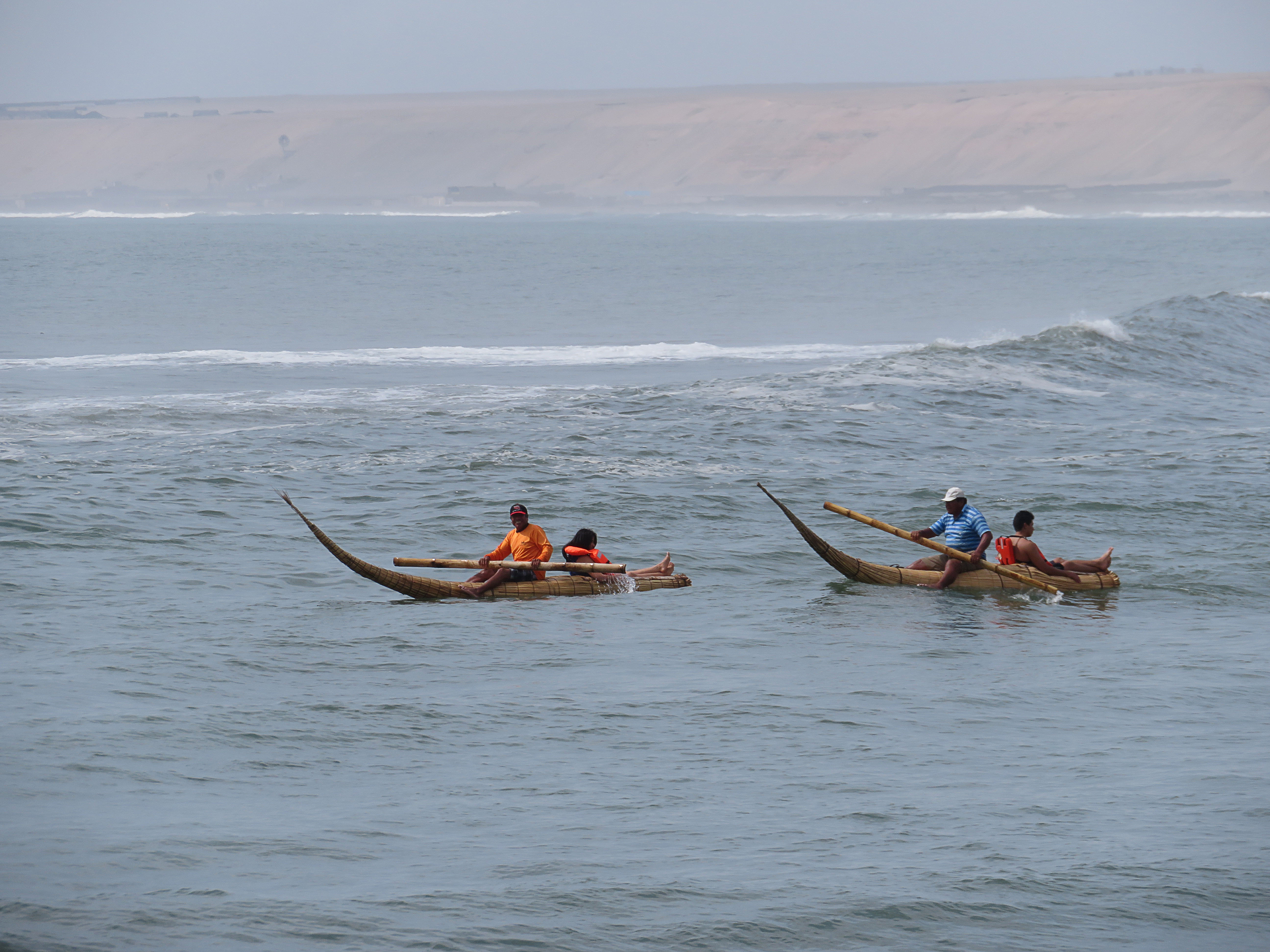 Dans la foulée de la visite de Chan chan, on poursuit par un petit tour à Huanchaco qui se trouve quelques kilomètres plus loin sur la même route. La plage est prisée des habitants de Trujillo qui s’y rendent pour la journée. C’est plus un spot de surf que de baignade car la mer est bien agitée et l’eau assez fraîche mais l’endroit est quand même idéal pour déguster un bon ceviche les pieds dans le sable ! Autre curiosité, on peut observer ici les bateaux traditionnels en roseaux servant à la pêche et qui n’ont jamais cessé d’être fabriqués depuis des siècles. Ils ressemblent beaucoup à ceux utilisés sur le lac Titicaca à l’autre bout du pays, mais ici c’est à l’océan Pacifique qu’ils se confrontent, et non aux eaux calmes du lac !