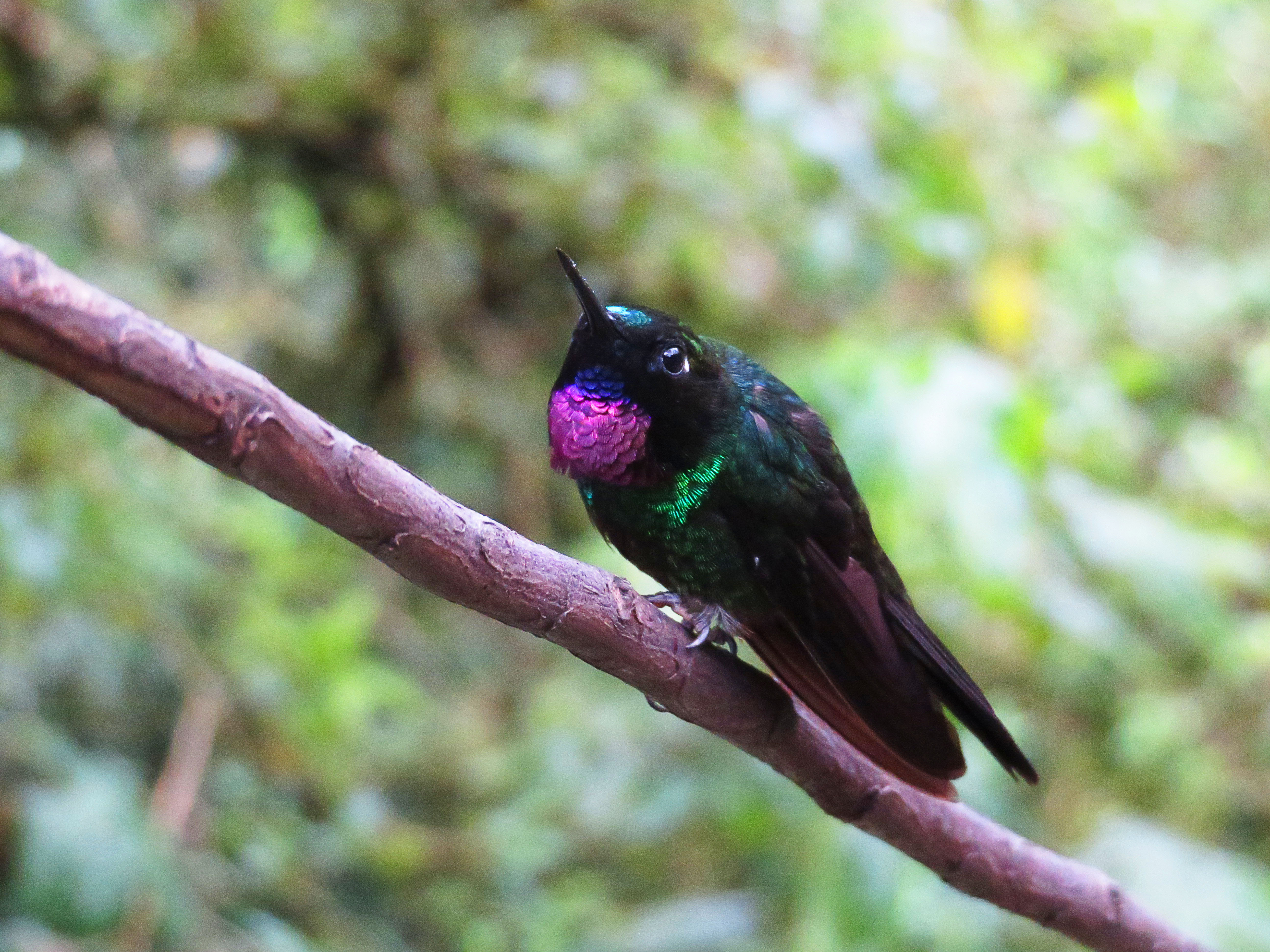 Au cour de la rando on peut voir des colibris qui batifolent dans la forêt. On fait d’ailleurs un détour par la Casa de los Colibries, en fait une cabane installée dans un coin où il y en a beaucoup ; là on en voit pas mal de très près, car tout en étant en liberté ils sont attirés par l’eau sucrée mise à leur disposition. Il y en a une dizaine, de pleins de couleurs différentes, qui passent et repassent à toute vitesse ; ils battent des ailes tellement vite qu’ils peuvent faire du sur-place, c’est assez cool à voir (mais beaucoup plus difficile à prendre en photo !)