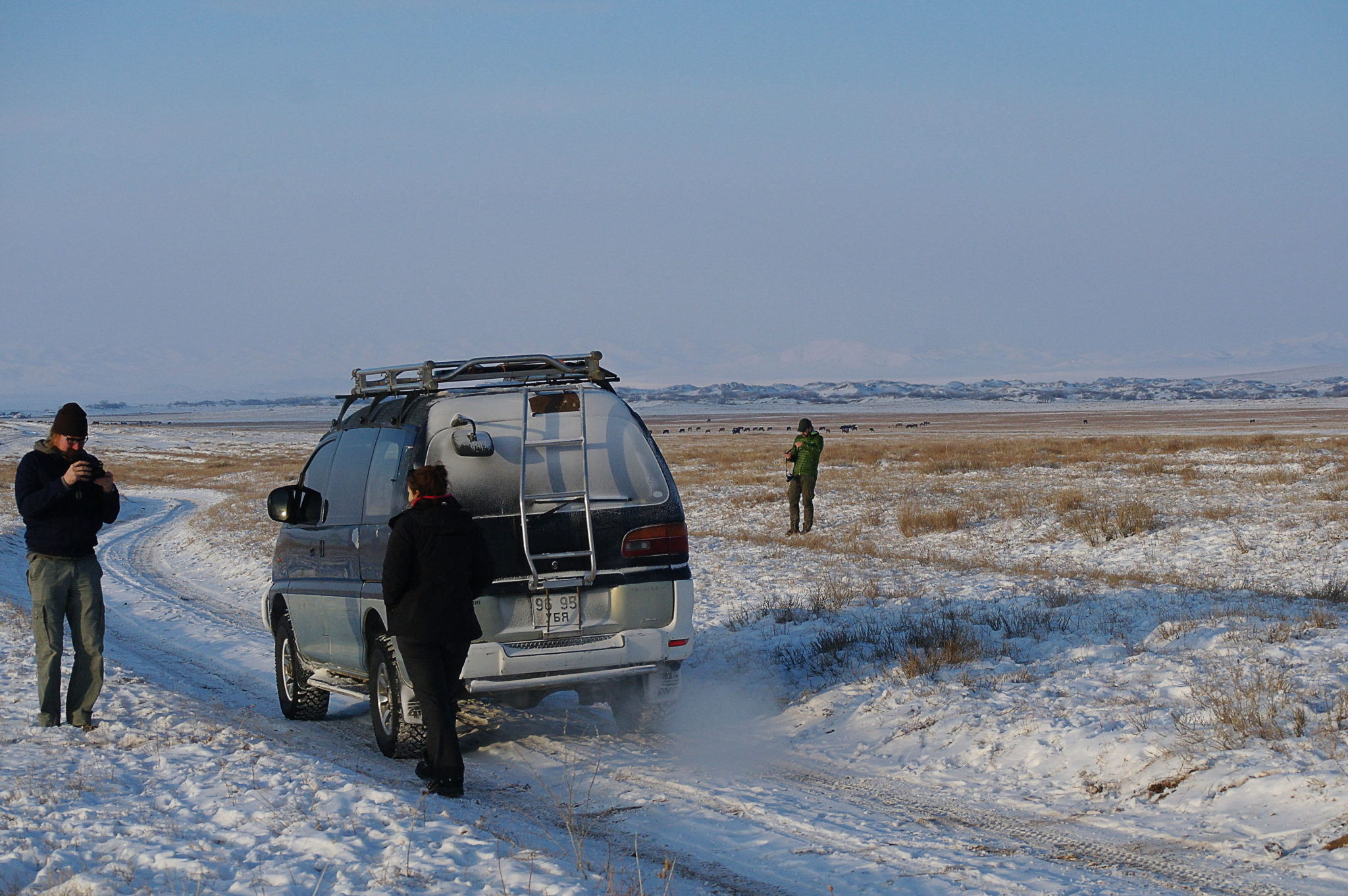 On décide de sortir d’Oulan Bator et d’aller faire un tour dans les steppes pendant quelques jours. Il n’est pas vraiment envisageable de louer une voiture par nous même compte tenu de la météo, et on s’embarque donc pour un circuit proposé par notre AJ, en compagnie de Jukka, de Francisco (voyageur barcelonais rencontré à l’AJ), et de Sonio qui sera notre guide et chauffeur pendant ces trois jours.