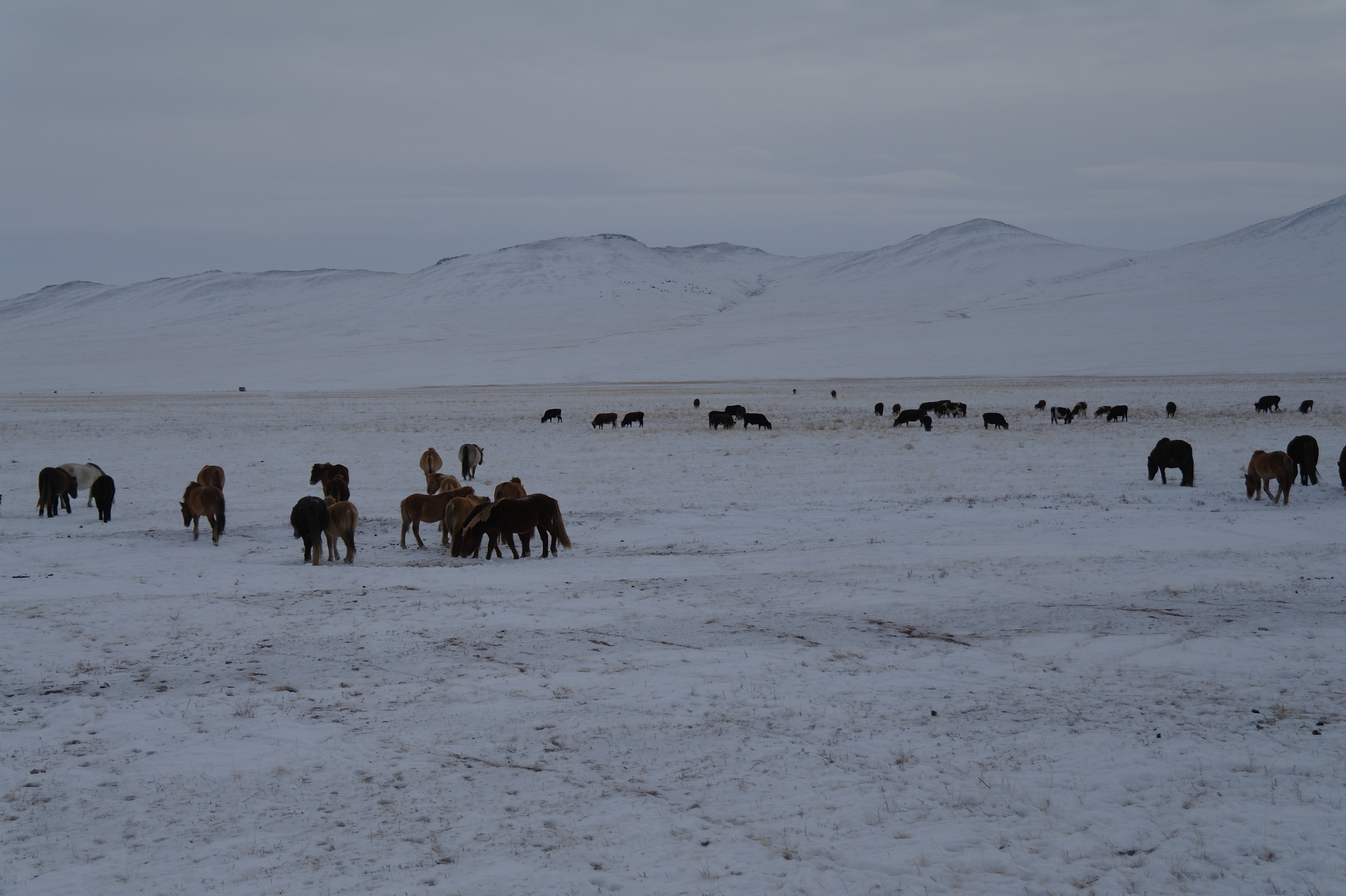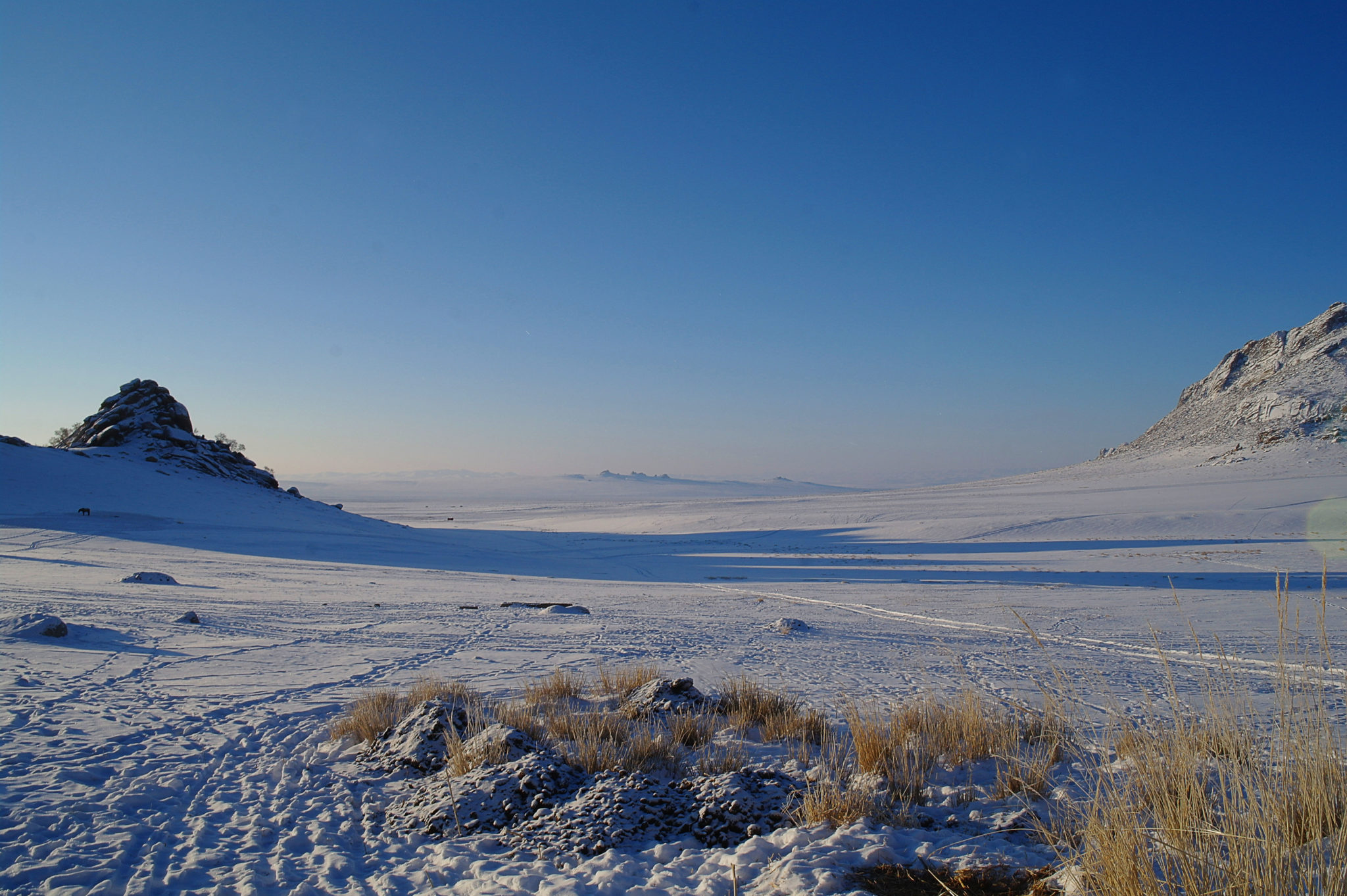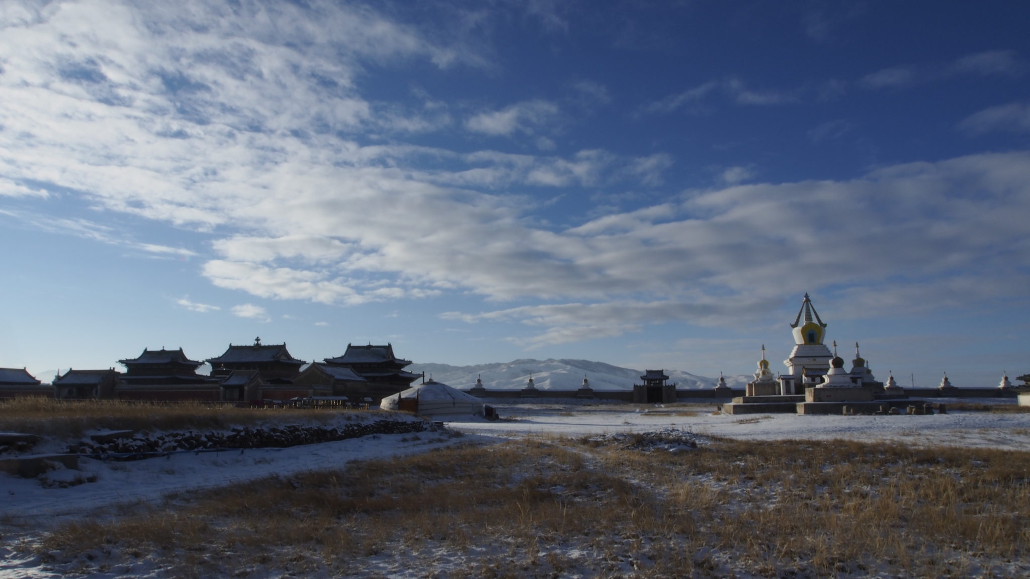 But du voyage : la ville de Kharakhorum, ancienne capitale de Gengis Kahn dans les années 1220. Il n’en reste pas grand-chose, mais pour nous, l’intérêt de l’excursion tient surtout à la découverte des grands espaces de la Mongolie. On traverse de vastes étendues de steppes (enneigées, entourées de montagnes).
