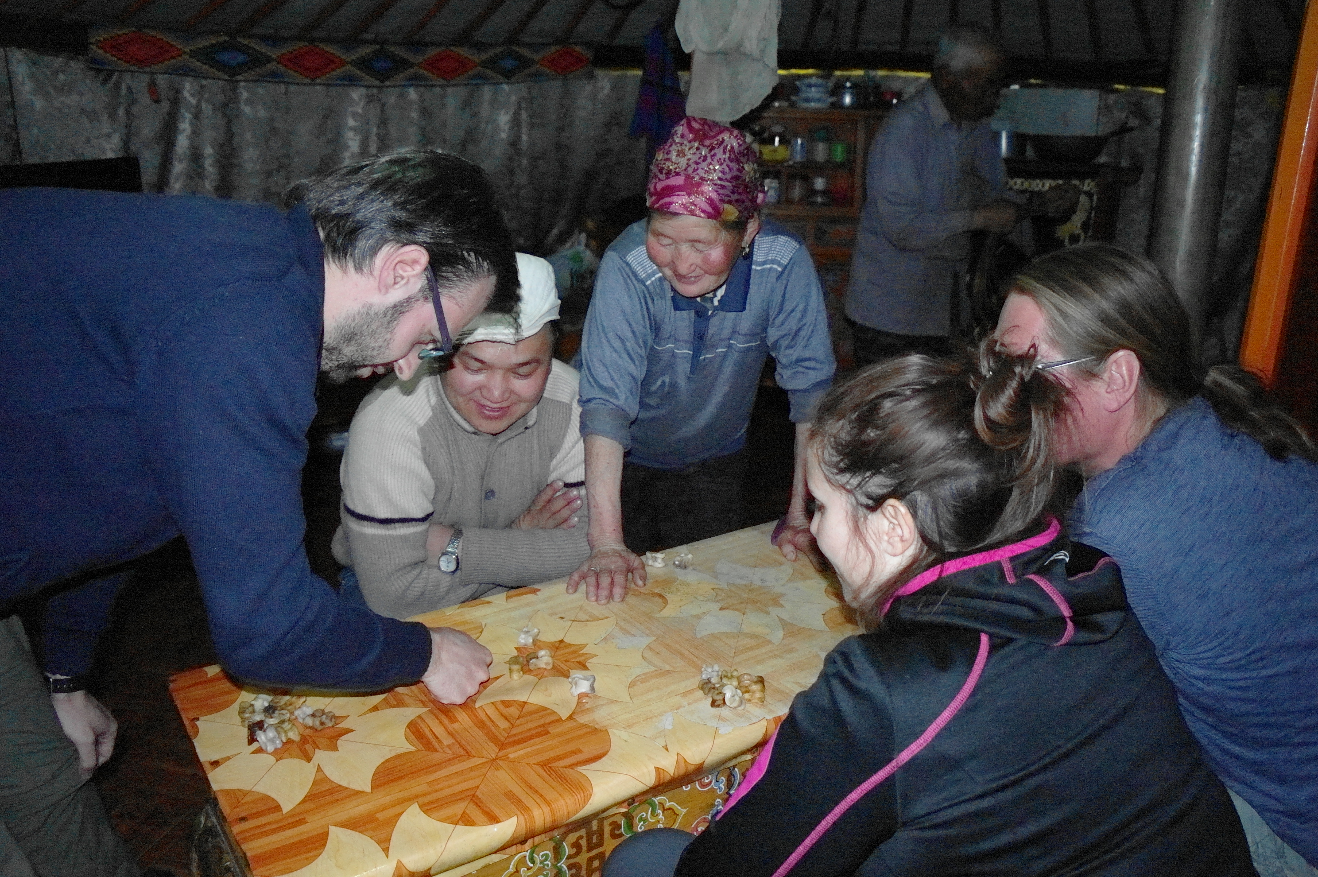 Sans être véritablement confortable, la Yourte est agréable, il y fait chaud grâce au bon poêle qui trône au milieu de la pièce et que l’on alimente avec du bois et…. des bouses de vaches séchées (oui oui !!! Et ça brule très bien !! Et même que ça ne sent pas du tout !!). On passe une bonne soirée entre repas cuisiné sur le poêle de la Yourte et jeux locaux genre osselets.